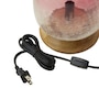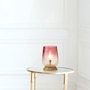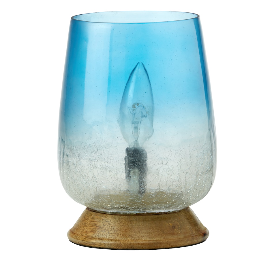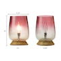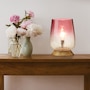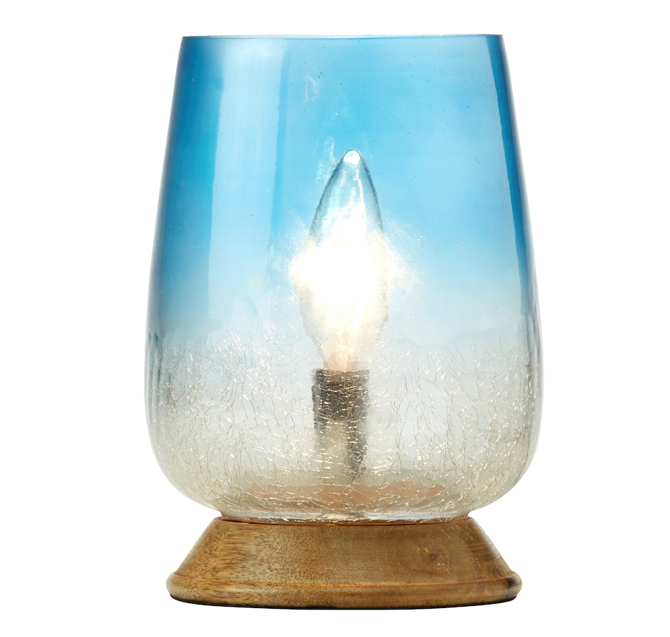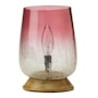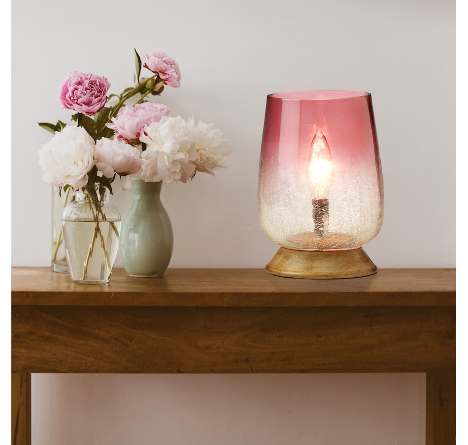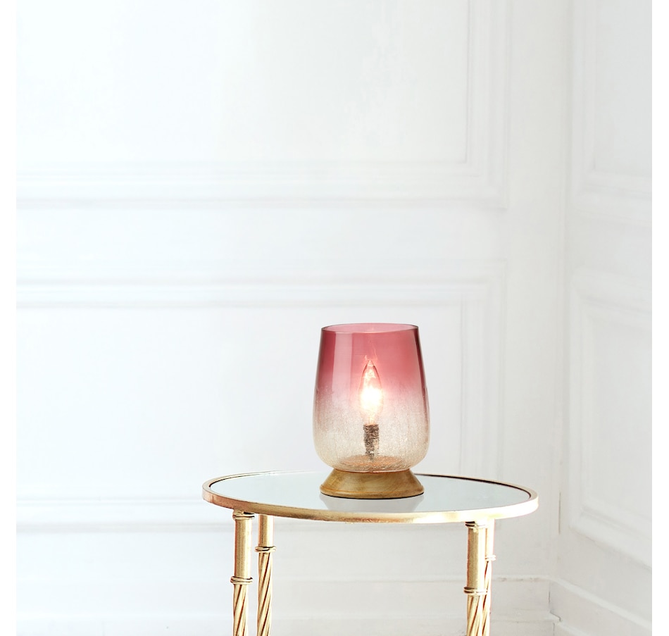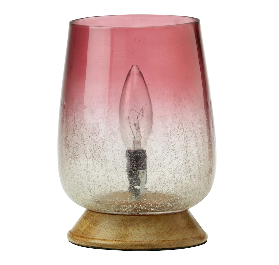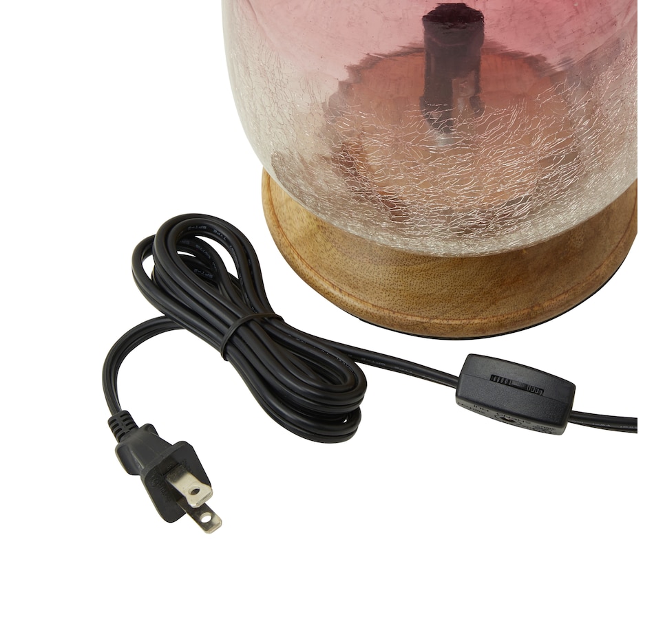 Illuminate your living space in style with this accent lamp. This novelty accent lamp showcases a cranberry and clear ombre-effect hand-blown glass shade for a modern vibe, and has a brown wood block base in a satin finish. The glass shade also features a crackle effect. Great for placing on a console or side table in your living room, bedroom or entryway, this lamp also comes with an in-line switch for easy on/off, and it requires one 15-watt Type-B bulb (not included) to cast its warm glow.