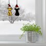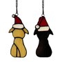 Whether you use them as wonderful additions to your own holiday décor or give them as stocking stuffers to the dog lover in your life, this pair of precious puppies is sure to put a smile on anyone's face. Collectively made from 19 individual cuts of textured, Tiffany-style stained glass, both the black and tan dog-shaped ornaments feature whimsical red Santa hats with white pompoms. Each stained-glass ornament is just over five inches high, and can be hung securely from its included 11.75-inch metal chain. Hang them in a window to allow the sunlight to stream through, or on your Christmas tree as part of the holiday trim!