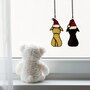 • Tiffany-style textured stained-glass: two pups in holiday hats