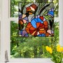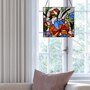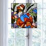 Watch as the magic of a sunbeam brings this 14-inch multicolour stained-glass flower window panel to life in a host of vivid colours. This unique stained-glass portrait of stunning garden blooms is made with 115 individual glass cuts of red, blue, purple and green hues set against a translucent background of Tiffany-style glass. You can immediately hang this unique and charming piece of stained-glass art in your living room, kitchen or sunroom, thanks to the metal link chain atop the square glass iron frame. Just be sure to place it in a sunny window to see its colours gleam and grow bright as it catches the light!