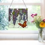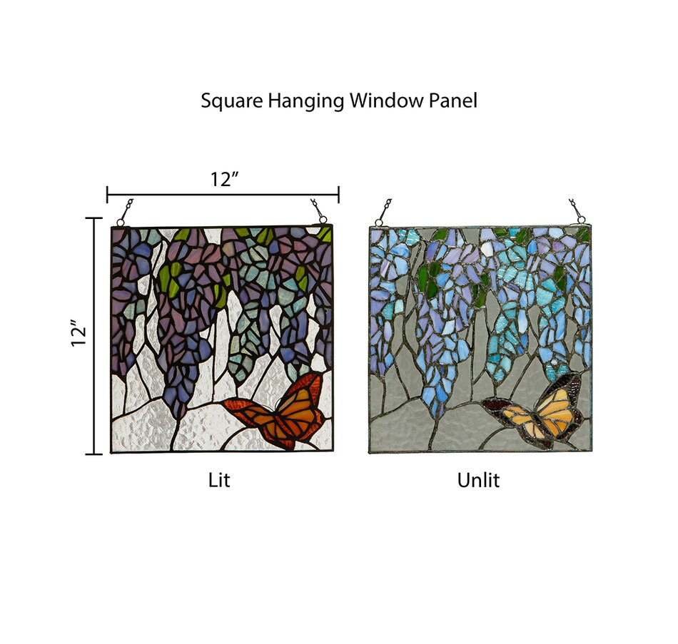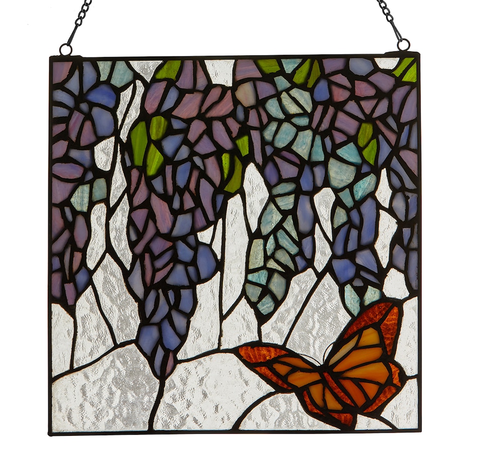 This nature-inspired floral stained-glass suncatcher window panel makes a lovely addition to your farmhouse, cottage or French country style home décor. It showcases wisteria flowers in different hues of purple, green and blue behind a lovely orange monarch butterfly, and it's also easy to hang, so you can arrange it in any sunny window to fill your space with beautiful purple light!