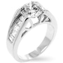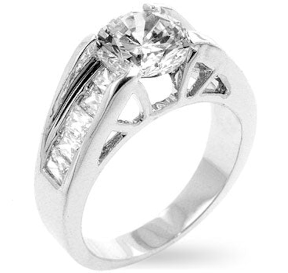An ensemble of baguettes elegantly hoist a brilliant 7 mm center stone atop your finger. Our genuine finish is achieved using an electroplating process that coats the item with heavy layers of a close cousin to platinum which gives our jewelry a platinum luster.
