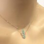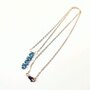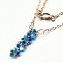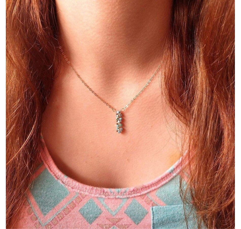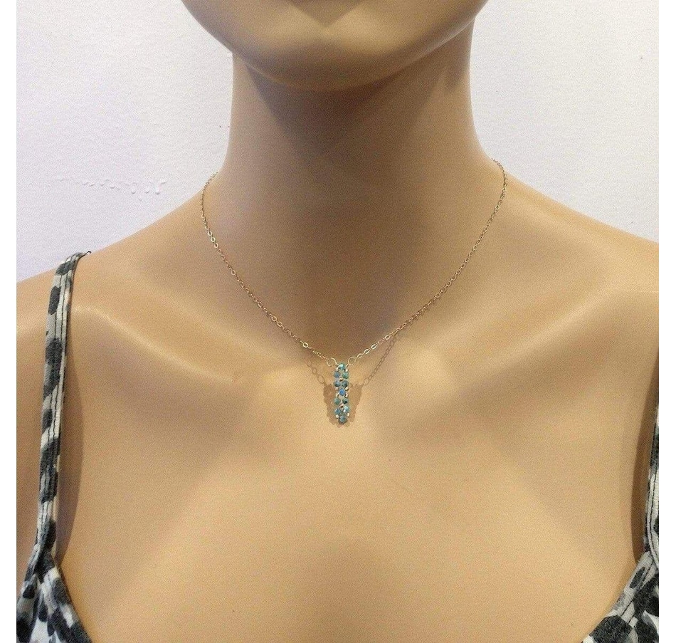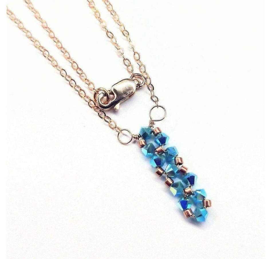 This exquisite and delicate handmade necklace, the Tiny Super Sparkly Rock Candy Crystal Bar Necklace, dazzles with 11 Turquoise ABx2 Swarovski Bicones carefully woven with 14 kt rose gold-filled wire into a petite vertical pendant. The bicones' shimmering facets effortlessly capture and reflect light, while the vertically placed pendant hangs gracefully from a 14 kt rose gold-filled cable chain. At 18 inches long, this necklace is secured with a lobster clasp closure, making it both dainty and durable.Unique Wire Bead weave designAll metal components are 14kt rose gold-filledsuper sparkly double-coated  turquoise Swarovski Biconeslength of the vertical pendant is 7/8 incheswidth of the pendant is 1/4 inchesNecklace length is 18 inches Handmade in Montana