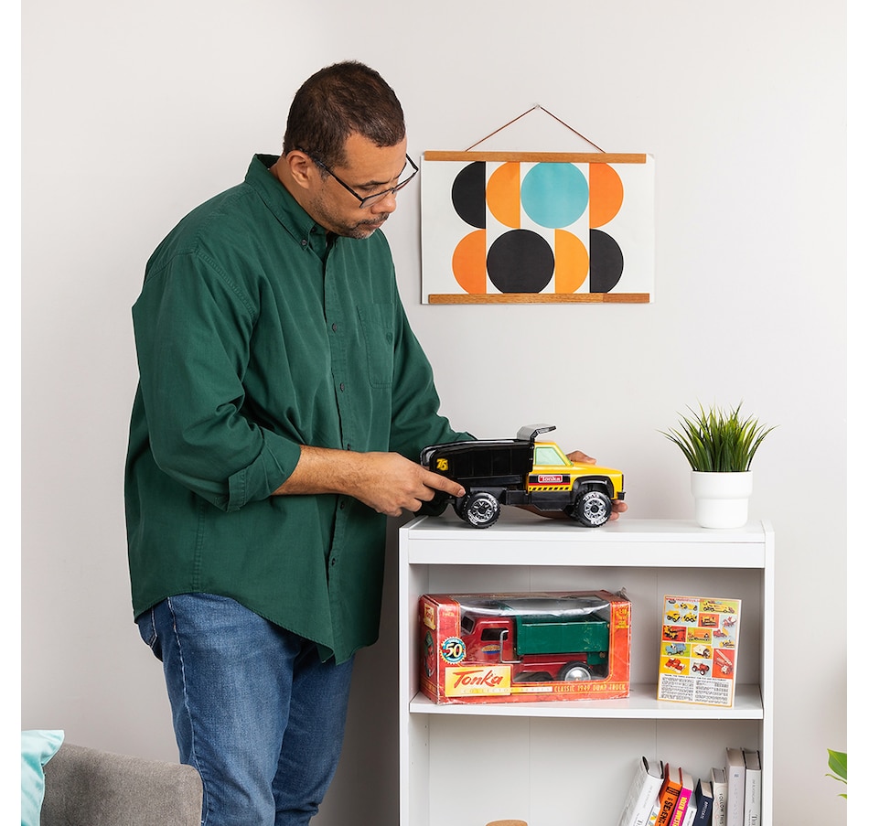 This steel classics commemorative 1994 quarry dump truck features a 75th anniversary logo on the dump bed in honour of Tonka. It also features a special 75th anniversary displayable tray.  This 13" long truck is built with real cold-rolled steel. It's Tonka tough and made to last!  It also features an articulated truck bed-to-load, haul-then-tilt to dump sand, rocks, or anything else aspiring builders imagine. This truck is perfect for Tonka fans and for ages 3 years and up.