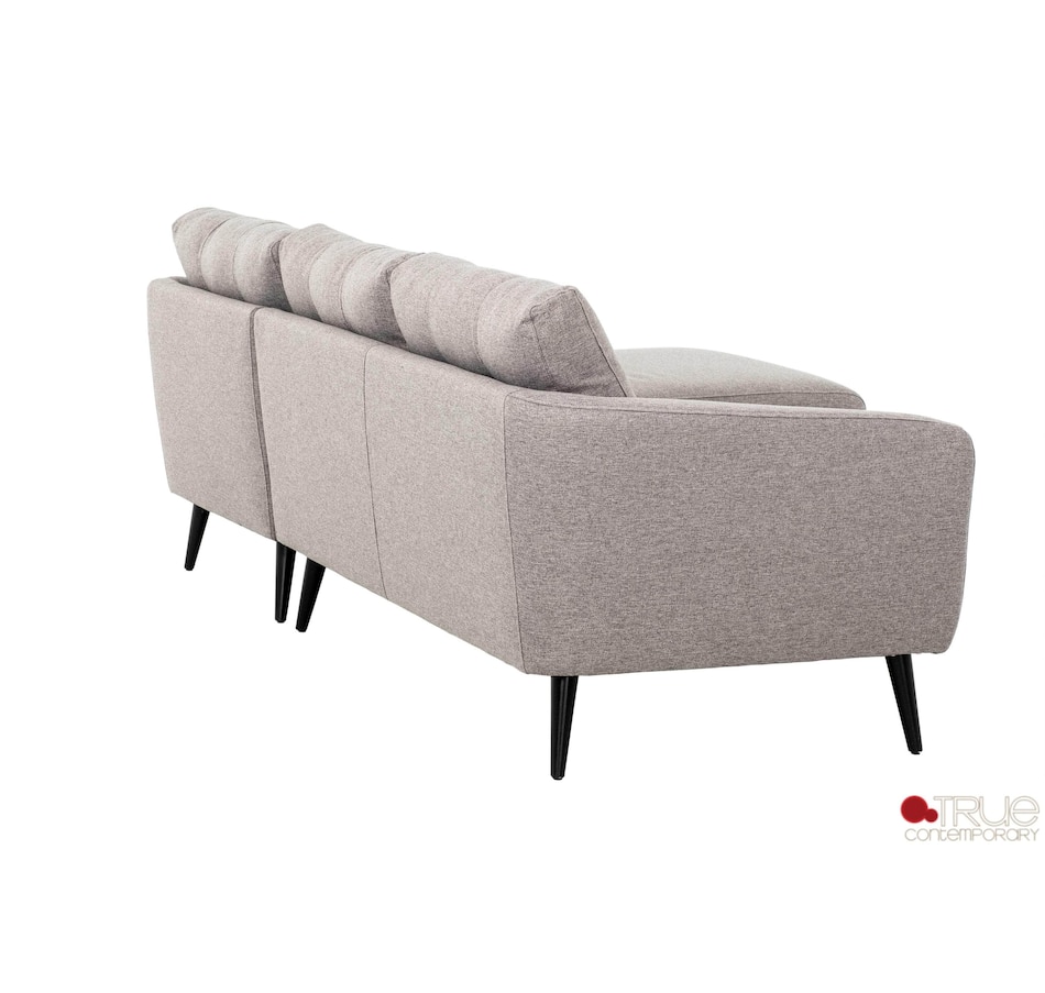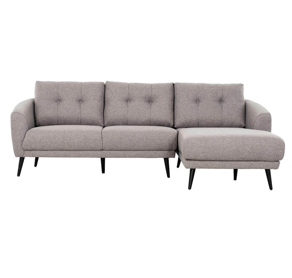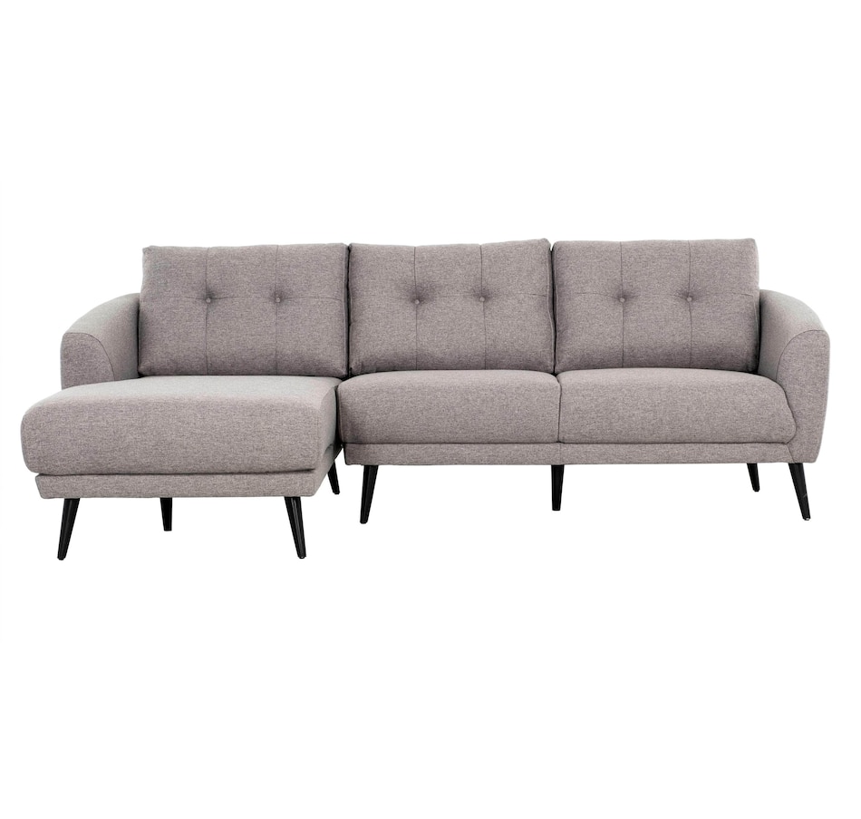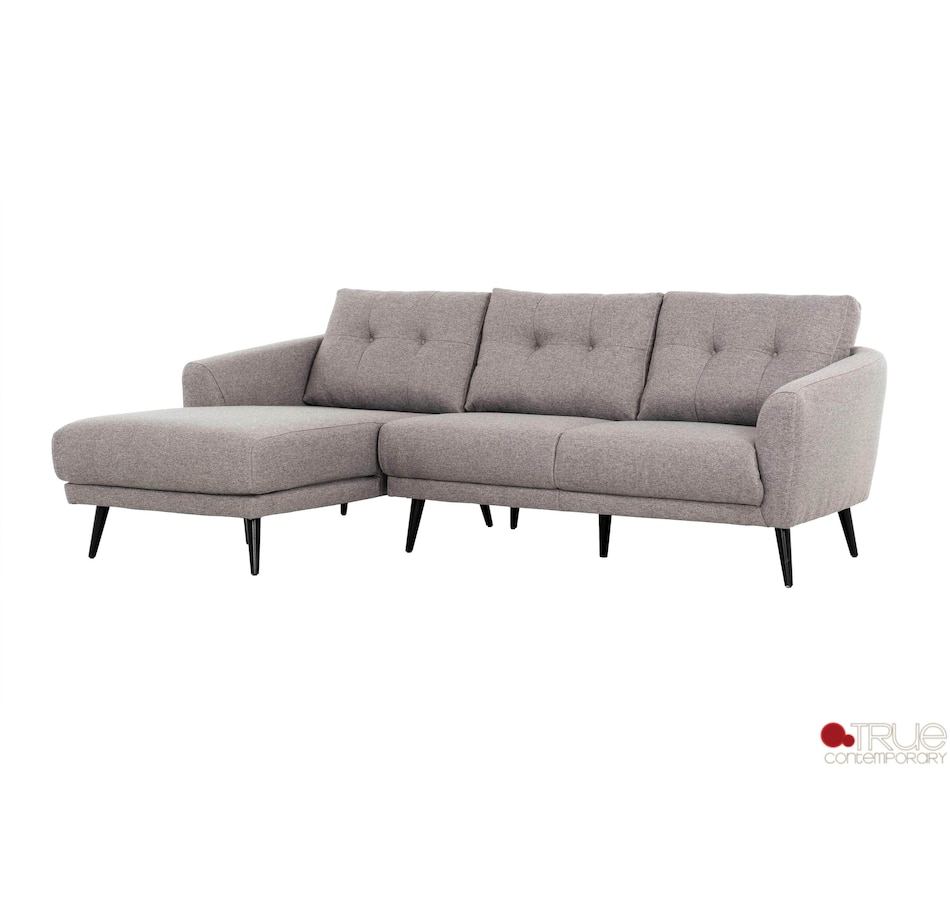 Upgrade your living space with the Elizabeth Sectional Sofa in Nia Grey - a stylish and comfortable addition to any home. The contemporary design of this sofa is highlighted by its grey fabric upholstery, wooden legs, and removeable tufted back cushions. The pocket coils and foam construction provide a supportive and comfortable seat, while the sturdy pine and plywood frame ensures durability and longevity. This sectional sofa is available in a right facing chaise or left facing chaise configuration, allowing you to choose the best fit for your space. Whether you're entertaining guests or lounging at home, this sectional sofa is the perfect choice for any occasion. So, don't wait any longer, add this stylish and comfortable sectional sofa to your home today!