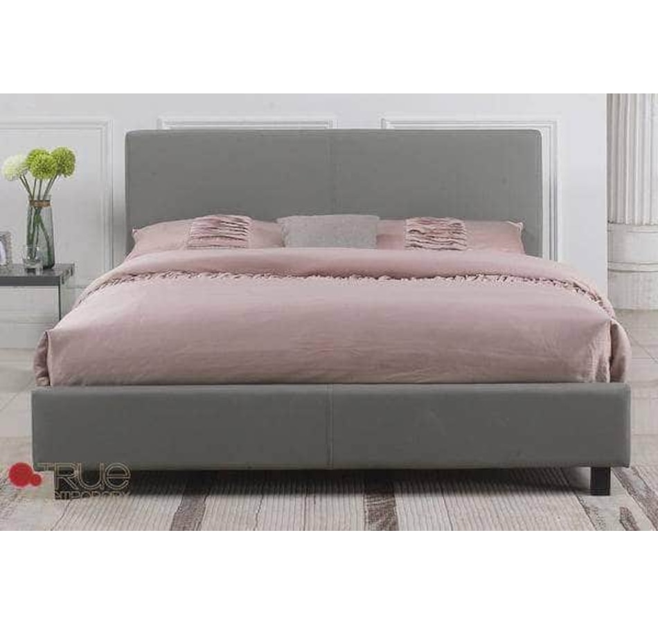 Sleek and modern in design, the Mirabel Grey Faux Leather Platform Bed by True Contemporary features a faux leather upholstered frame in an elegant grey accented with double baseball stitching, and supported by solid wood legs. This platform bed is low to the ground, and a box spring or foundation is not necessary for mattress support. The Mirabel is a stylish and affordable option for any bedroom.