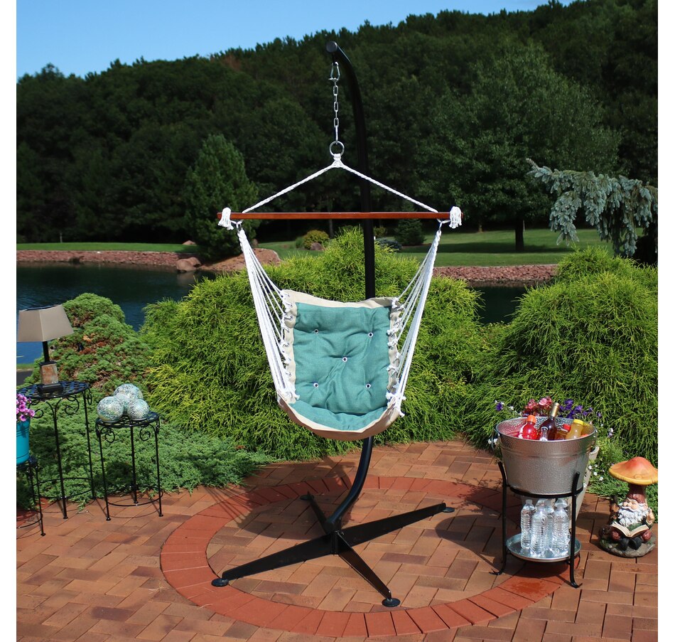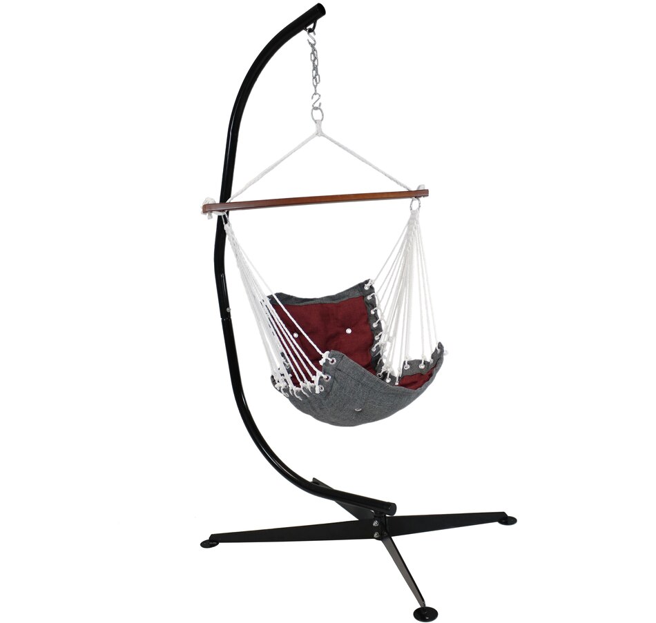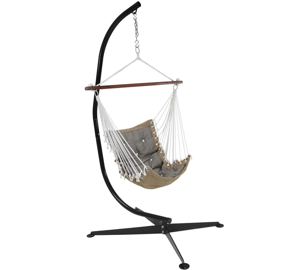 Give a bit of Victorian flair to any patio, yard, deck, front porch, sunroom, or any other outdoor space when using this hammock chair swing and included C-stand. The swing features a polyester cover and polyurethane foam filling, and polyester rope for style, convenience with easy maintenance, and a natural resistance to the outdoor elements. The hardwood spreader bar adds more natural style to uplift your outdoor area. The chair is lightweight and easy to hang so you can easily hang the rope from any tree, branch, ceiling hook, or the included C-stand to easily swing in relaxation and comfort. This hammock swing features white roping with dark and light gray seat backing to make this chair a fresh, easy, and beautiful accent to any patio, garden, yard, sunroom, bedroom, or other indoor or outdoor area. The stand features heavy-duty steel construction for strength and added durability when used outdoors.