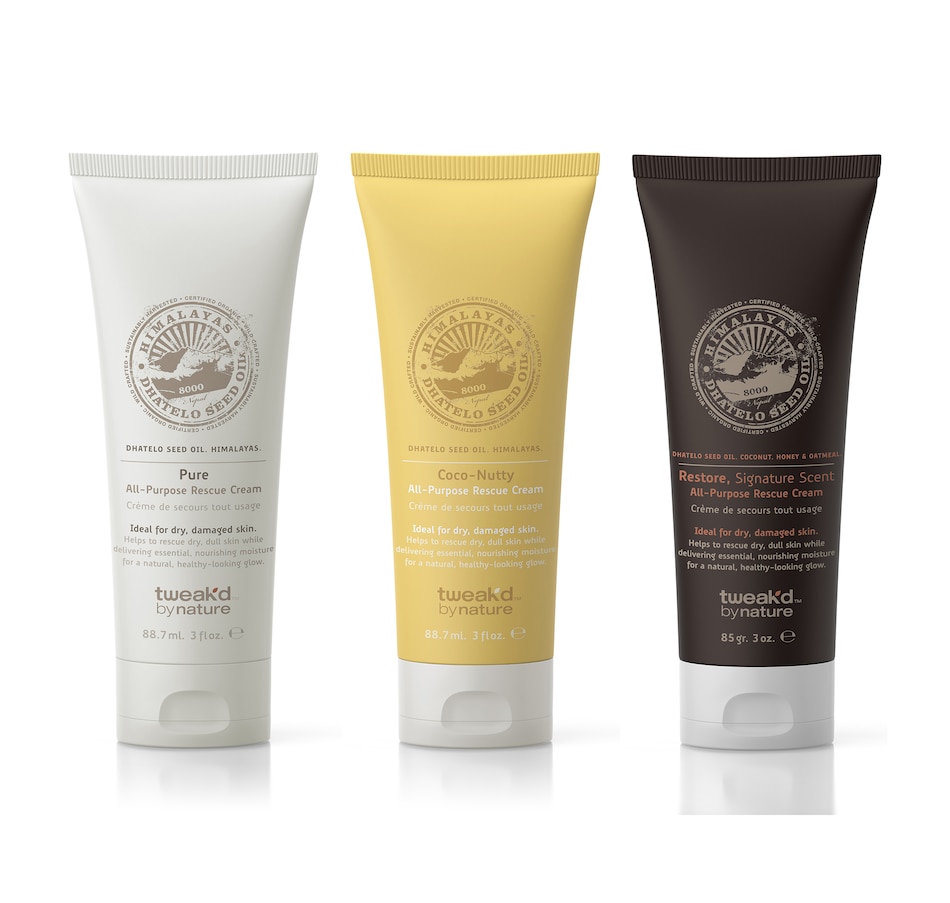 Receive an exclusive three-piece collection of tubes with two of Tweak'd Nature's core scents, Amber Vanilla and Pure F.F., plus a limited edition scent, Coco-Nutty, of the multi-tasking All-Purpose Rescue Creams.