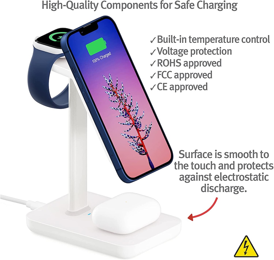 This compact three-in-one wirelss charger for the iPhone, Apple Watch and AirPods features a compact design that can help declutter your nightstand or desk and also can hold an iPhone upright to display alerts and apps.