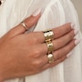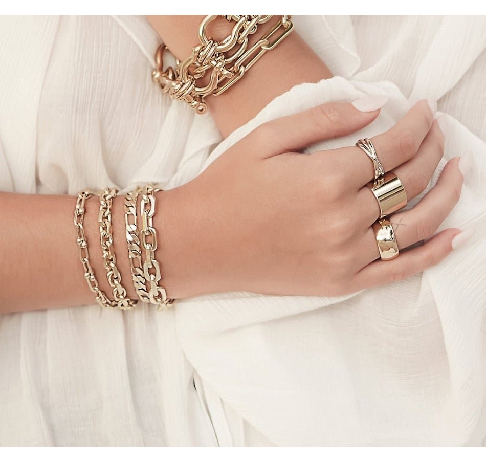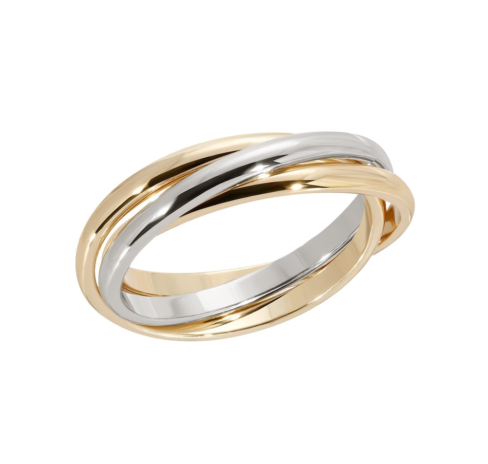 Our Two Toned Triple Domed Roll Ring is the perfect ring to wear alone or stack with our other ring options. Wear one for your everyday look or stack with others to make more of a statement. Please note that the ring is composed of three separate rings  that are permanently intertwined to create the “roll†effect. Material: Recycled BrassMeasurements: 3–2mm wide ringsPlating: 14k Gold or Rhodium (silver)All rings have a clear protective coating to prevent quick wear and tarnishing.Sizes available: 5, 6, 7, 8, 9, 10 & 11 Our jewelry is always handmade from sustainable materials in the USA.