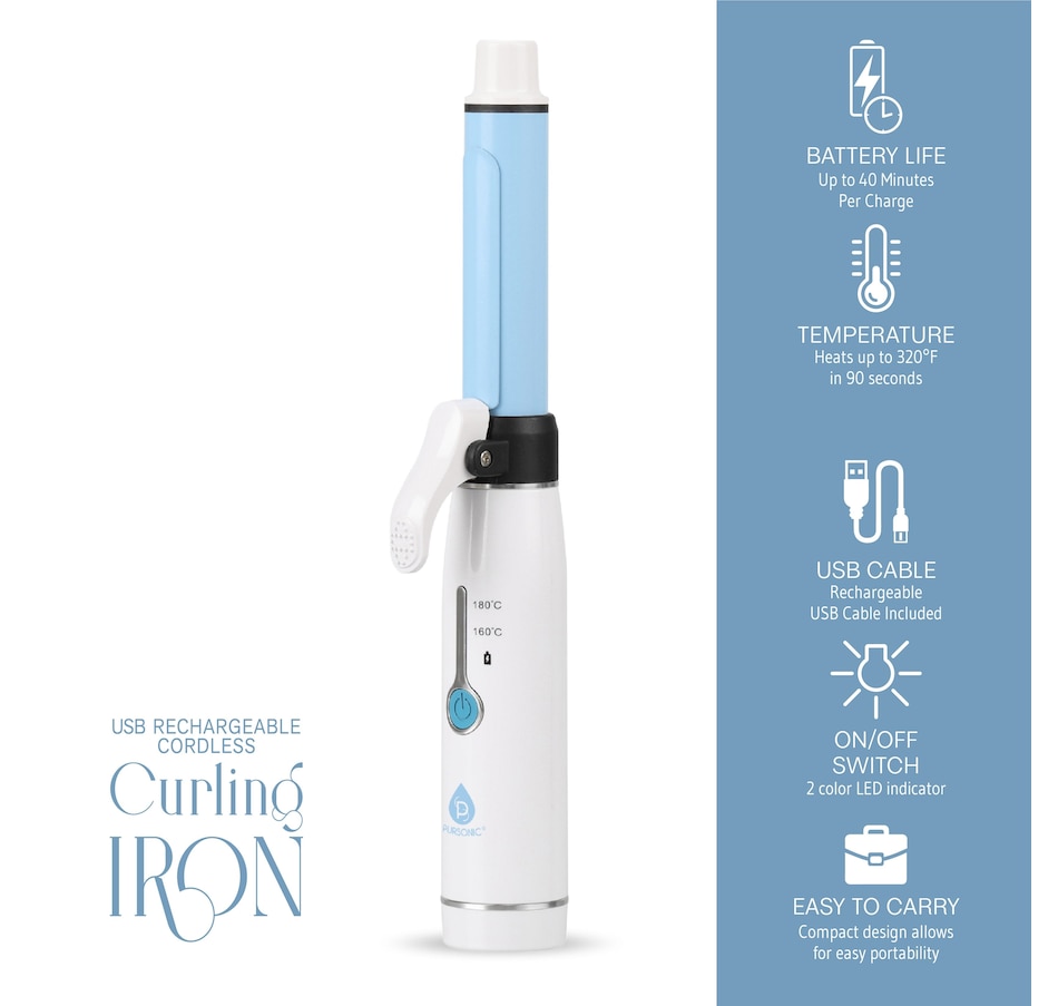 Say goodbye to annoying tangled cables and the hassle of finding a plug when styling your hair. Introducing the Pursonic USB Rechargeable Cordless Curling Iron, designed for ultimate convenience and portability.Key Features:Cordless and Portable: Enjoy the freedom of a cordless design with no more tangled cables. This compact curling iron is easy to carry in your bag, making it perfect for travel and on-the-go use.USB Rechargeable: Equipped with a built-in 2500mAh battery, this curling iron offers long continuous working time of up to 40 minutes after a full charge. Simply recharge via USB for a hassle-free experience.Ceramic Coated Heating Plate: The ceramic coated heating plate helps avoid pulling or damaging your hair while styling, ensuring smooth and shiny curls every time.Fast Heating: The small curling iron heats up to the lowest temperature within 3 seconds and heats even faster after a full charge. Get your desired curls quickly and efficiently.User-Friendly Design: Easy to operate, you can effortlessly design your hair at home with professional results. The compact and lightweight design makes it a convenient addition to your styling tools.Perfect for Travel: Compact size and USB rechargeable feature make it ideal for travel. Style your hair anytime, anywhere, without the need for a power outlet.Upgrade your hair styling routine with the Pursonic USB Rechargeable Cordless Curling Iron. Enjoy the convenience of cordless styling, fast heating, and a ceramic-coated plate for beautiful, damage-free curls. Perfect for home use and travel, this curling iron is a must-have for anyone looking to achieve gorgeous curls with ease.