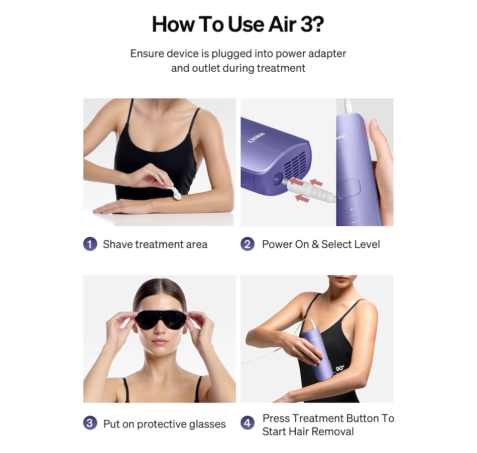 Experience salon-quality hair removal in the comfort of your home with the Ulike Air 3. Powered by advanced IPL technology and enhanced with Sapphire Ice-Cooling, it delivers a virtually painless treatment while reducing hair growth in as little as three weeks. Featuring three intensity modes for customized care, the Air 3 is FDA and Health Canada approved and safe for use on legs, arms, underarms, the face, and the bikini line. Its compact, ergonomic design makes it effortless to use, while 850,000 flashes ensure long-lasting performance. Achieve smooth, radiant skin with a device that combines clinical-grade results and intelligent skin safety in one elegant solution.
