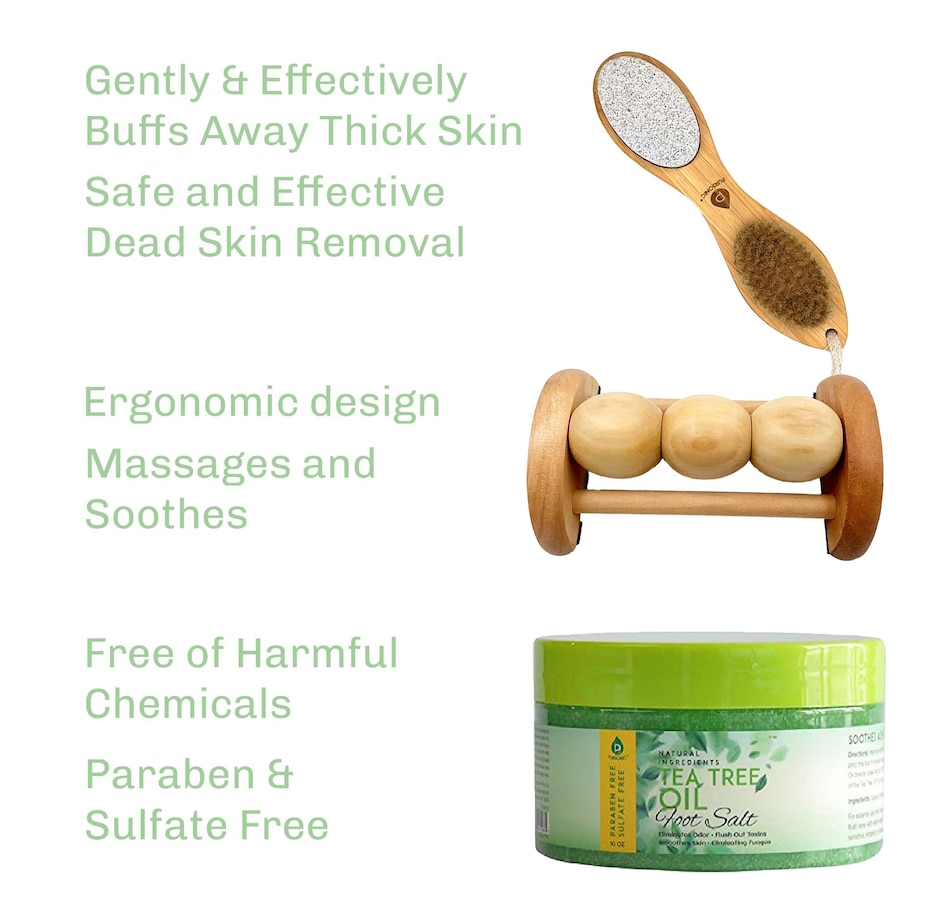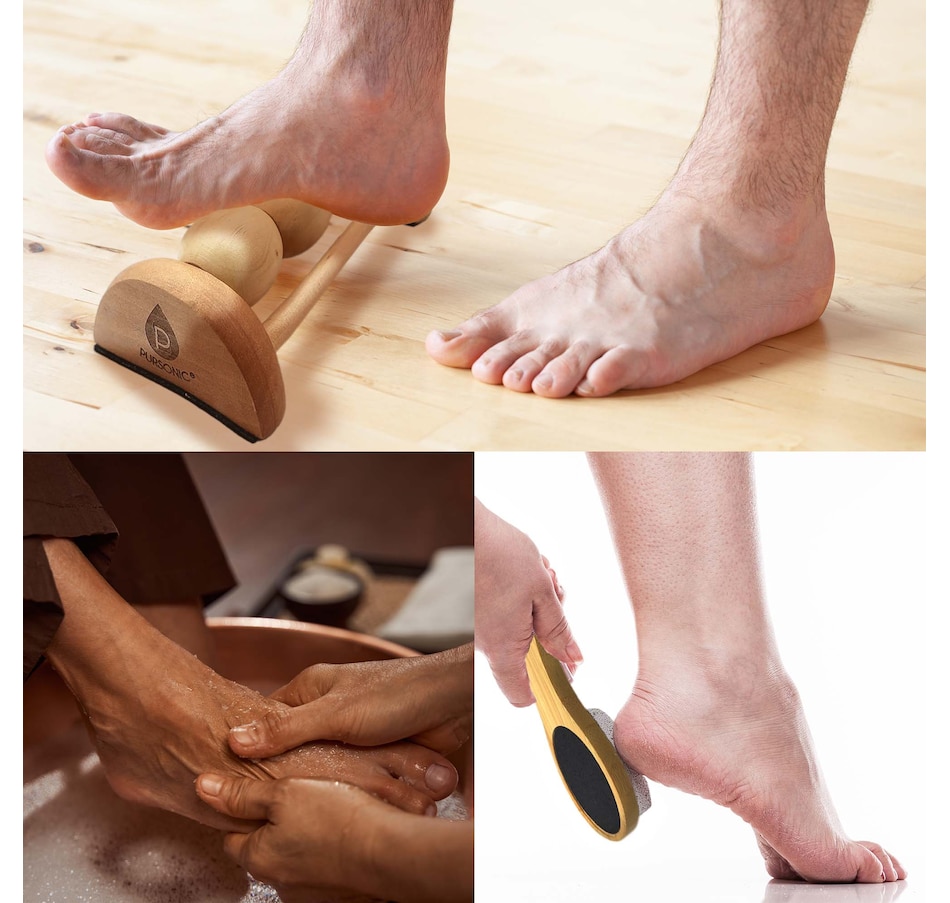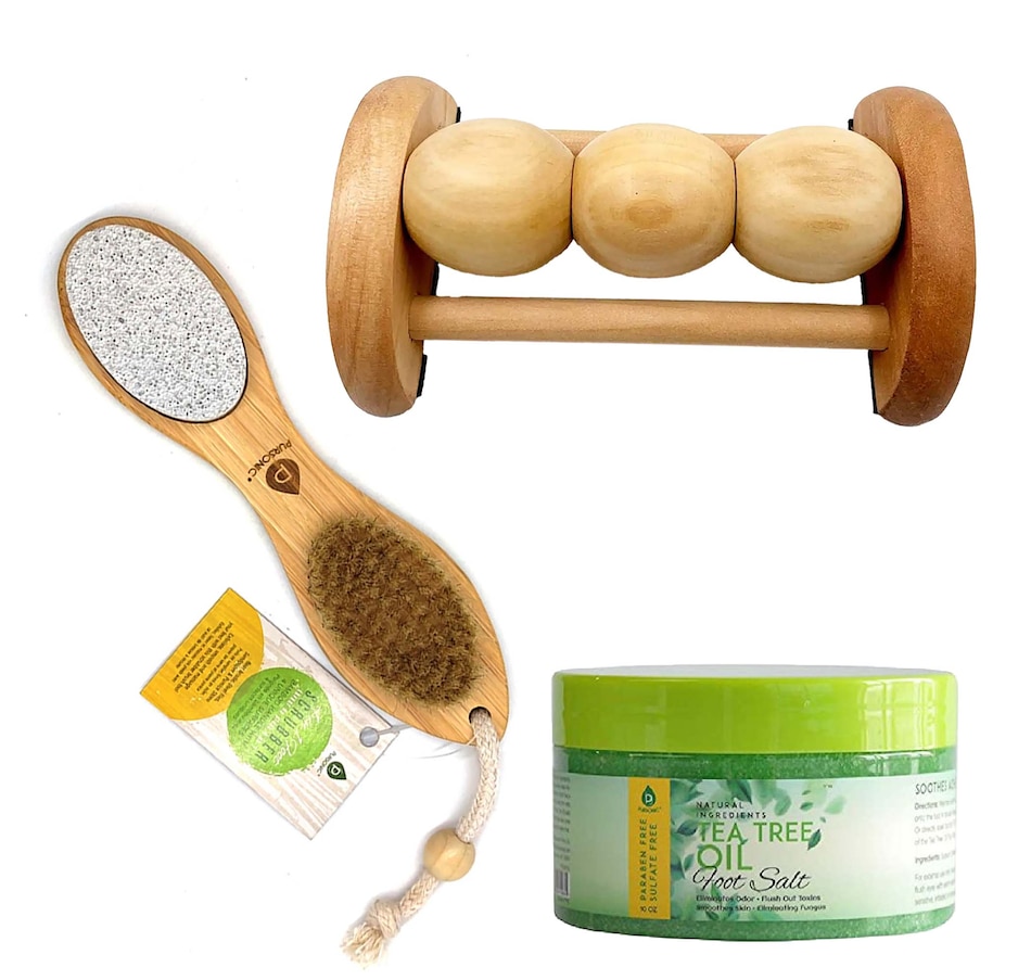 All Natural Wooden Foot Massager RollerEasy to take with you and set up anywhere, the Pursonic Wooden Foot Massager requires no electricity to effectively relieve tired, aching feet. Simply roll your soles over the rollers, which move independently for maximum effect.Features:FOOT THERAPY: Its Curved, ergonomic design fits comfortably into the arch of the foot, suitable even for high arches. Soothes pain, aches & soreness due to Plantar Fasciitis & ailments.ULTIMATE RELAXATION: Massages and soothes sore and tired feet. Rollers move independently for greater massage effect.CIRCULATION: With the use of our foot rollers, you can ensure proper circulation of the blood in your feet.HEALING: Can help treat Plantar Fasciitis.PORTABLE: Compact and portable, great for use at home, work, or on the go.4-in-1 Foot ScrubberWooden Handle with 4 unique surfaces: Boar bristle, Steel files, Sandpaper & Pumice stone.Features:100% Natural Bamboo.Exfoliate smooth and massage your feet with this scrubber brush tool.Comfortable lightweight bamboo handle.Tea Tree Oil Foot Salt 10 OzPursonic Tea Tree Oil Foot Soak With Epsom Salt helps soak away toenail fungus, athlete's foot & stubborn foot odor, softens calluses & soothes sore tired feet.Features:Tea Tree Oil Foot Soak is free of harmful chemicals.Rejuvenate tired, sore muscles after an exhausting workout. Get rid of foot odor or athlete's foot commonly associated with an active lifestyle or excessive sweating.Excellent Nighttime Soak After a long day at Work. Use Before Bed To Help Ease Foot Discomfort – Leave Feet Feeling Clean and Healthy.Paraben & Sulfate Free.Experience the ultimate foot care solution with our Ultimate Foot Care Bundle. From relieving tired, aching feet to exfoliating and soothing soreness, this bundle offers everything you need for luxurious foot pampering. Treat yourself or gift it to a loved one for the perfect at-home spa experience.