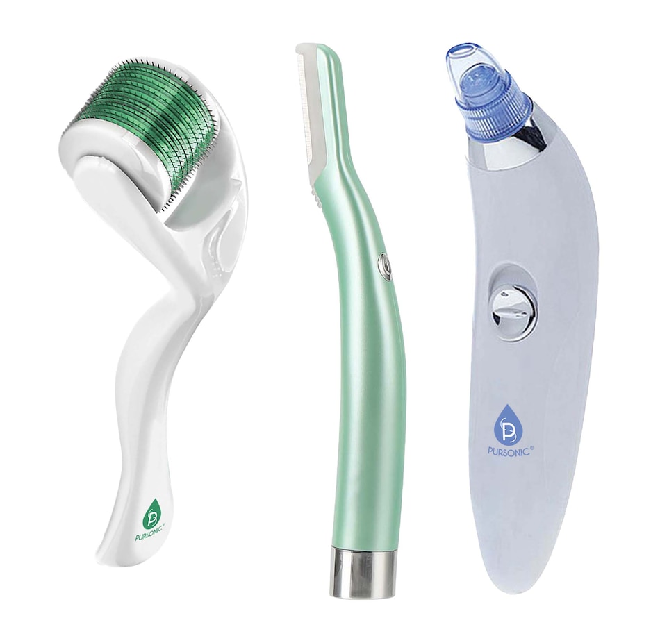 Transform your skincare routine with the Pursonic Ultimate Skin Smoothing & Rejuvenation Kit, a comprehensive set designed to leave your skin looking and feeling flawless. This powerful trio combines tools for gentle exfoliation, blackhead removal, and collagen stimulation to bring out your skin’s natural glow. Perfect for anyone seeking smoother, more radiant skin at home.What’s Included:Precision Dermaplaning Hair Remover ToolPrecision Razors for Smooth Results: High-quality, sharp blades easily remove peach fuzz and fine hair, creating a smooth, even surface without irritation.Improves Skin Texture: Gently exfoliates dead skin cells, revealing a brighter complexion and making makeup application smoother and skincare products more effective.Portable and Ergonomic: Designed with a compact, easy-to-use handle, making it perfect for precise hair removal and exfoliation at home or on the go.Simple Steps for Radiant Skin: Cleanse, glide at a 45-degree angle, and follow up with moisturizer to reveal fresh, polished skin.Pursonic Pore Vacuum Blackhead Remover with 4 Replaceable Suction HeadsDeep Cleansing Power: Uses advanced suction technology to remove blackheads, whiteheads, and impurities from deep within your pores.Customizable Suction Levels & Heads: Four replaceable heads allow for targeted treatment on various skin types and areas, ensuring effective and gentle cleansing.Ideal for Clear, Blemish-Free Skin: Regular use helps reduce blackheads and clogged pores, leaving your skin feeling cleaner and looking smoother.Pursonic Micro Needle Derma Roller (0.5mm)Stimulates Skin Renewal: With 0.5mm micro-needles, this derma roller gently stimulates collagen production and encourages cell turnover, helping reduce the appearance of fine lines, wrinkles, and pores.Improves Skin Tone & Texture: Regular use promotes a fresh, youthful glow while helping to minimize blemishes, age spots, and uneven skin tone.Boosts Skincare Absorption: Prepares skin to absorb serums and moisturizers more effectively, maximizing their benefits.Why Choose the Pursonic Ultimate Skin Smoothing & Rejuvenation Kit?This all-in-one bundle delivers professional-grade skincare tools designed to target key skin concerns, from removing fine hair to clearing pores and rejuvenating your complexion. Together, these tools work synergistically to give you smoother, brighter, and more youthful-looking skin.Unleash your skin’s potential with the Pursonic Ultimate Skin Smoothing & Rejuvenation Kit—a perfect gift or addition to your skincare collection!