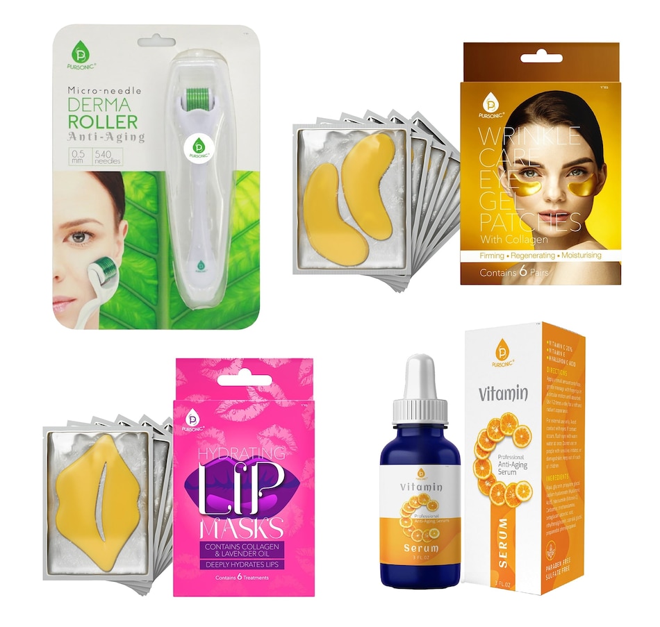 Elevate your skincare routine with our Ultimate Skincare Bundle, featuring essential products designed to rejuvenate and revitalize your skin from head to toe.1. Vitamin C Serum (3 fl. oz) Experience the power of vitamin C with our Pursonic Vitamin C Serum. Formulated with a potent 20% concentration, this serum offers antioxidant benefits, promotes damage repair, and evens out skin tone. Enjoy healthier, glowing skin and reduce the effects of free radicals for a radiant complexion.Key Features:Antioxidant Properties for Anti-Aging BenefitsCollagen Growth for Improved Skin ElasticityBrightens Dark Spots for Enhanced GlowPortable 3 fl. oz. Applicator Bottle2. Wrinkle Care Eye Gel Patches Combat signs of aging with our Wrinkle Care Eye Gel Patches. Each pack includes 6 patches enriched with collagen to restore elasticity and reduce wrinkles, fine lines, and dark circles. Moisturize the delicate under-eye area and achieve a youthful look with natural ingredients suitable for all skin types.Key Features:Includes 6 Gel PatchesContains Collagen for Firming & RegeneratingMoisturizes for Anti-Aging BenefitsGentle Formula Suitable for All Skin Types3. Hydrating Lip Masks (Pack of 6) Nourish your lips with our Hydrating Lip Masks, leaving them supple and soft while reducing fine lines for a natural pout. The masks contain collagen and lavender oil for deep hydration, making them the perfect remedy for dry, chapped lips. Brighten your lips and improve dullness with this gentle and effective formula.Key Features:Deep Hydration for Supple LipsQuality Ingredients: Collagen & Lavender OilPerfect for Dry, Chapped LipsSoft & Brightening Formula4. Micro Needle Derma Roller 0.5 mm Revitalize your skin with our Micro Needle Derma Roller 0.5 mm. This exfoliating rolling system reduces wrinkles, shrinks pores, and promotes a youthful glow. Experience smoother, brighter skin with reduced blemishes and age spots after regular use.Key Features:Exfoliates Skin for a Smooth ComplexionReduces Wrinkles & PoresPromotes Youthful GlowSuitable for All Skin TypesTransform your skincare routine with our Ultimate Skincare Bundle, providing everything you need for radiant and rejuvenated skin. Say hello to healthier, glowing skin with this comprehensive collection of skincare essentials.