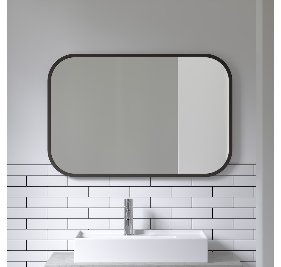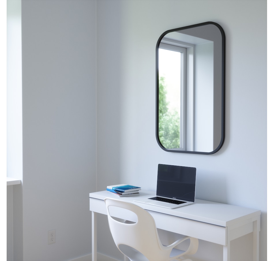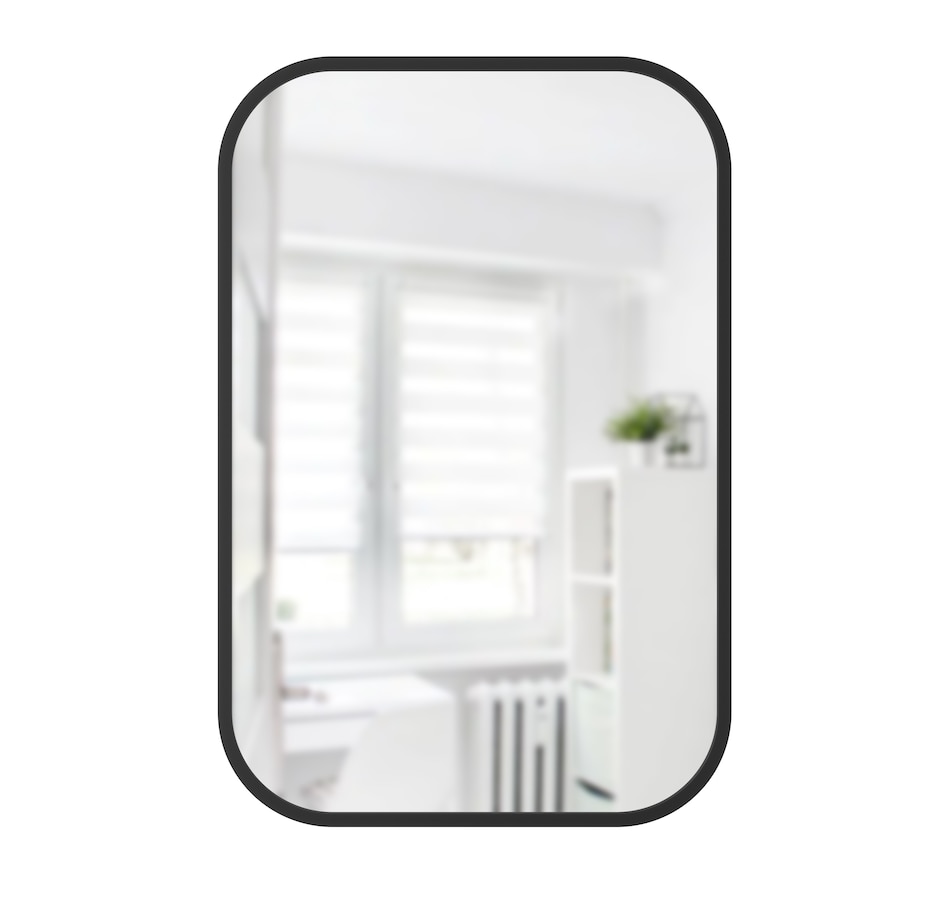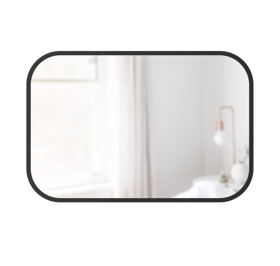 This mirror brings a fun and new shape to the classic Hub Mirror family. Measuring 36" x 24", Hub will not only brighten your space but also adds visual depth to make it appear larger. With its modern black rubber rim that doubles as a protective bumper, this decorative mirror makes a perfect statement piece in any room!