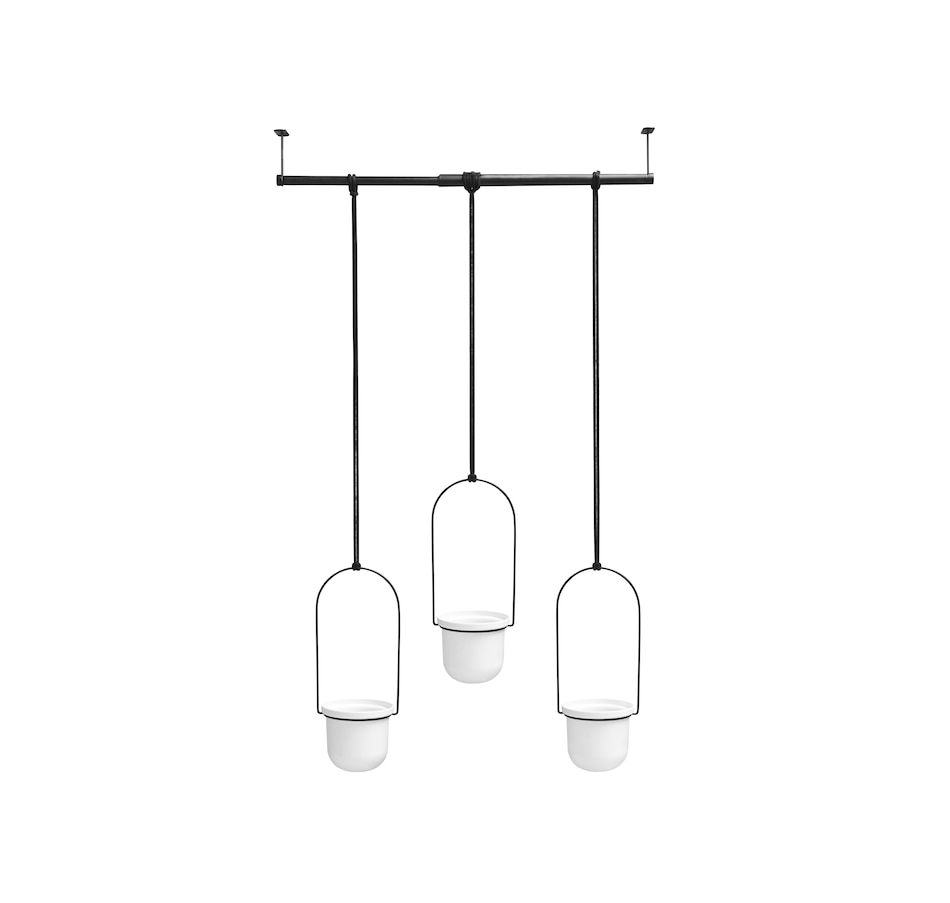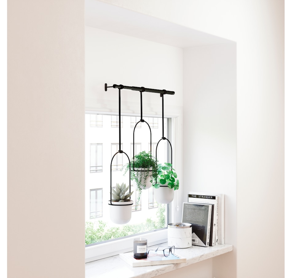 Do you love the look of beautifully displayed plants in a window, or the idea of having fresh herbs on hand in your kitchen, but have nowhere to grow them? Then this clever window décor from Umbra is your solution! Introducing Triflora by Umbra Triflora combines the utility of a drapery rod with the beauty of potted plants for a piece of décor that displays greenery in your window with ease. Great for herbs, succulents, and vine plants, Triflora mounts from your wall or ceiling. It adds functionality to your window, turning it into a space where you can display plants. Triflora’s highly durable melamine pots are made to fit standard size 3-inch diameter pots. You can alter the length of its ropes, as well as slide them across the rod in order to change the placement of the plant pots for a customized look. Details Triflora is made to fit a standard 24-inch kitchen window. Its pots are white and its rod and ropes are black.