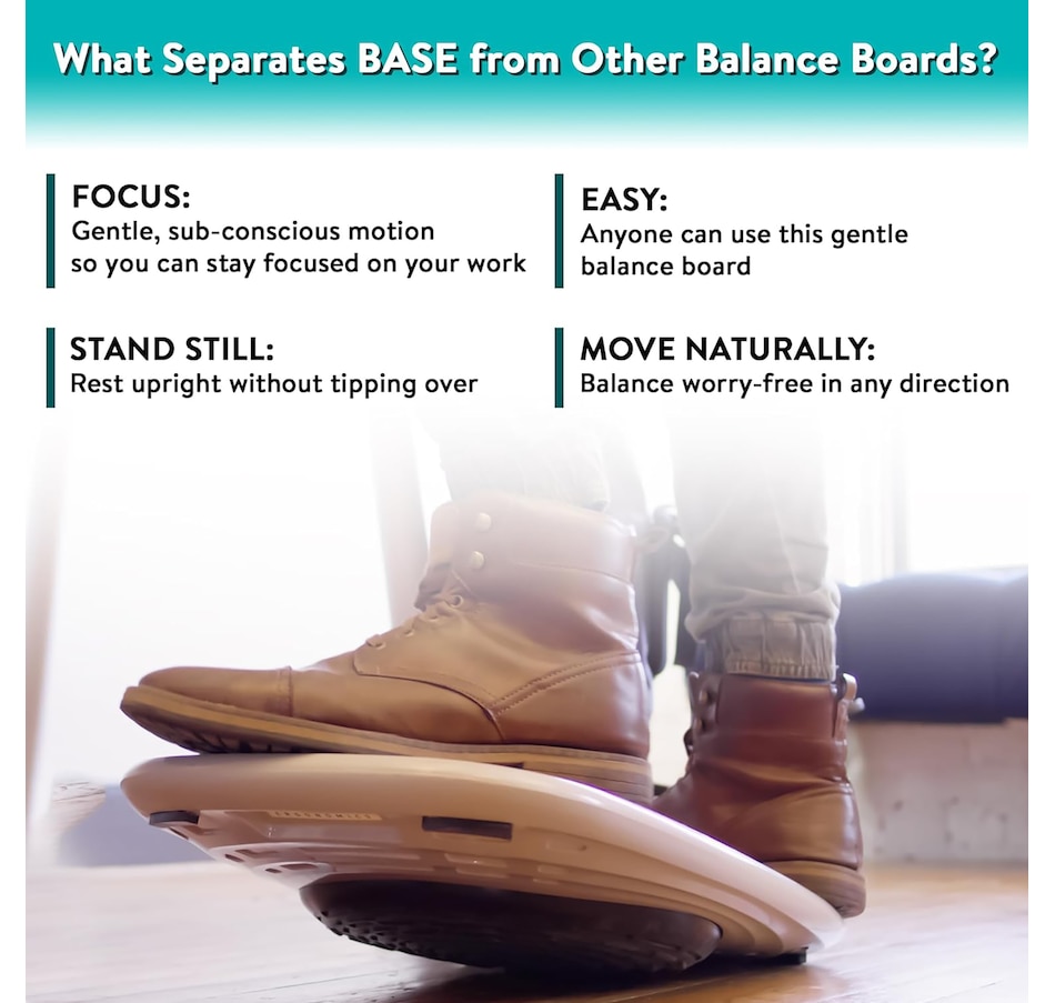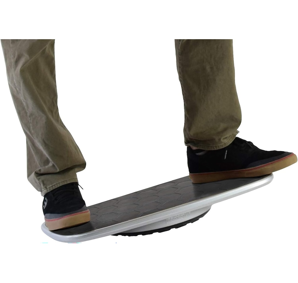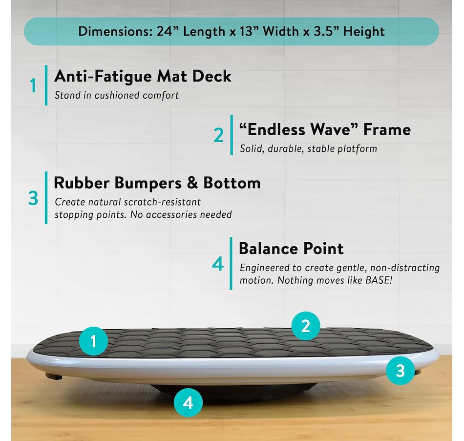 This balance board for standing desks features an anti-fatigue mat to enhance your comfort while on your feet. The patented standing desk balance board is both unique and original. It allows movement in all directions and gives you the option to stand still and upright without tipping over. It was designed so you can remain focused on your work while naturally fidgeting and balancing without even thinking about it. This board features an anti-fatigue deck that allows a cushioned mat to make standing more comfortable and easier on the joints. The underside is made of durable, non-skid, non-marking rubber bottom, ABS plastic frame and non-skid rubber corners. This wobble board for the office is a unique, effective, useful addition to your ergonomic standing desk.