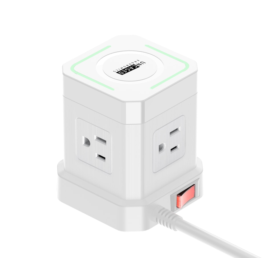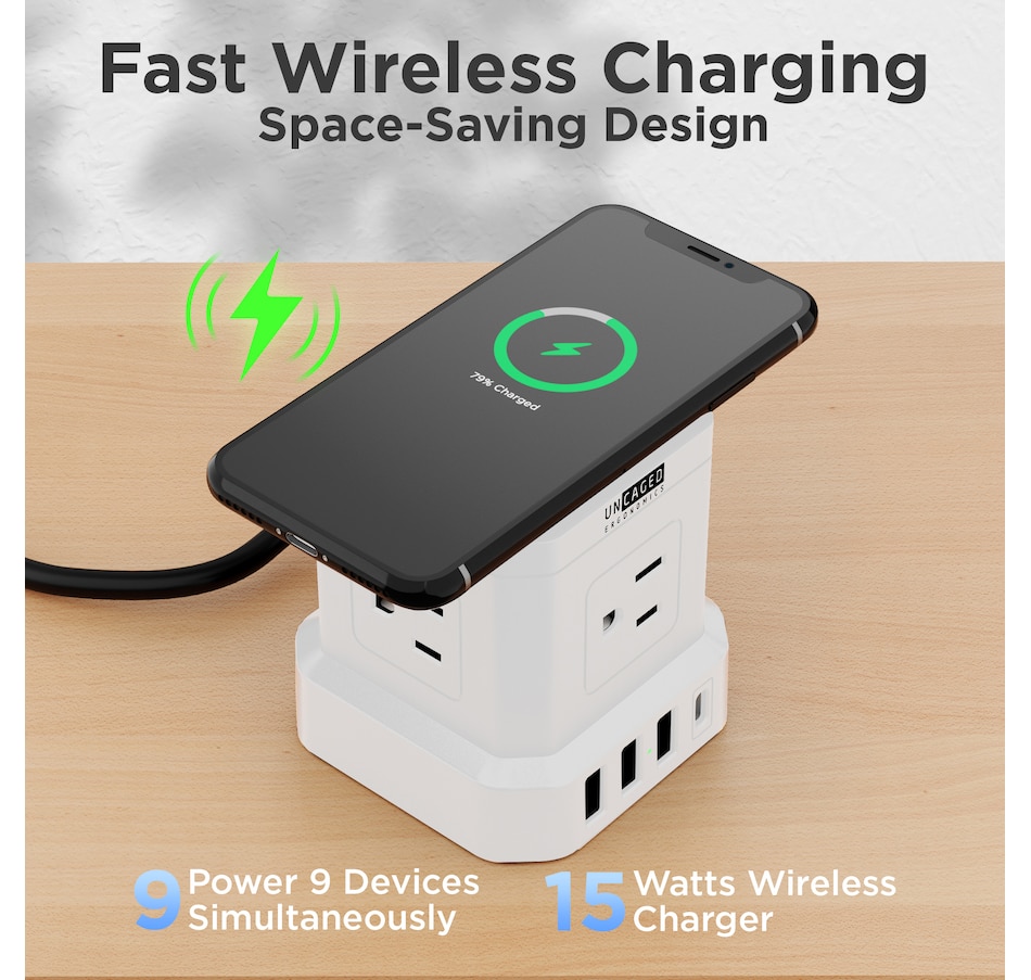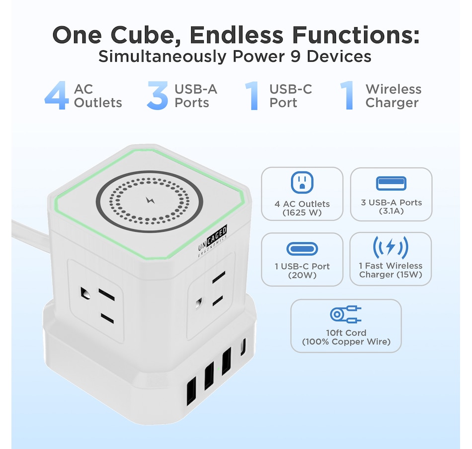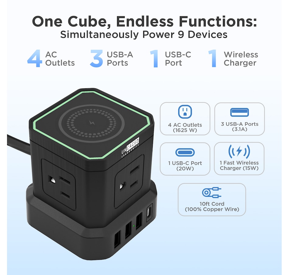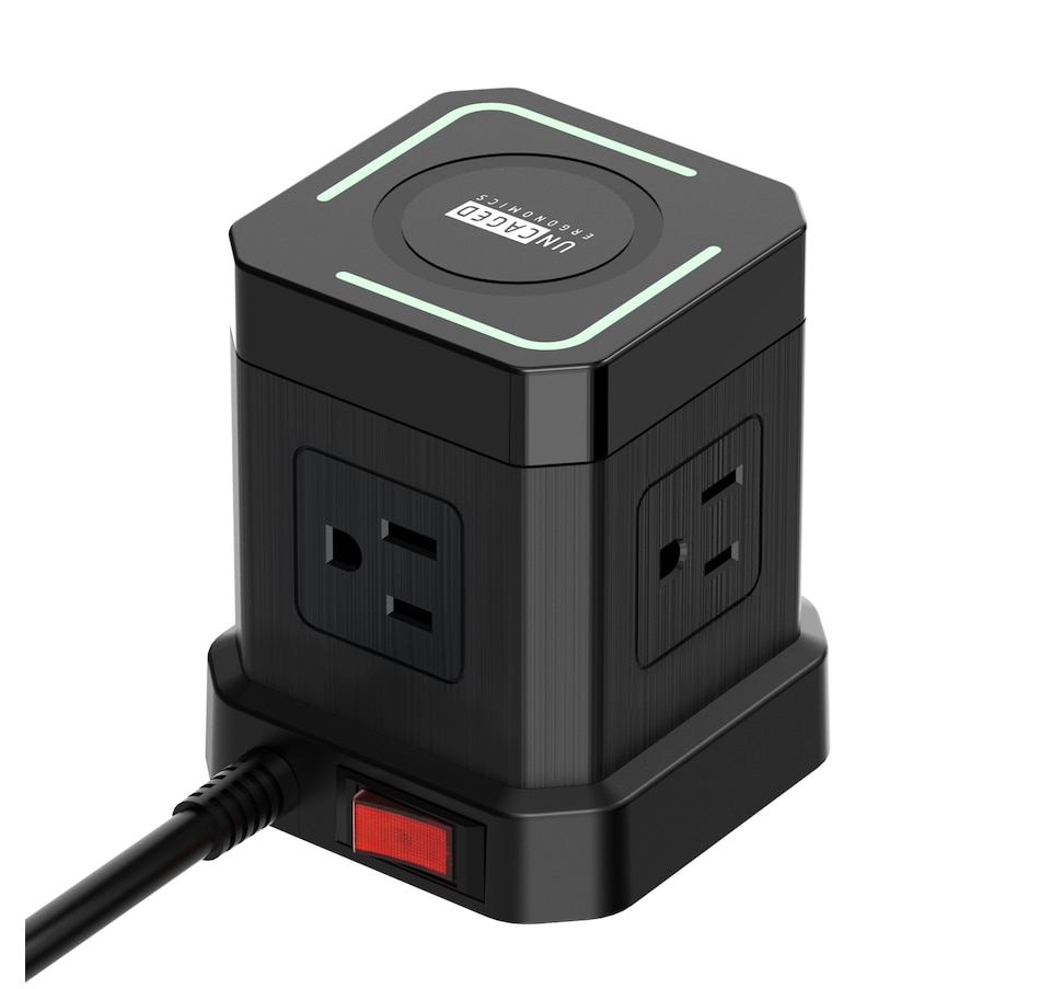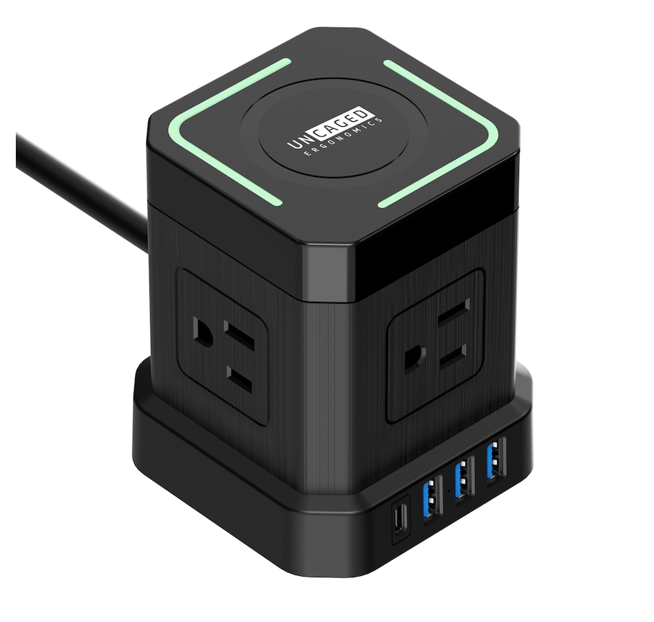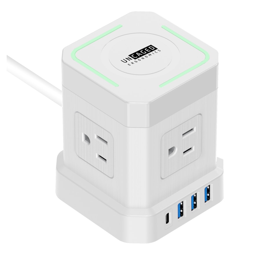 The Uncaged Ergonomics wireless charger cube power strip is an all-in-one convenient charging station for all of your devices! This wireless charger surge protector power strip with USB ports has been designed with all electronic devices in mind. Enjoy organized cable management with a clutter-free solution that fits in the palm of your hand. You can power nine devices at simultaneously with four AC outlets, three USB-A ports, a USB-C port and a wireless charger. The eight point safety system includes 700J surge protection, over-voltage protection, over-load protection, over-current protection, grounded protection, short-circuit protection, a fire-resistance shell and over-temperature control. It is not only compact, but also portable and mountable. Rubber feet and a wall mount allow for headache free mounting. The 10-foot extension cord has a flat plug power strip. The multiple outlets are arranged in a non-blocking design, so there's no more skipping outlets. Overall, it takes up a fraction of the space that a clunky flat extension cord does. The On/Off switch on this surge protector outlet extender makes it easy to save power and eliminates the need to constantly plug and unplug devices. There are endless uses for this high quality power strip tower around the house, at your desk, in the kitchen, garage, workshop, entertainment systems and holiday decorations.