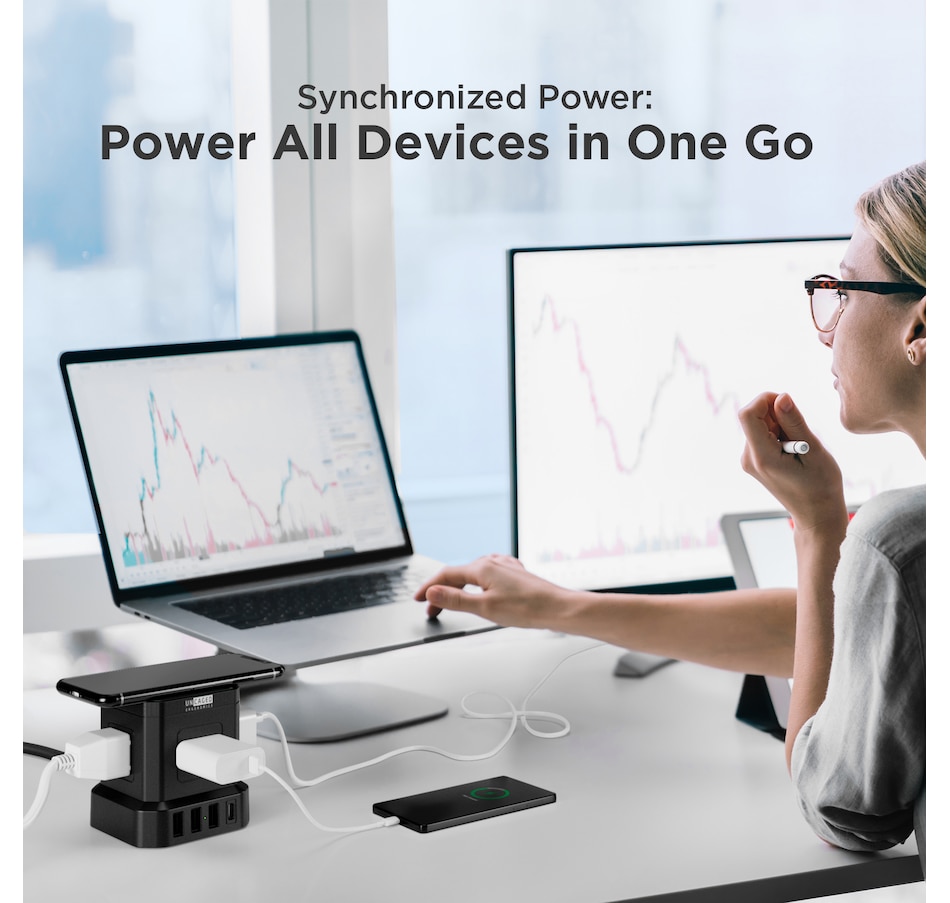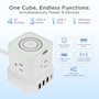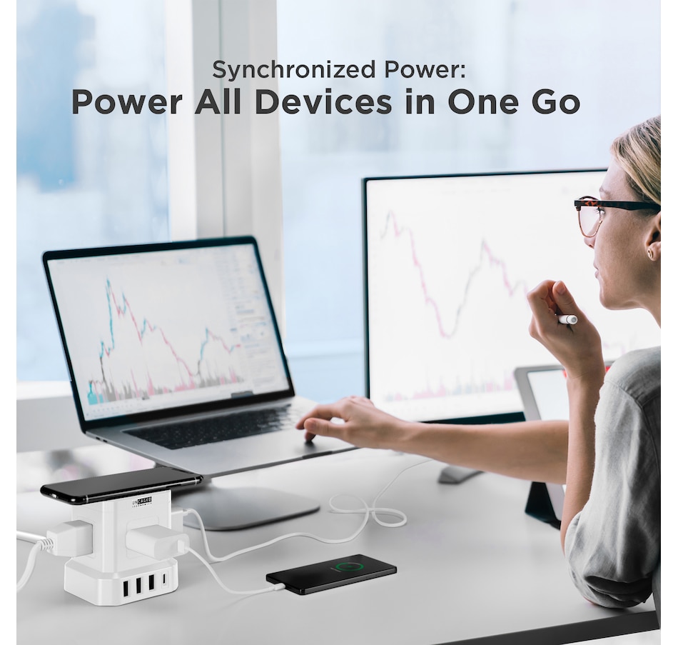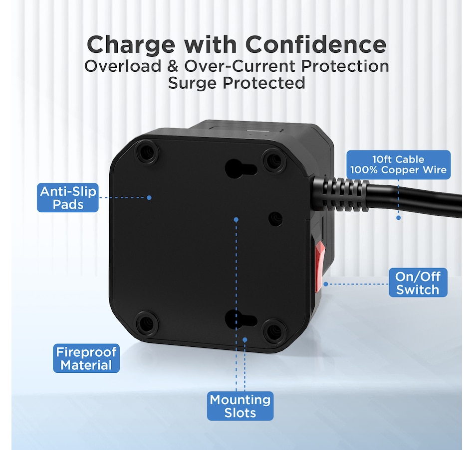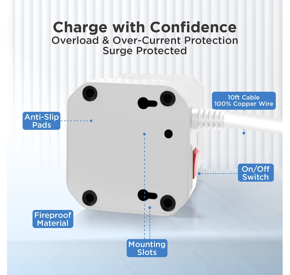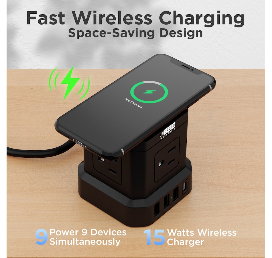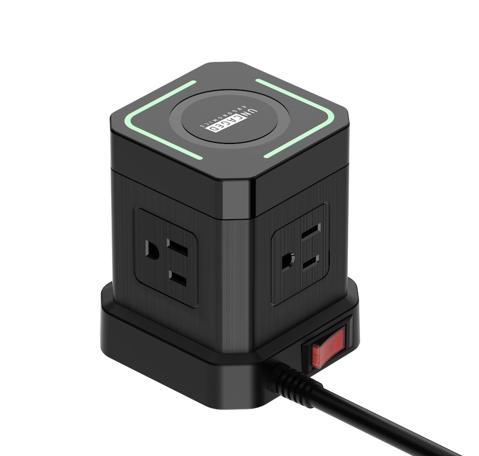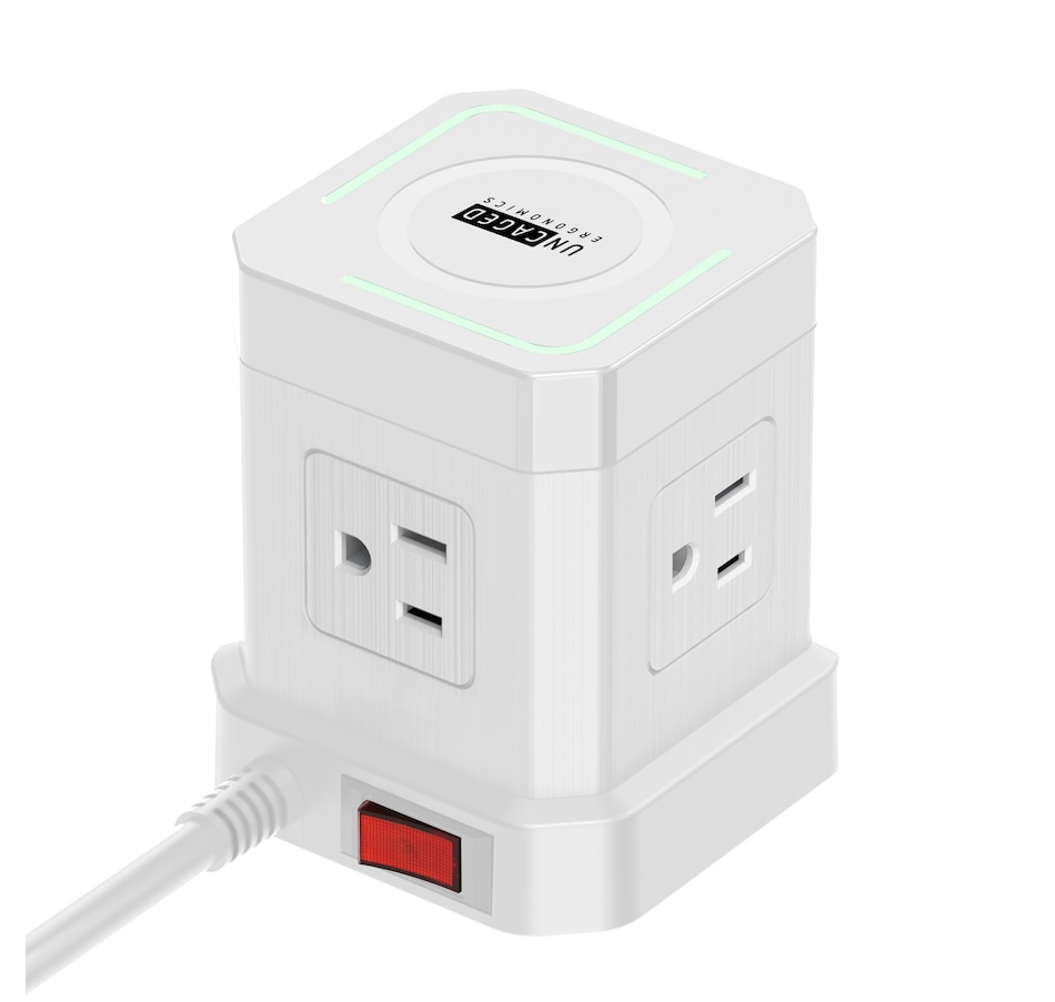 The Uncaged Ergonomics wireless charger cube power strip is an all-in-one convenient charging station for all of your devices! This wireless charger surge protector power strip with USB ports has been designed with all electronic devices in mind. Enjoy organized cable management with a clutter-free solution that fits in the palm of your hand. You can power nine devices at simultaneously with four AC outlets, three USB-A ports, a USB-C port and a wireless charger. The eight point safety system includes 700J surge protection, over-voltage protection, over-load protection, over-current protection, grounded protection, short-circuit protection, a fire-resistance shell and over-temperature control. It is not only compact, but also portable and mountable. Rubber feet and a wall mount allow for headache free mounting. The 10-foot extension cord has a flat plug power strip. The multiple outlets are arranged in a non-blocking design, so there's no more skipping outlets. Overall, it takes up a fraction of the space that a clunky flat extension cord does. The On/Off switch on this surge protector outlet extender makes it easy to save power and eliminates the need to constantly plug and unplug devices. There are endless uses for this high quality power strip tower around the house, at your desk, in the kitchen, garage, workshop, entertainment systems and holiday decorations.