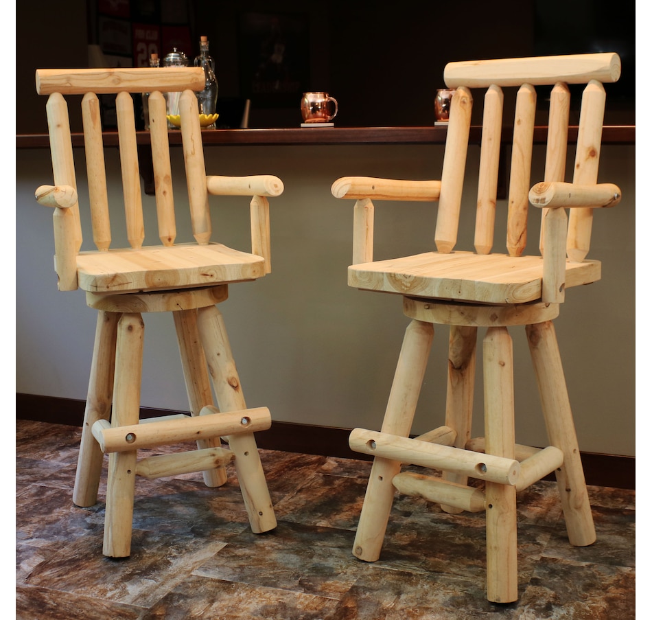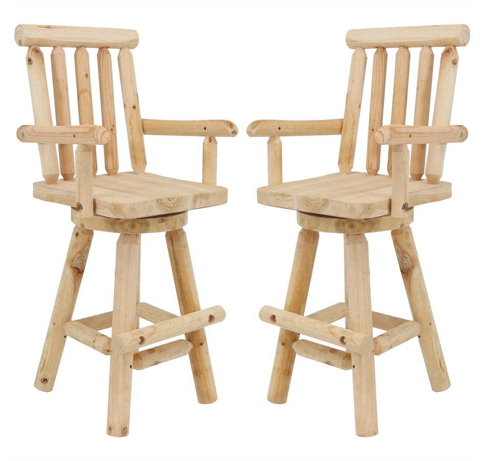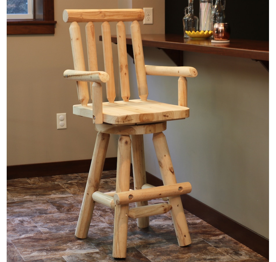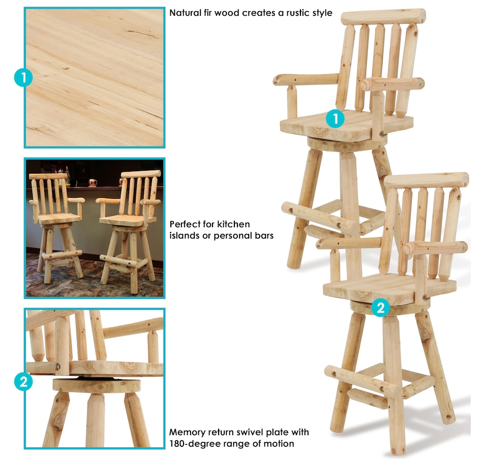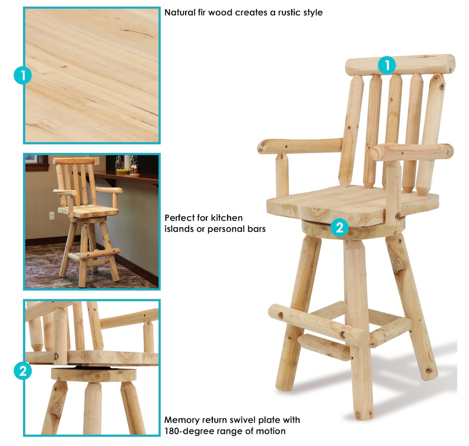 This rustic-style, wooden barstool will add natural charm to the kitchen, rec room, patio, or bar. Its tall design ensures that this chair can be used with home bars, pub tables, kitchen islands, and counters. It features a sturdy back and armrests for comfort and support. This barstool with back also features a convenient memory return swivel plate that provides a 180-degree range of motion. Made of dependable fir wood, this stylish chair will bring a bit of the Northwoods to any home or cabin. This chair may feature "checking” (splits in the wood) for added design. Checking is a natural phenomenon that is common in wood furniture construction and will not affect the overall stability of the chair. Plus, this elegant chair can be stained any color to complement a variety of decor colors and styles. This bar chair is designed for indoor or outdoor use.