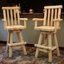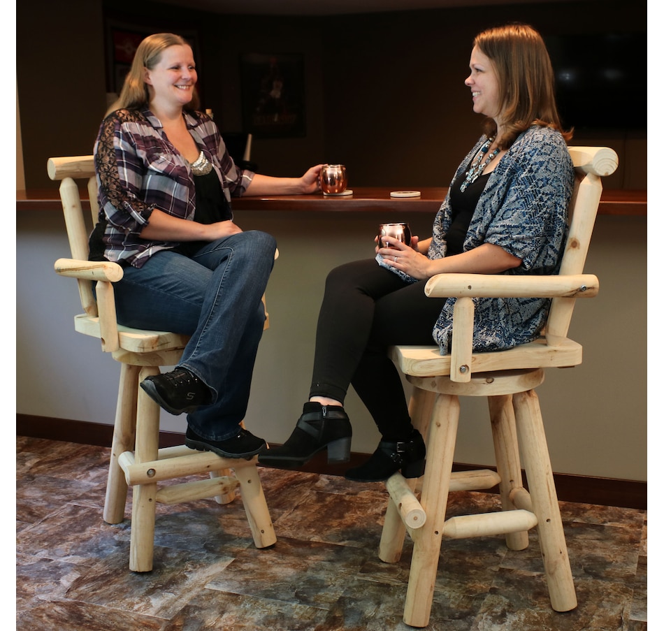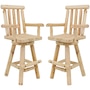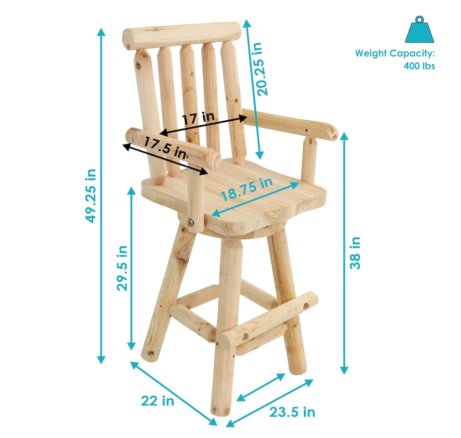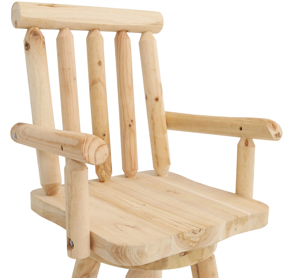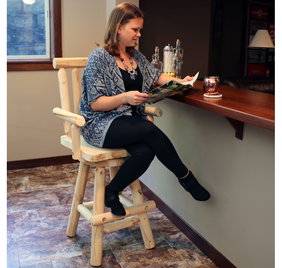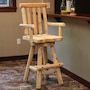 This rustic-style, wooden barstool will add natural charm to the kitchen, rec room, patio, or bar. Its tall design ensures that this chair can be used with home bars, pub tables, kitchen islands, and counters. It features a sturdy back and armrests for comfort and support. This barstool with back also features a convenient memory return swivel plate that provides a 180-degree range of motion. Made of dependable fir wood, this stylish chair will bring a bit of the Northwoods to any home or cabin. This chair may feature "checking” (splits in the wood) for added design. Checking is a natural phenomenon that is common in wood furniture construction and will not affect the overall stability of the chair. Plus, this elegant chair can be stained any color to complement a variety of decor colors and styles. This bar chair is designed for indoor or outdoor use.