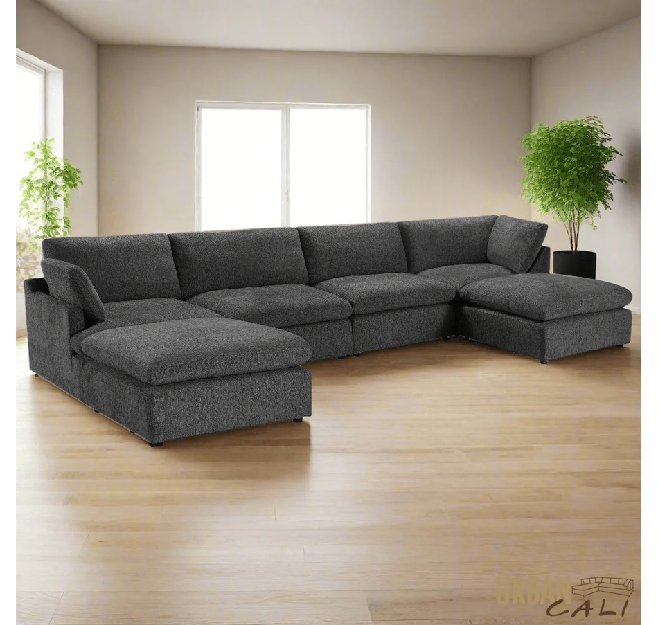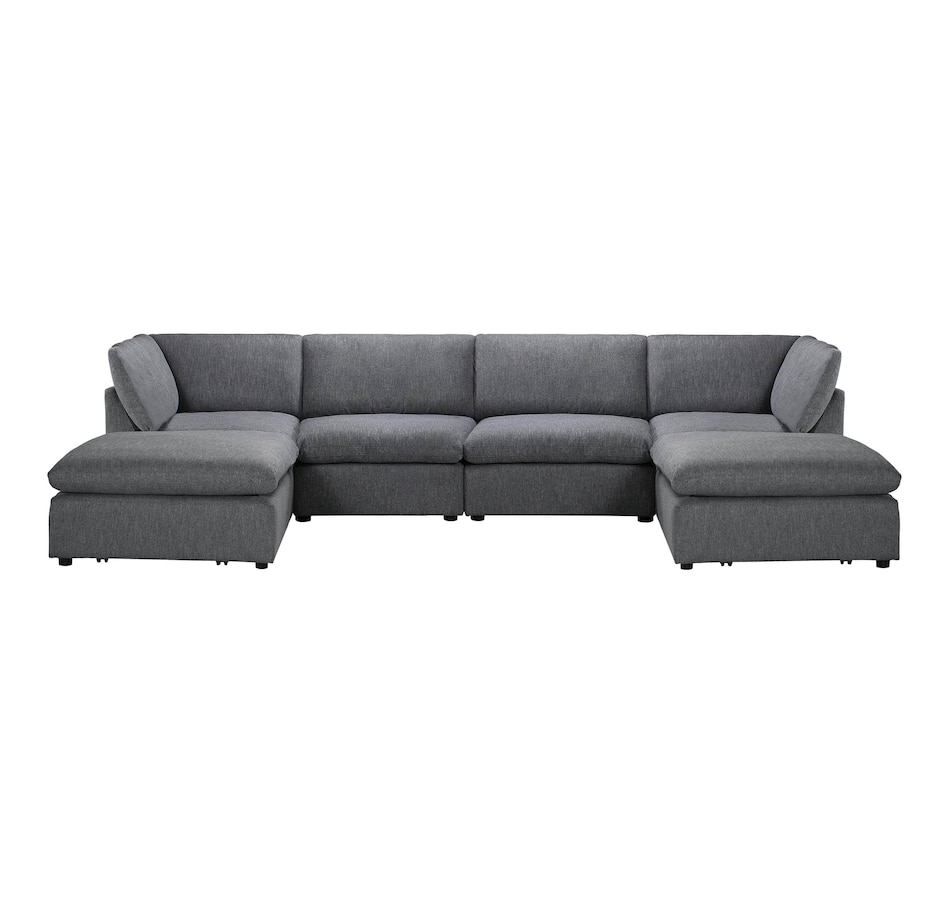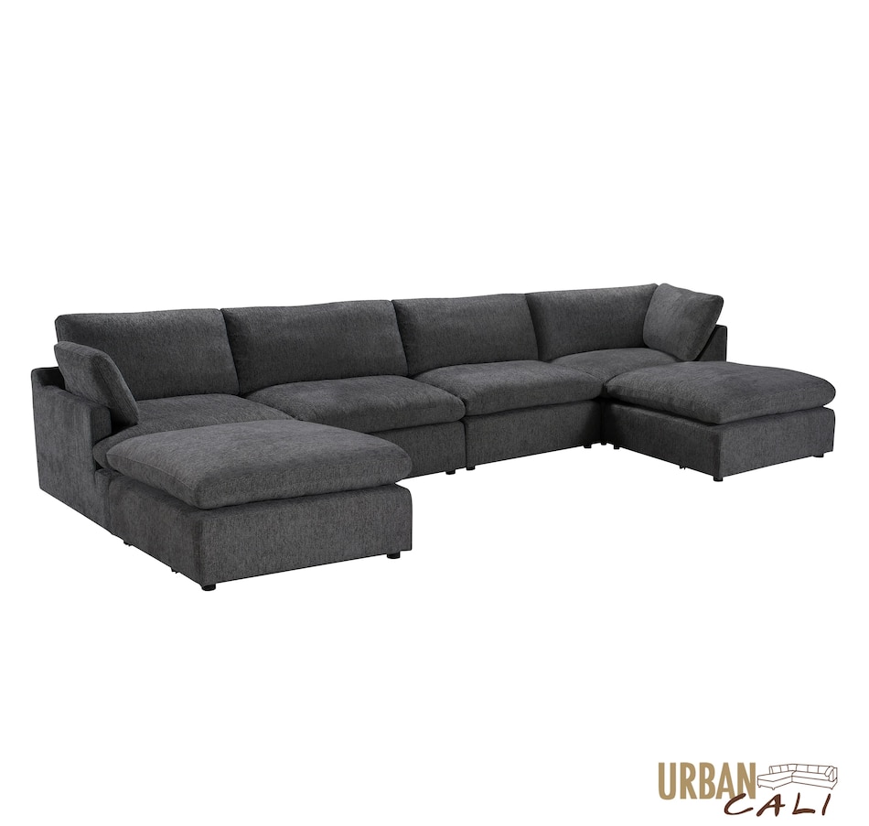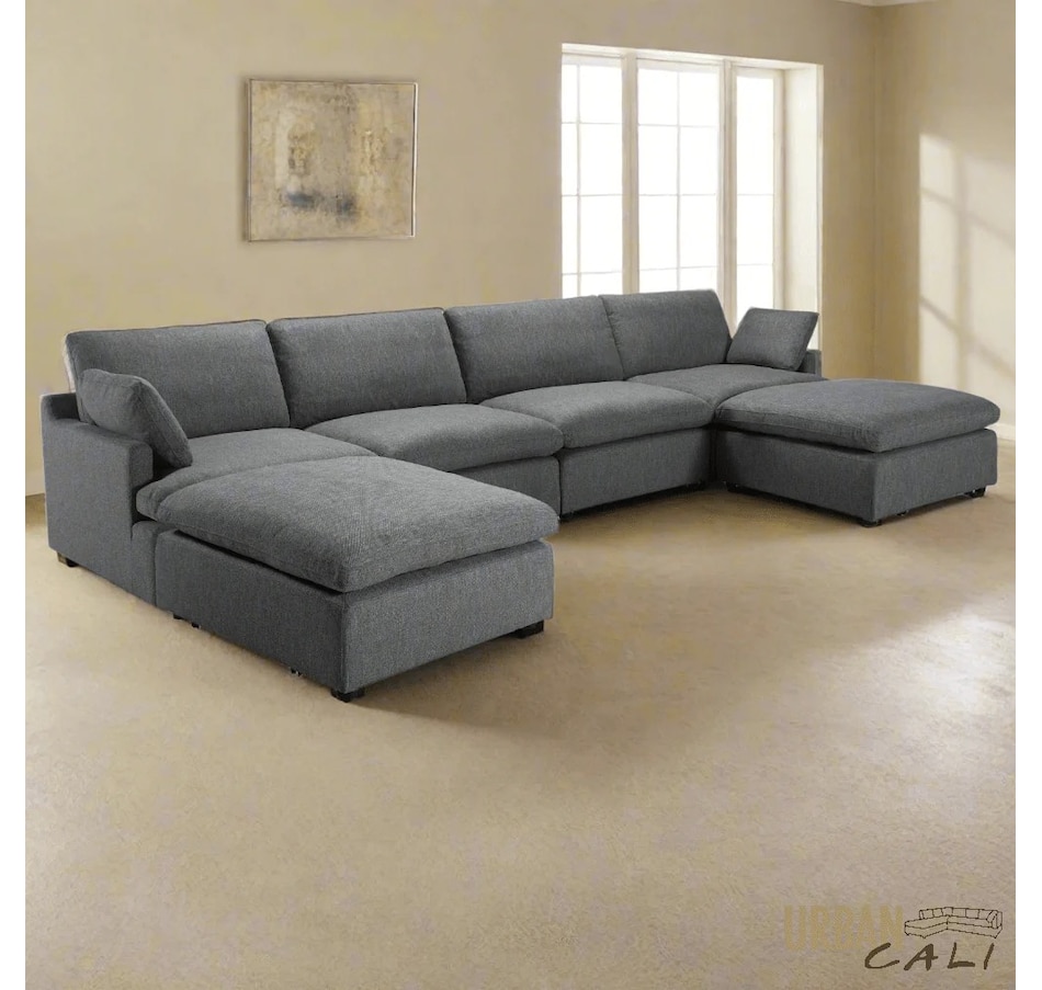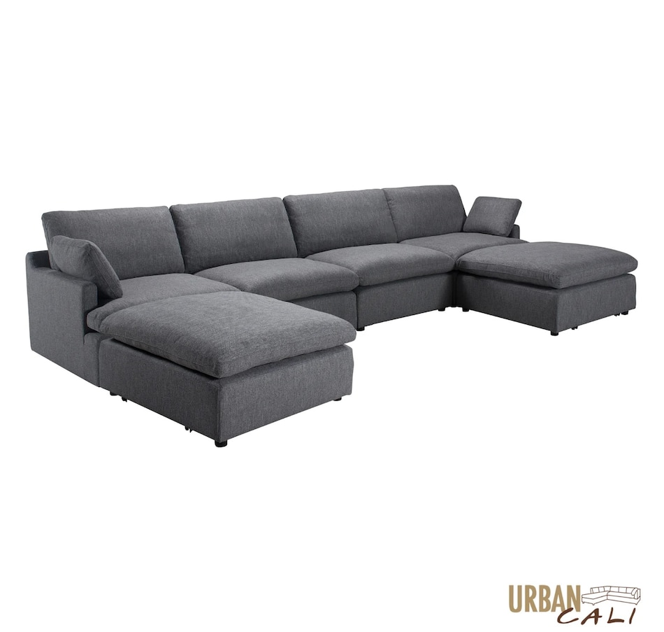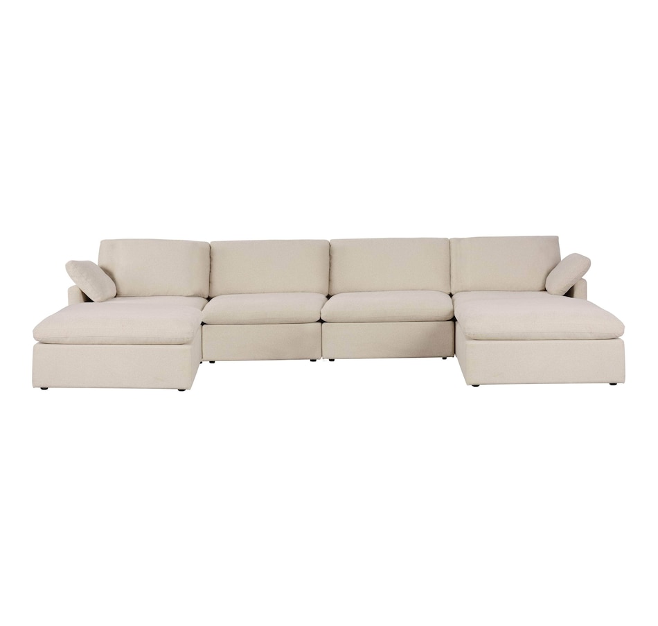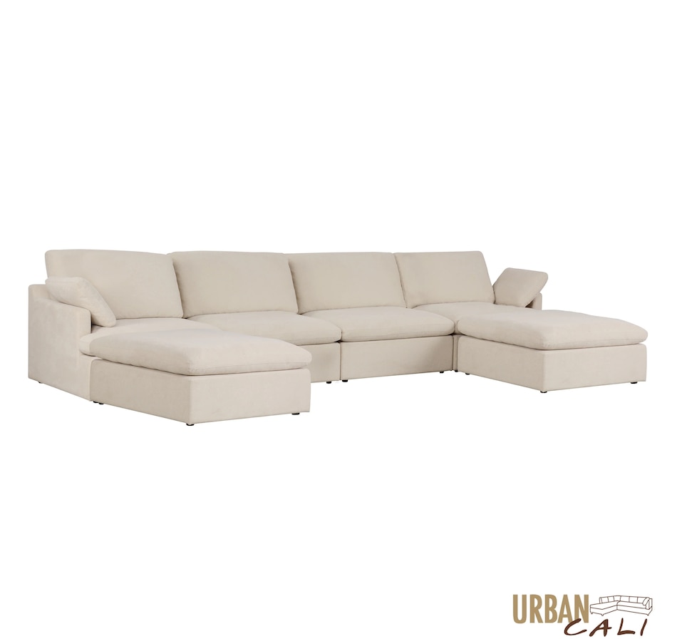 Introducing the Long Beach Modular U-Shaped Sectional Sofa - an ultra-comfy piece of furniture designed for laid back lounging. Sink into the soft feather and fibre filled cushions as you sit back in the wide and deep seating. The sectional sofa includes one left arm chair, two armless chairs, one right arm chair, and two ottomans. With its modular design, you can move around the pieces of the sectional sofa in endless configurations to suit your space. The frame is made from a sturdy pine and plywood, ensuring that this sectional will stand the test of time. The Long Beach sectional offers a modern style with the versatility and comfort unmatched by any other sectional sofa.