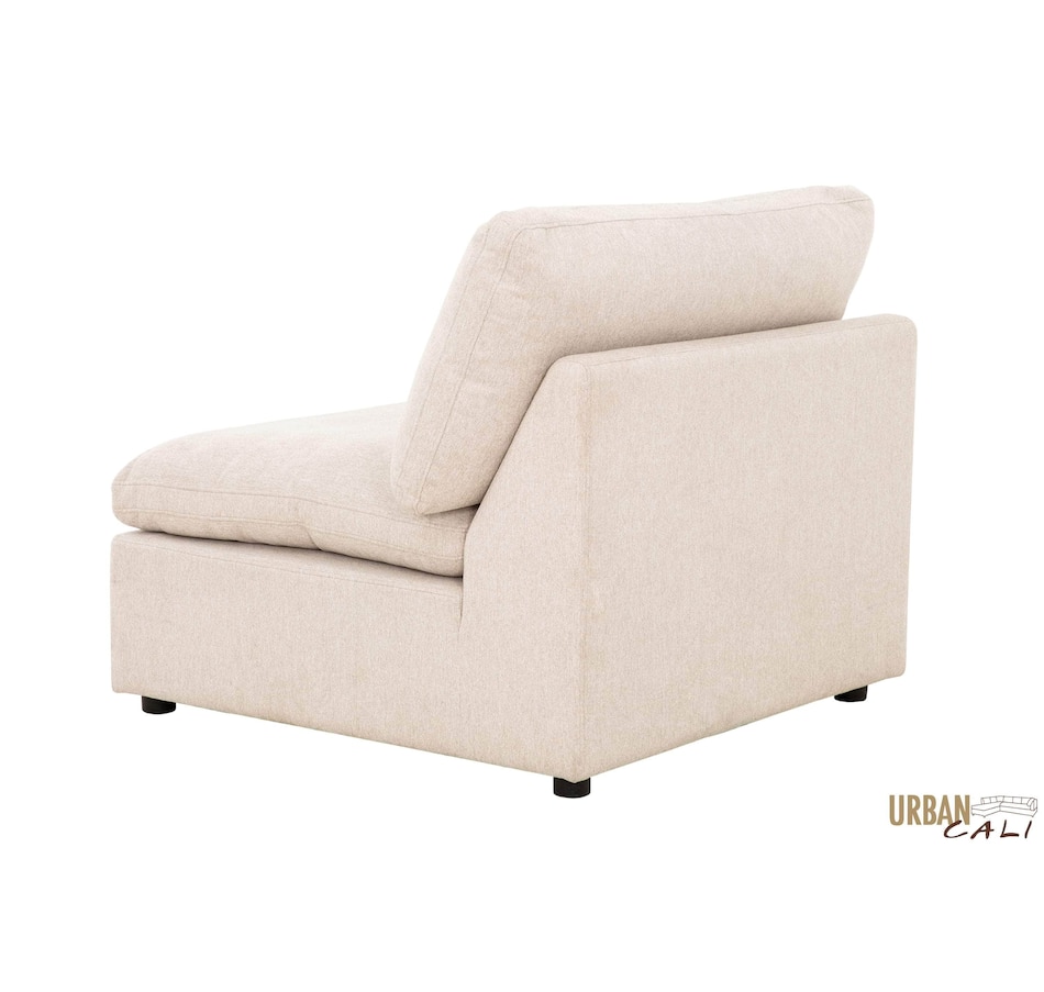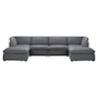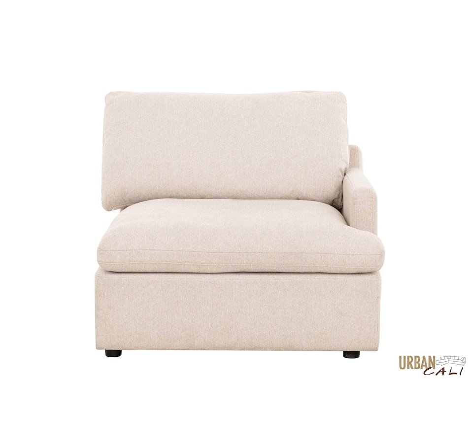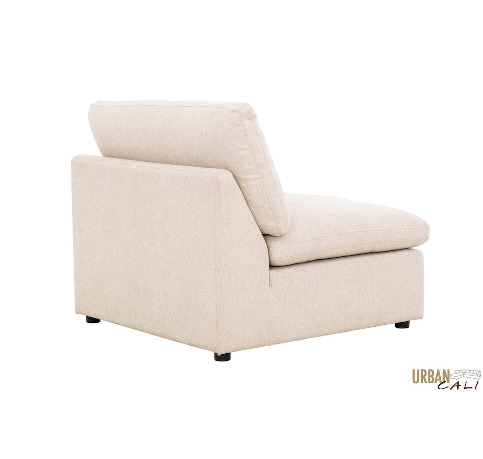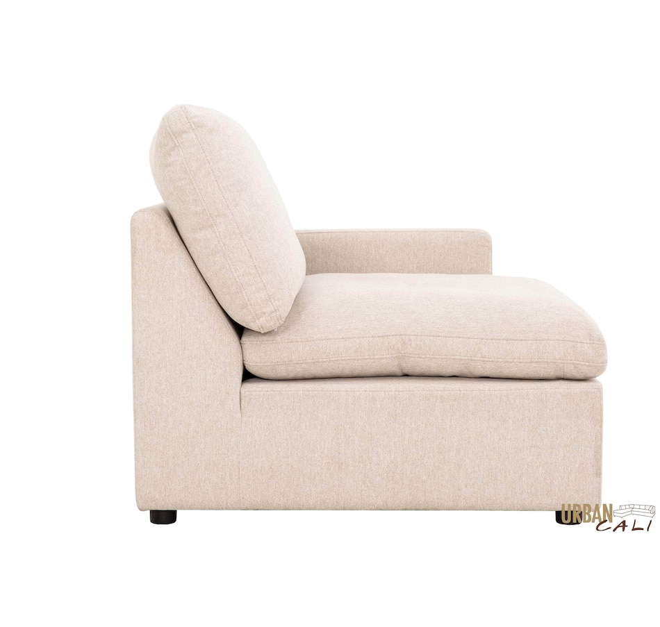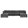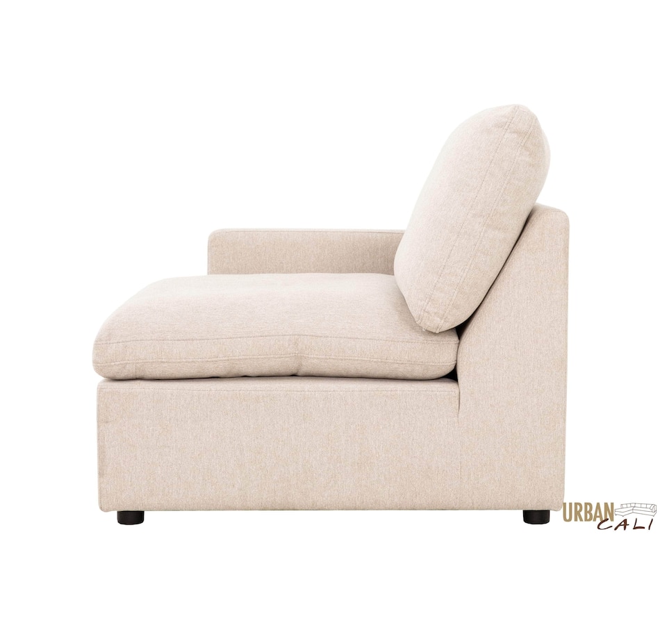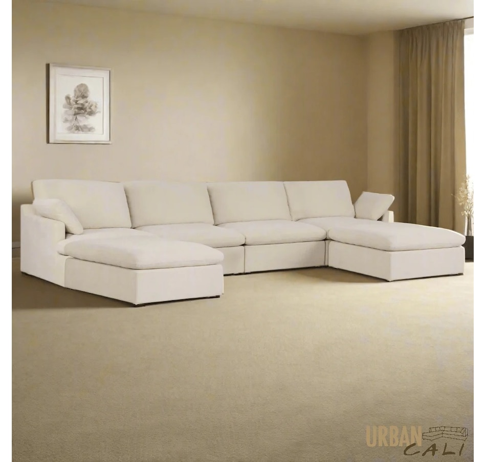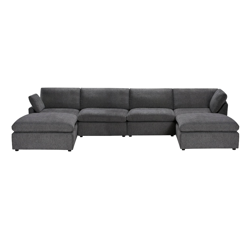 Introducing the Long Beach Modular U-Shaped Sectional Sofa - an ultra-comfy piece of furniture designed for laid back lounging. Sink into the soft feather and fibre filled cushions as you sit back in the wide and deep seating. The sectional sofa includes one left arm chair, two armless chairs, one right arm chair, and two ottomans. With its modular design, you can move around the pieces of the sectional sofa in endless configurations to suit your space. The frame is made from a sturdy pine and plywood, ensuring that this sectional will stand the test of time. The Long Beach sectional offers a modern style with the versatility and comfort unmatched by any other sectional sofa.