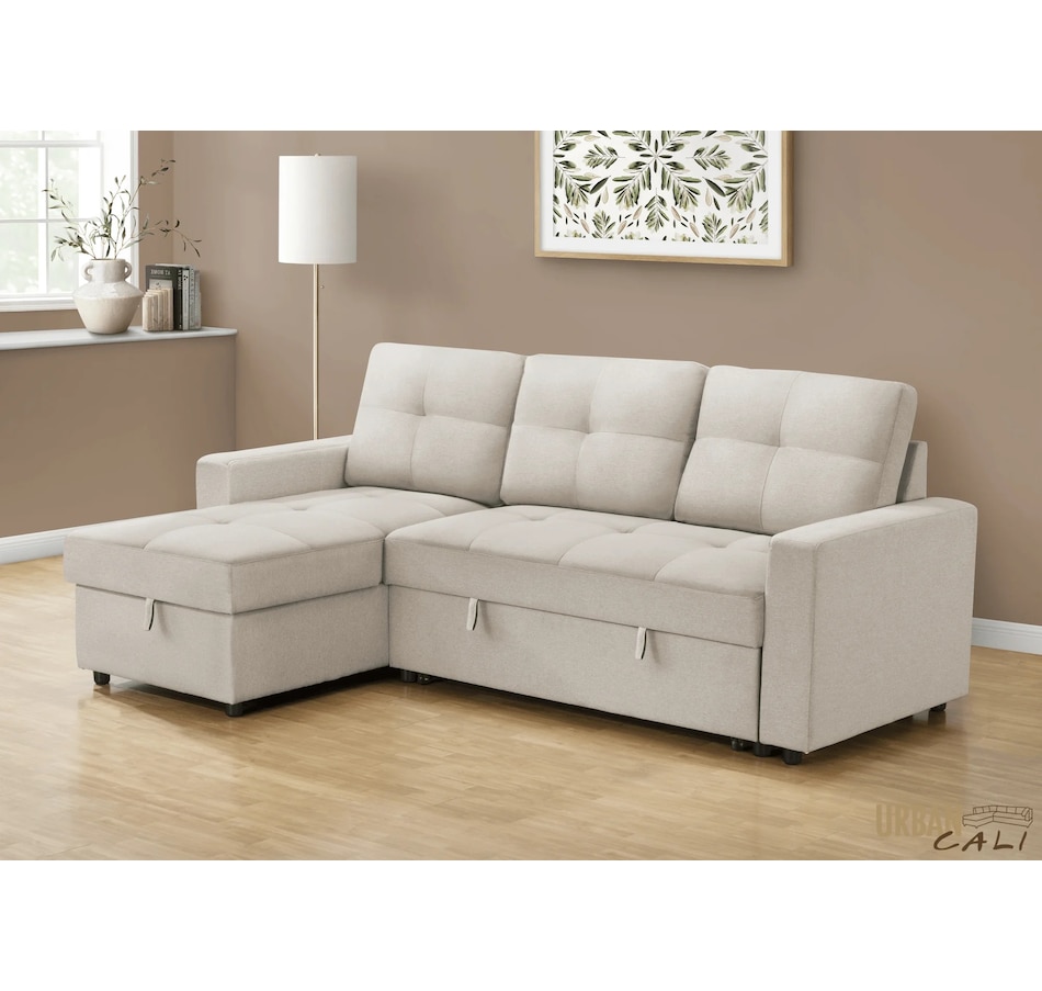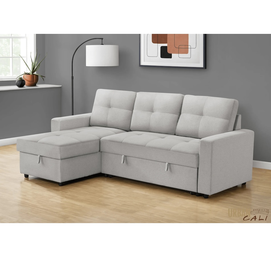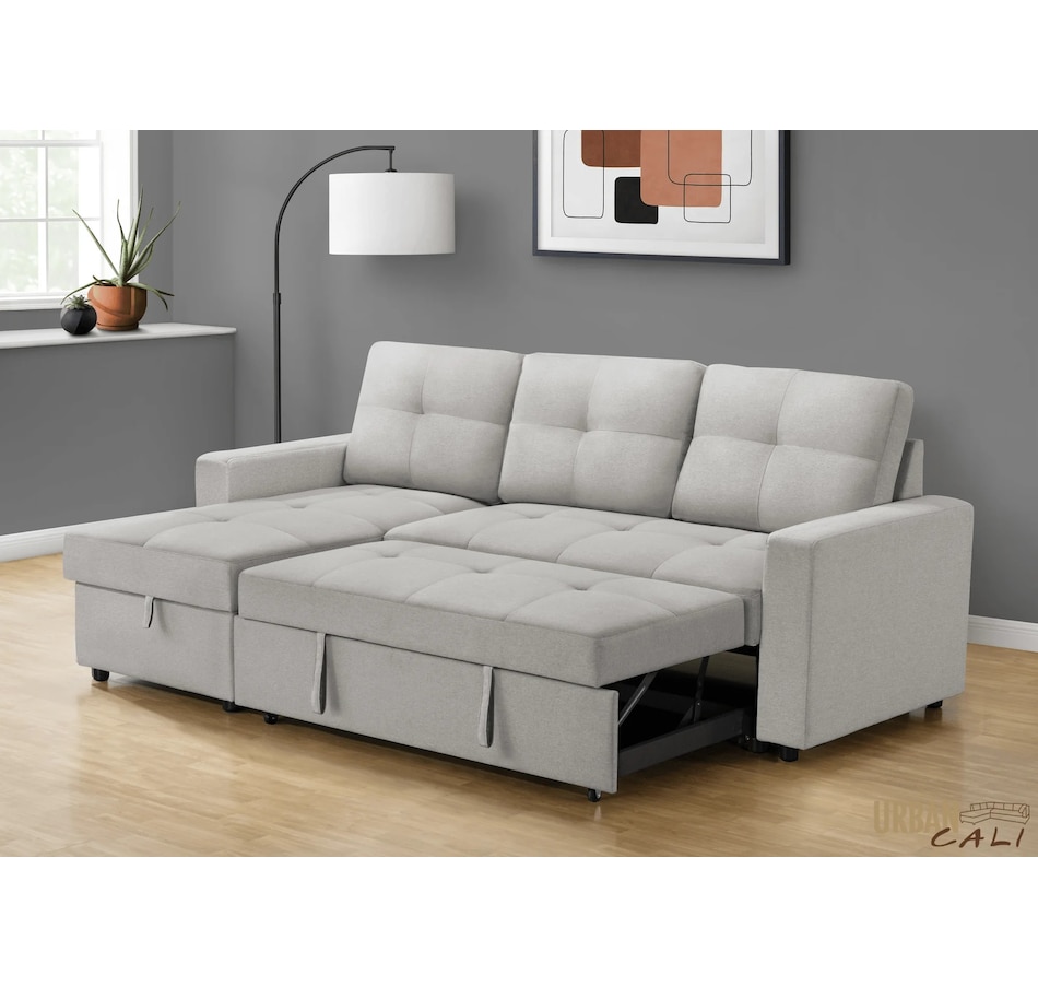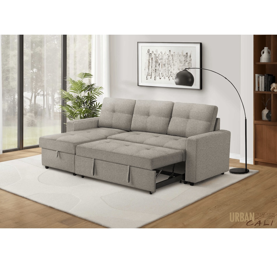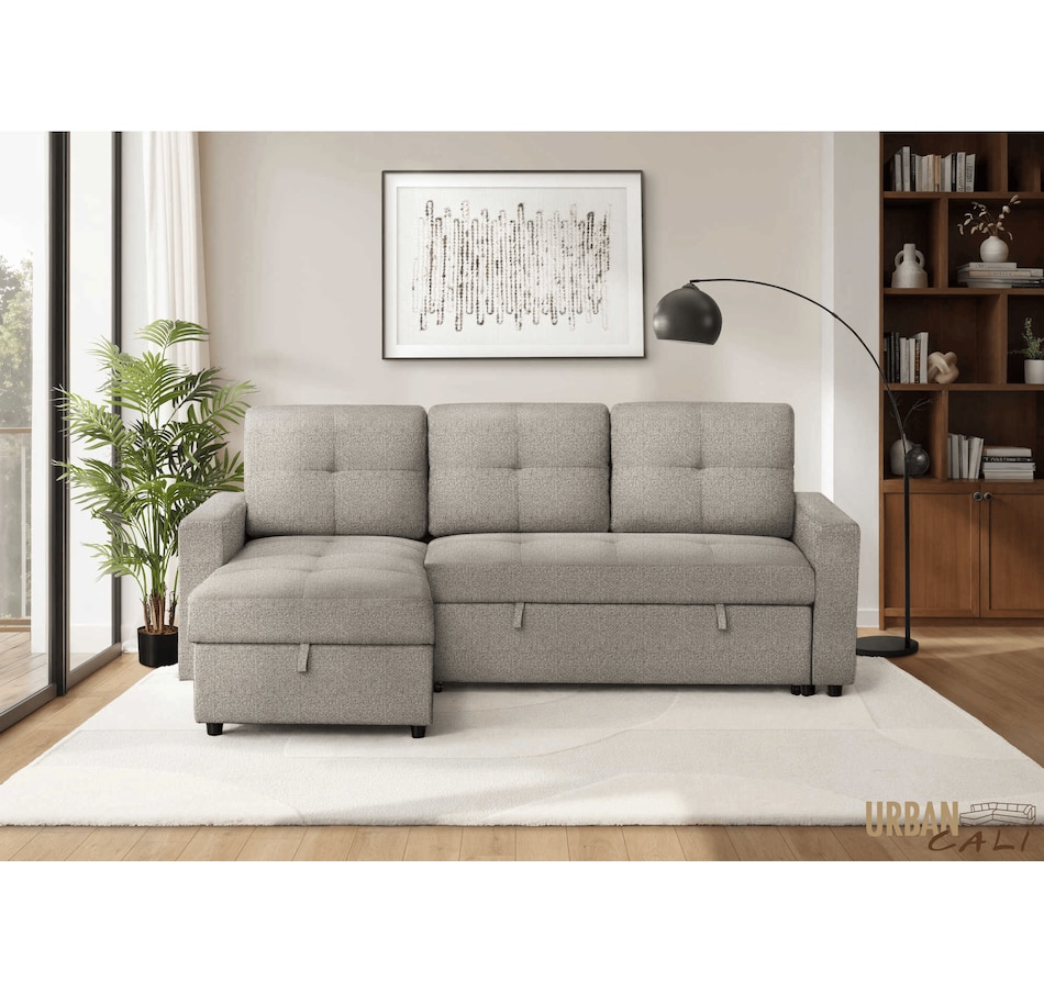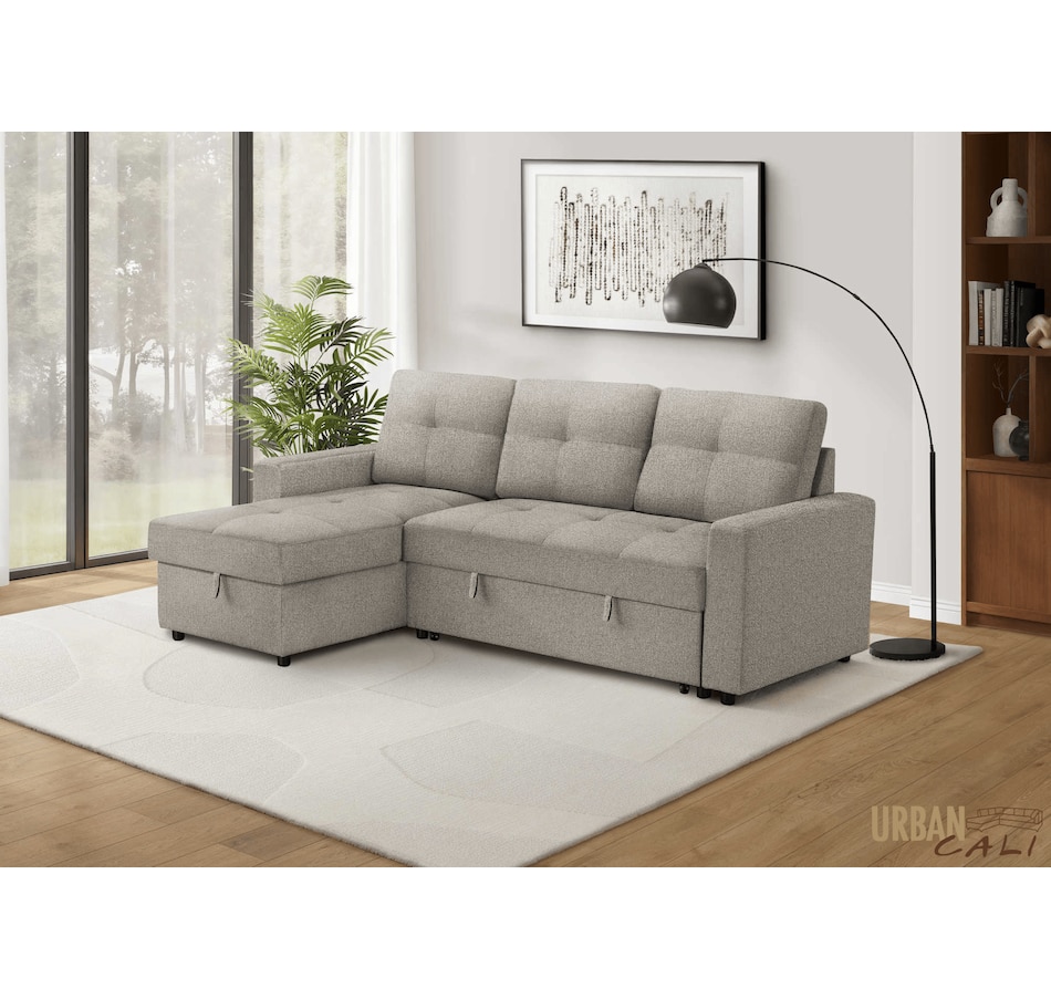 The Venice is our most versatile compact sleeper sofa, with a reversible lounger storage chaise that can be assembled on either side. Designed for all types of living spaces, this minimalist solution utilizes high-quality solid wood frames, pocket coil springs seating, and high density foam cushioning. Overall dimensions measure 89.5"W x 58.25"D x 36"H, making it a perfect fit for any room. Its durable linen-look upholstery and pop-up sleeper sofa bed make it a practical and elegant addition to any home. Don't miss out on this popular sectional, complete with plastic legs for easy assembly and mobility.