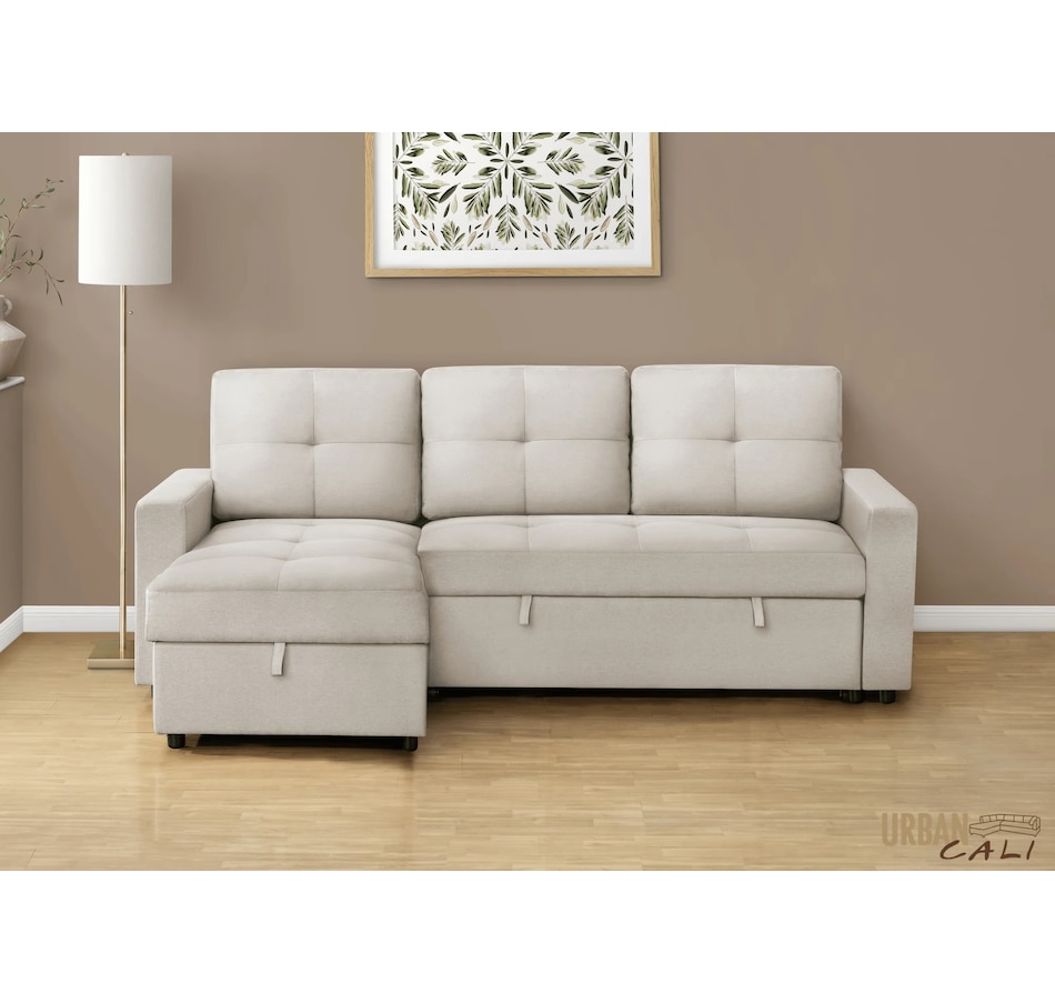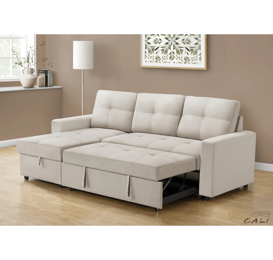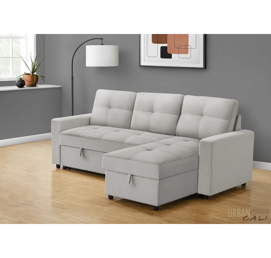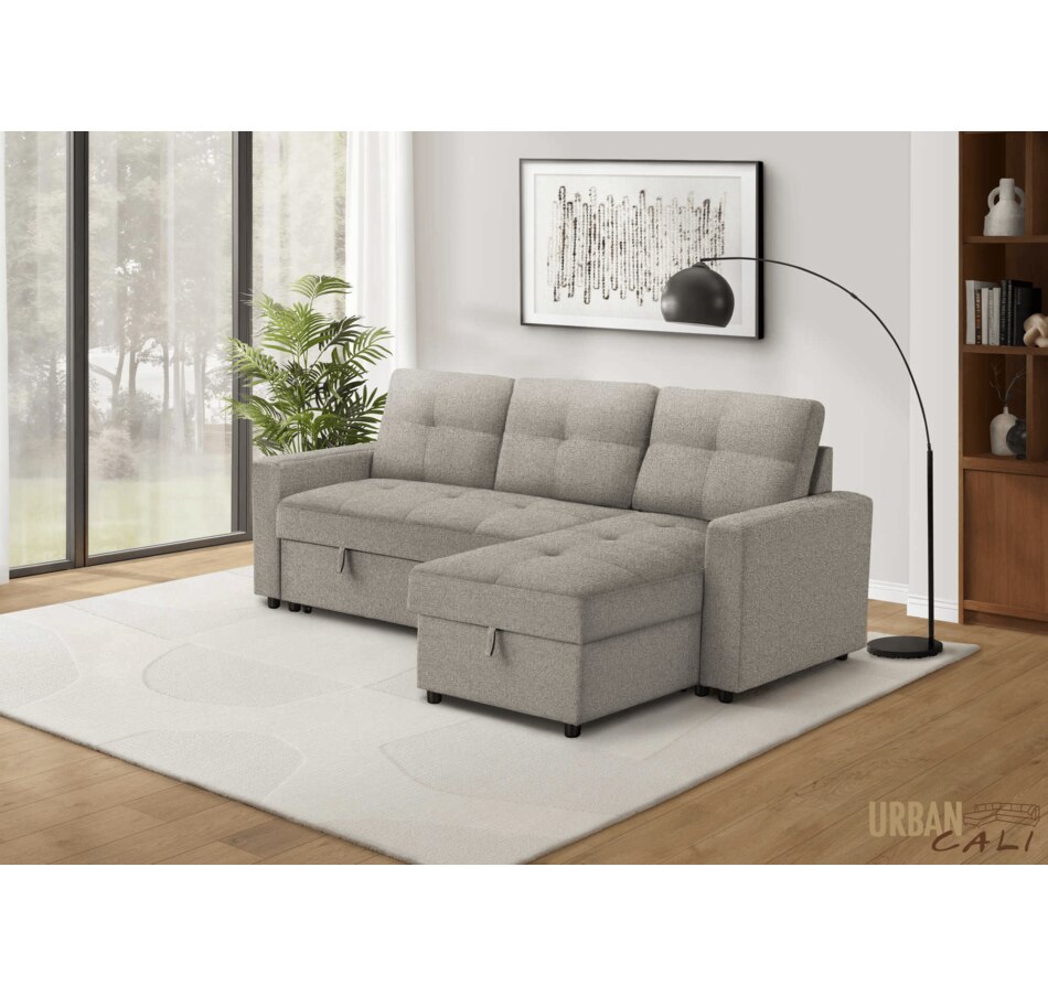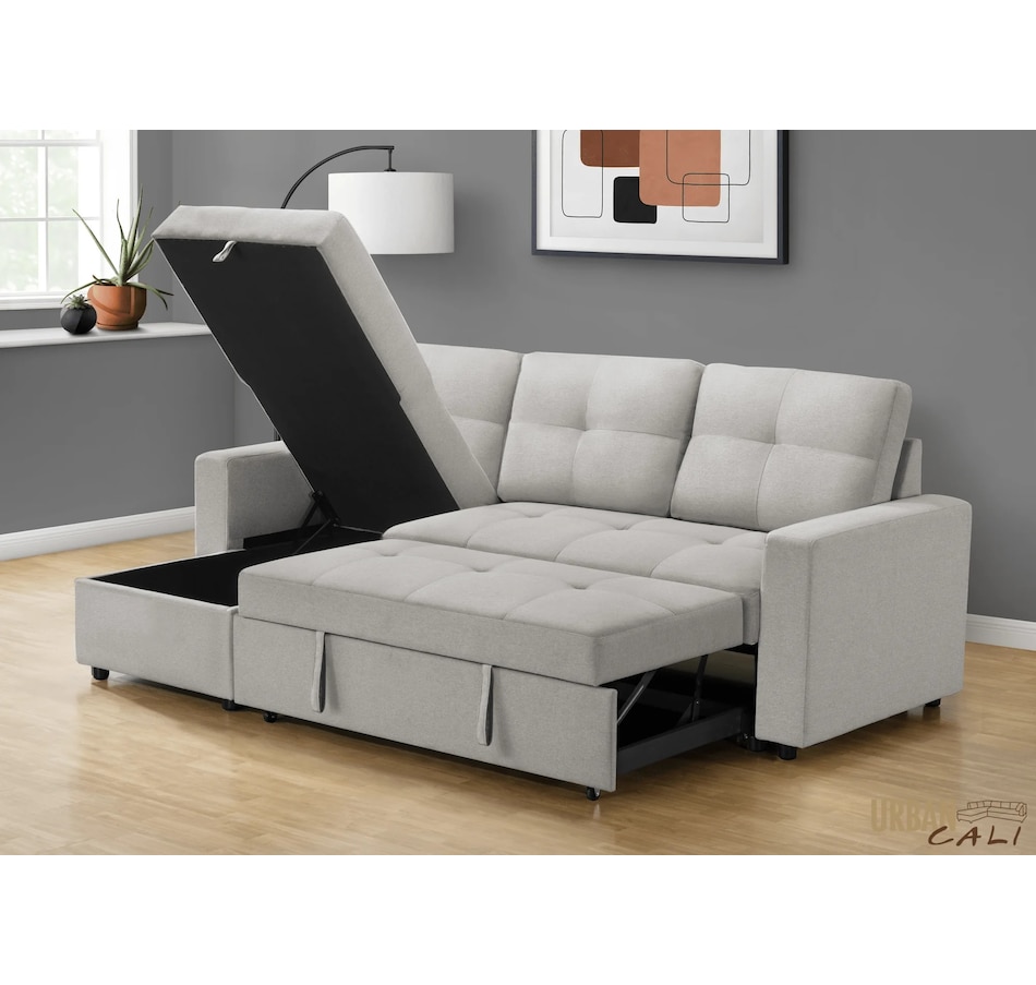 The Venice is our most versatile compact sleeper sofa, with a reversible lounger storage chaise that can be assembled on either side. Designed for all types of living spaces, this minimalist solution utilizes high-quality solid wood frames, pocket coil springs seating, and high density foam cushioning. Overall dimensions measure 89.5"W x 58.25"D x 36"H, making it a perfect fit for any room. Its durable linen-look upholstery and pop-up sleeper sofa bed make it a practical and elegant addition to any home. Don't miss out on this popular sectional, complete with plastic legs for easy assembly and mobility.