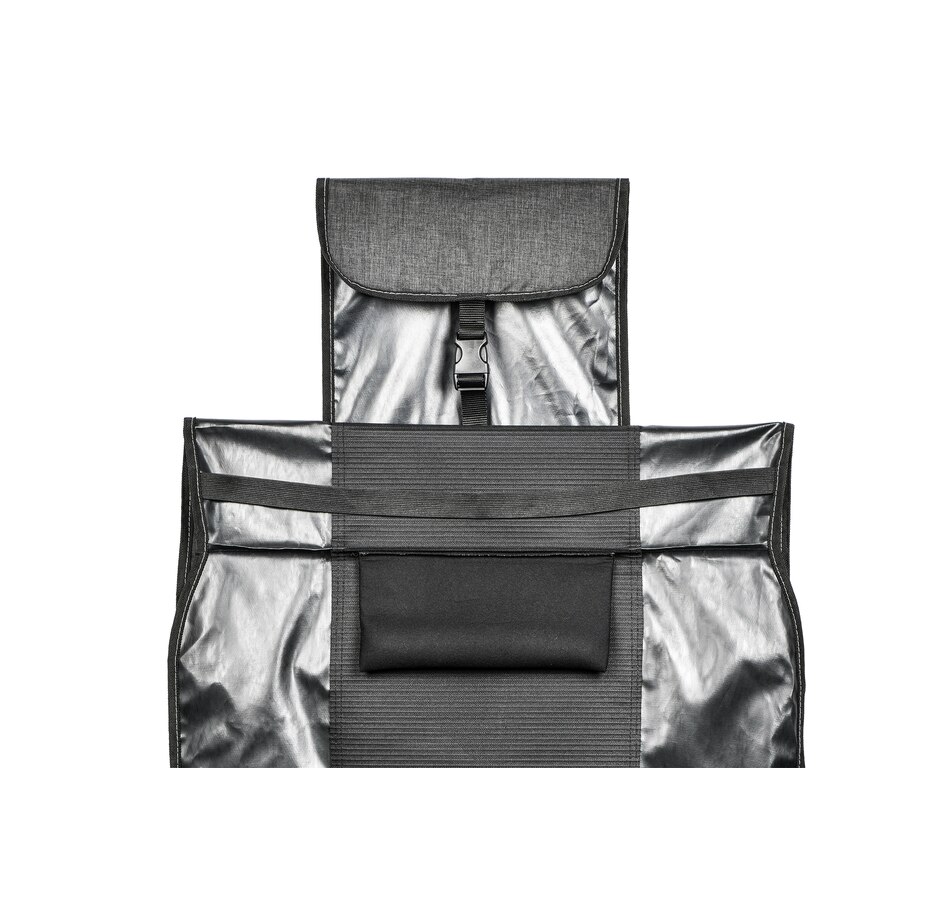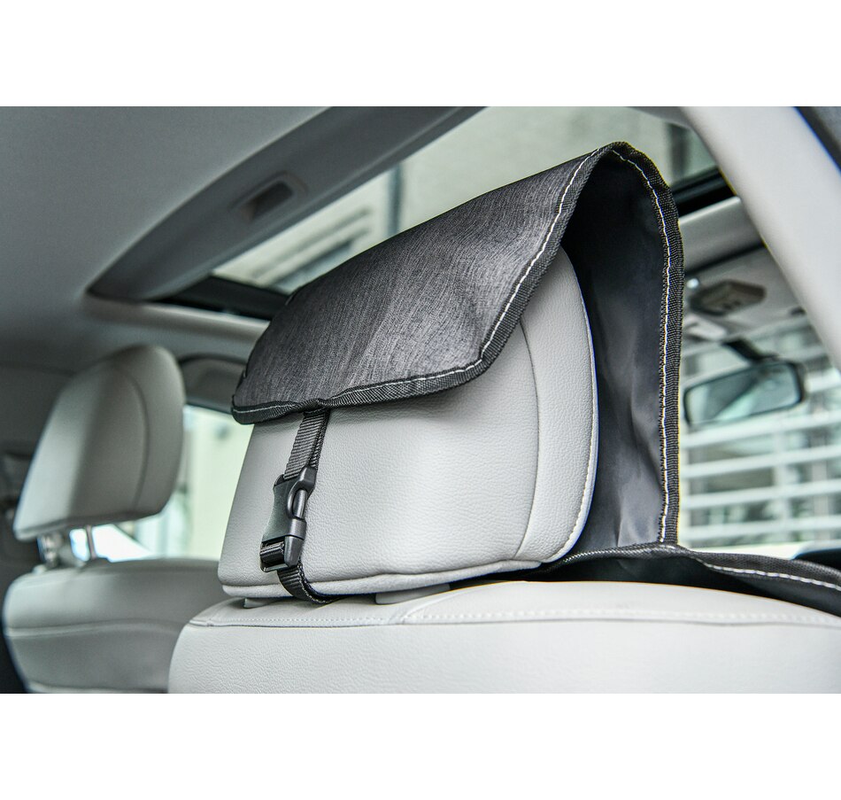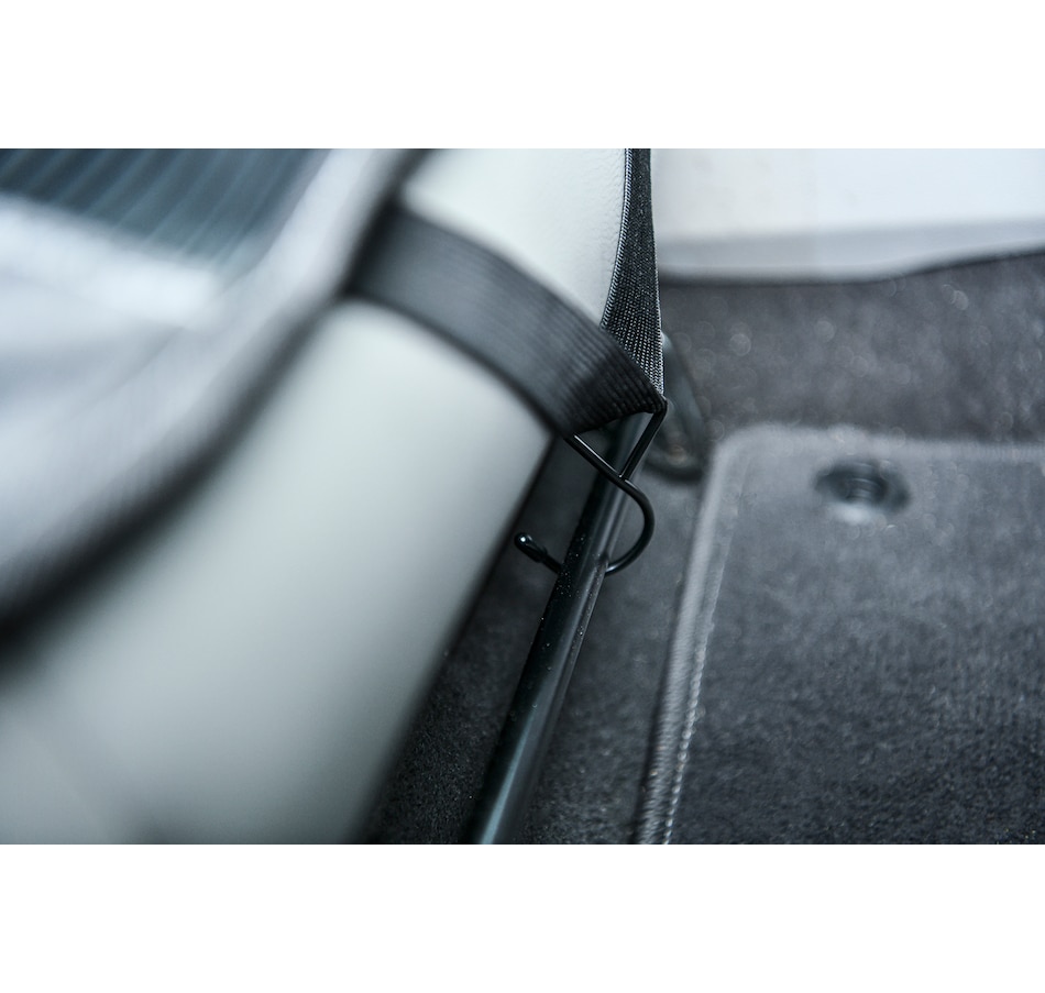 • Simply fasten the ABS plastic buckle and tighten the nylon strap around the headrest. Elastic straps secure the cover around the seat and an under-seat hook keeps the cover taut