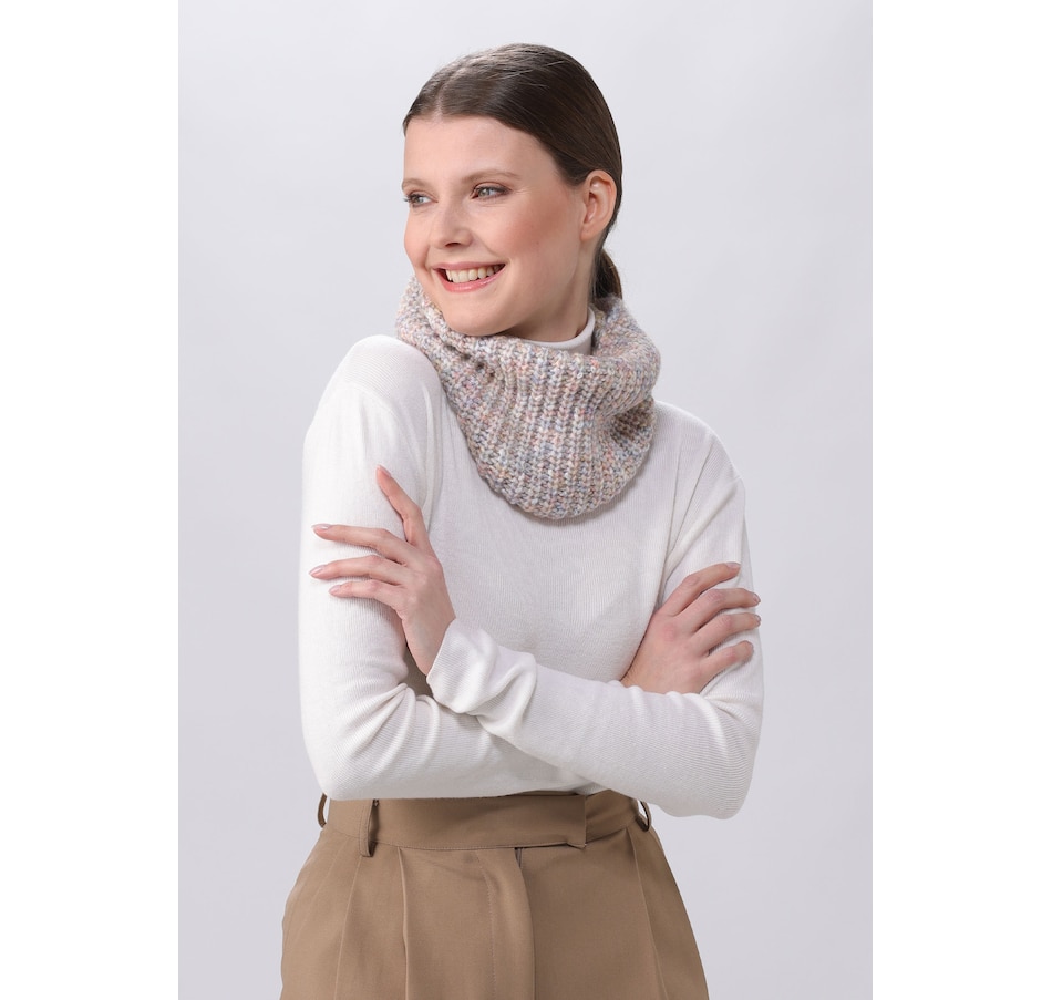 Don't bother DIY knitting this season with this easy to wear neckwarmer loop! This is made of a cozy blended yarn with a touch of wool for warmth, but still super against your skin. The soft heathered colours and classic rib knit shape add a fashionable touch to any winter jacket. This is a great gift idea for any age, and any style.