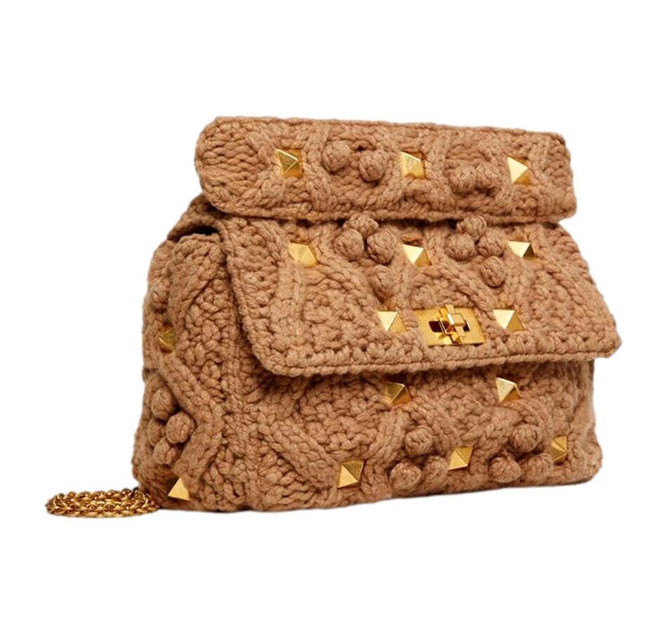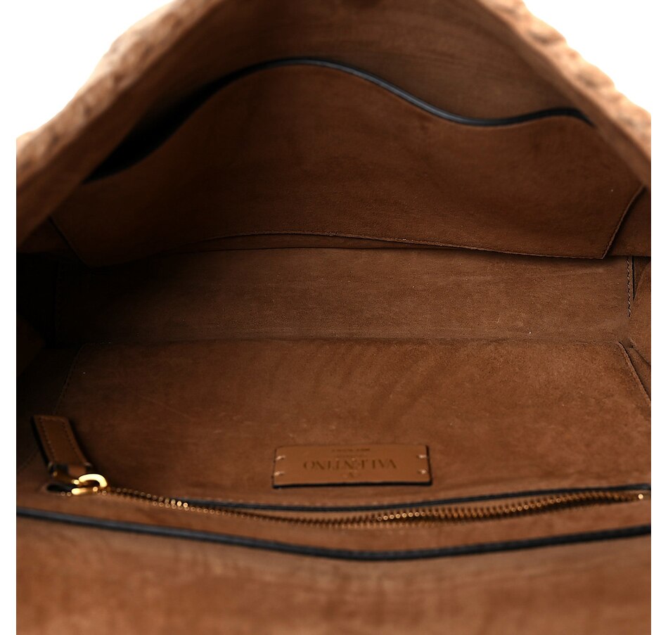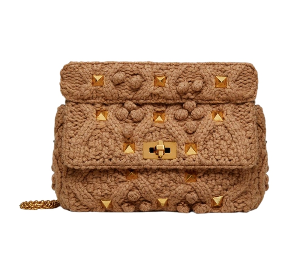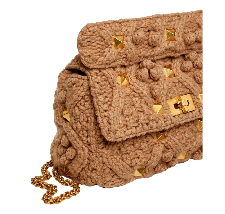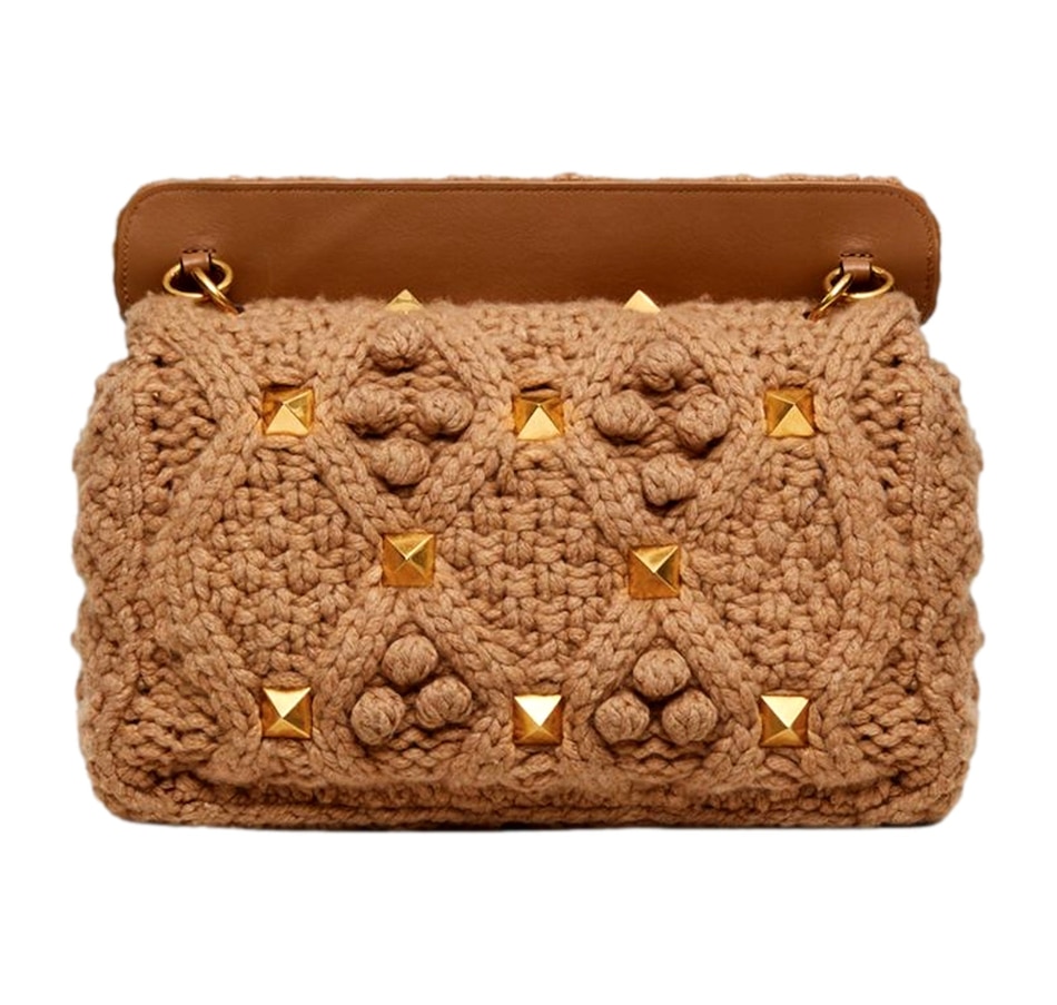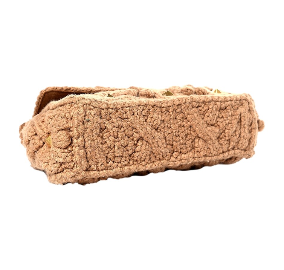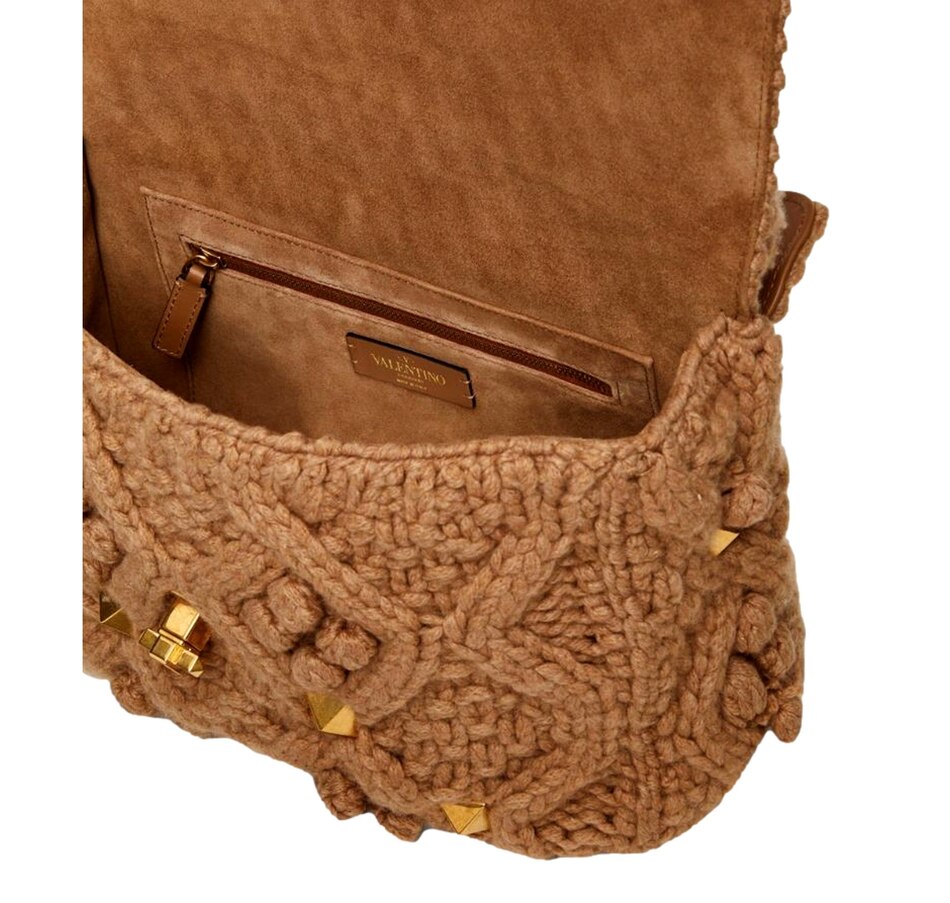 Introducing the Valentino Garavani Roman Stud large shoulder bag, meticulously crafted from brown knitted cashmere. The neutral hue and soft texture paired with the iconic gold Roman Stud detailing exudes an elegant charm. Store your essentials in the spacious suede interior that includes a zipper and slip pocket. Elevate your look with the timeless allure of the brown knit cashmere Roman Stud shoulder bag, only from Valentino Garavani.