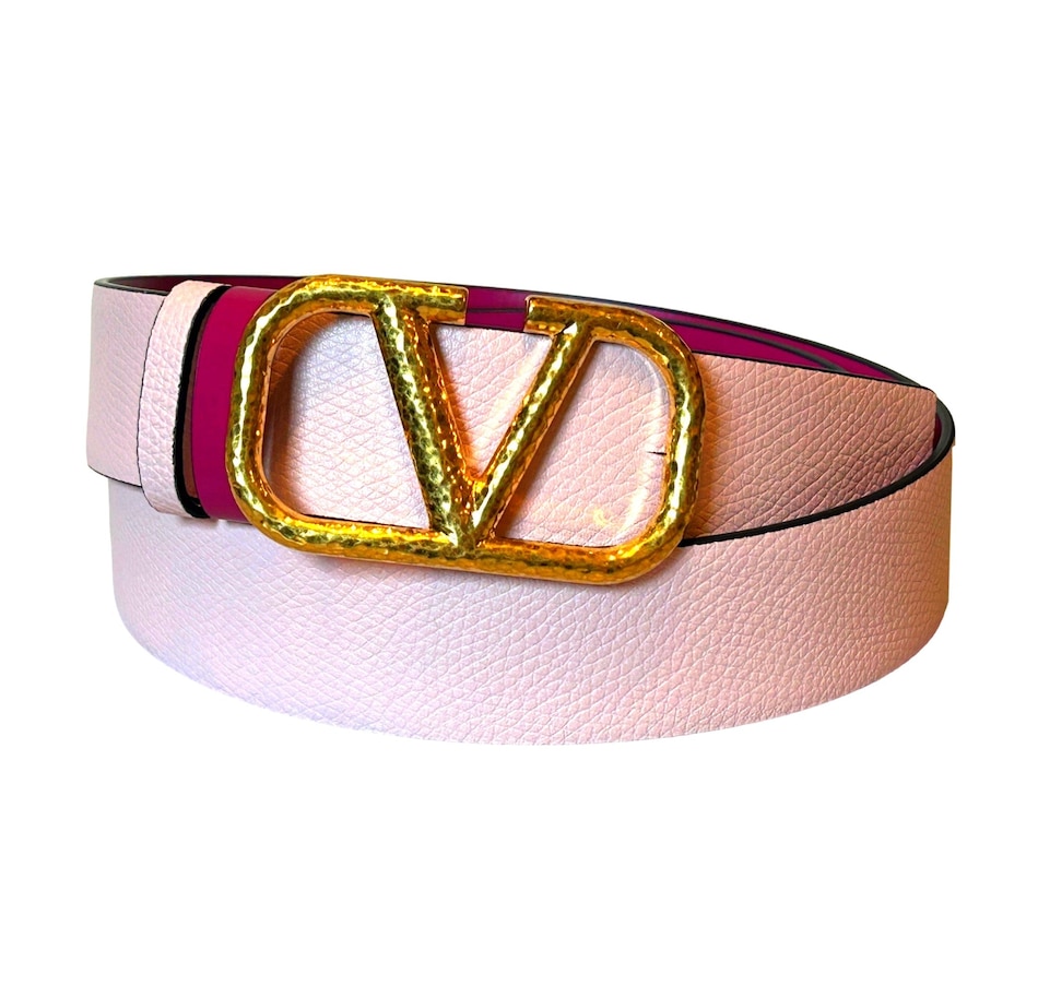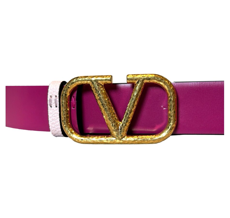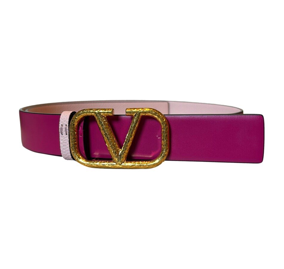 Indulge in the epitome of versatility and luxury with the Valentino Garavani VLogo Reversible Belt in Size 85, crafted from exquisite pink and magenta leather. The iconic textured gold VLogo buckle serves as a striking focal point, adding a touch of glamour to any ensemble. Its reversible design offers versatility, allowing you to effortlessly switch between the soft pink hue and a smooth magenta option, ensuring seamless coordination with a myriad of outfits. Elevate your look with this statement accessory, whether cinching the waist of a flowing dress or adding polish to tailored trousers, embodying the epitome of modern elegance and style.
