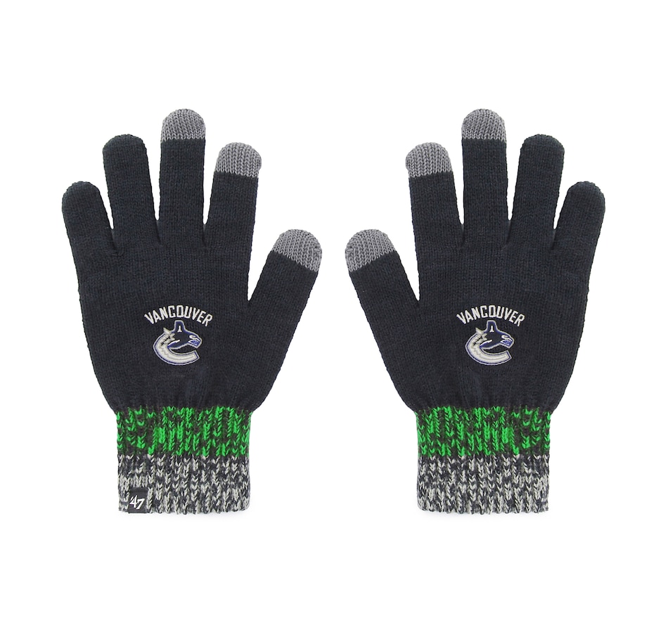 Keep warm with these static gloves from '47. These knit gloves feature the Vancouver Canucks logo embroidered on the back hand, and ribbed wrists to keep the wind out. They measure approximately 10 inches in length.