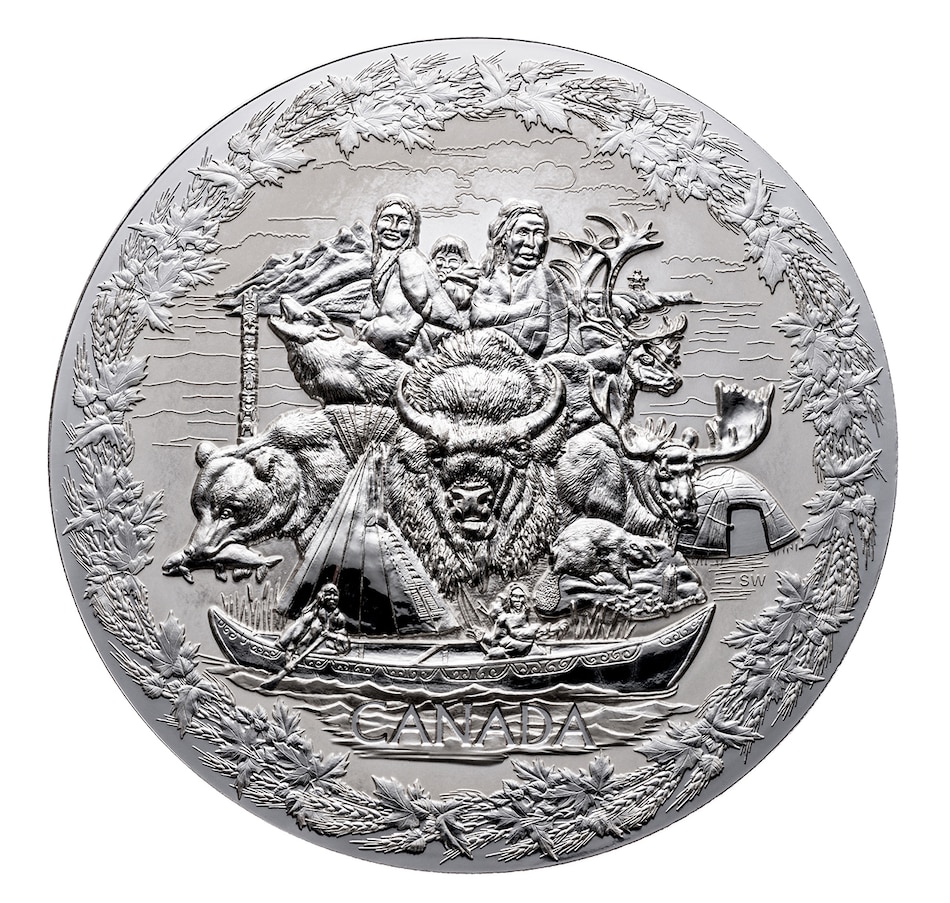 Along with the fine gold kilo coin, these unprecedented coins feature two designs that portray the story of Early Canada (2007) and Towards Confederation (2008); each masterpiece is executed in both of these fine metals. This coin depicts Canada's diverse Native heritage surrounded by a wreath of maple leaves, the internationally renowned symbol of Canada. Only 2,500 fine silver kilo coins will be available worldwide.