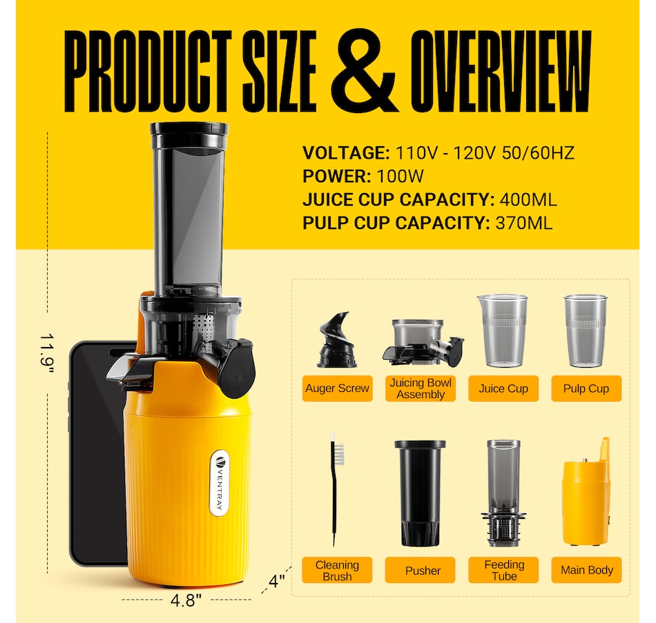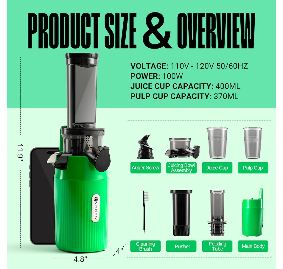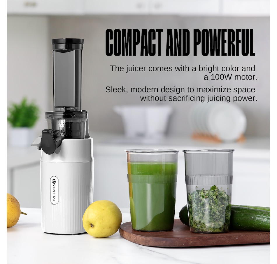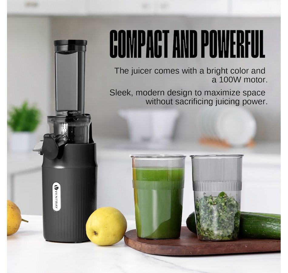 Unlock the full potential of your fruits and vegetables with the Ventray Essential Ginnie Juicer. This compact and space-saving masticating slow juicer operates at a low 60RPM speed, extracting juice with precision to preserve all the essential nutrients and vitamins. It's incredibly easy to assemble and clean, ensuring a hassle-free juicing experience every time. With its nutrient and vitamin-dense output, you can enjoy delicious, healthful juices that energize your body and support your well-being. Plus, the Ginnie Juicer comes in eco-friendly packaging, contributing to a greener planet. Upgrade your juicing game today!