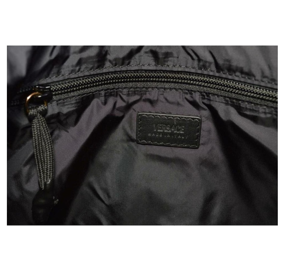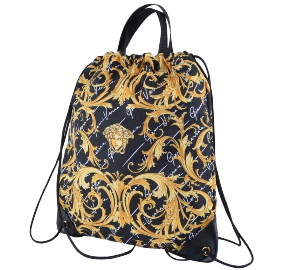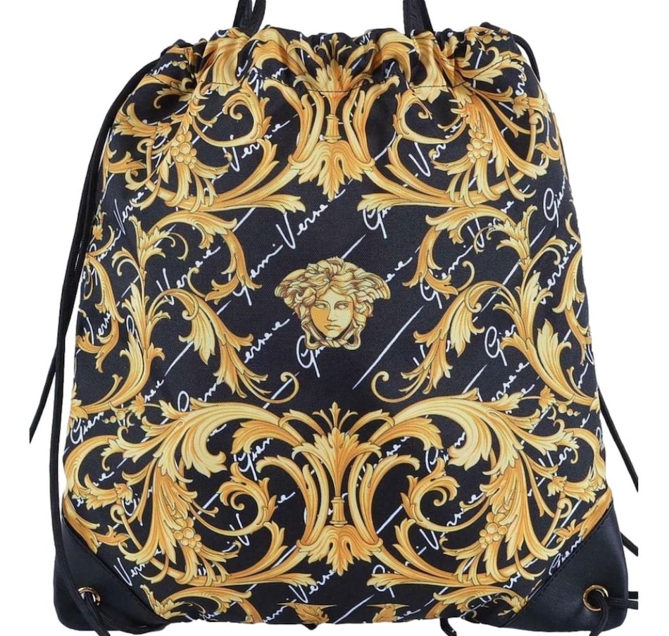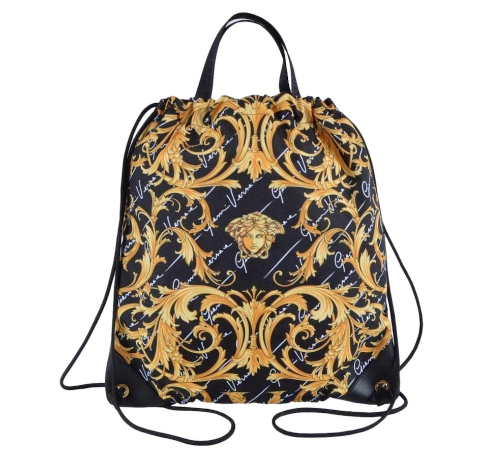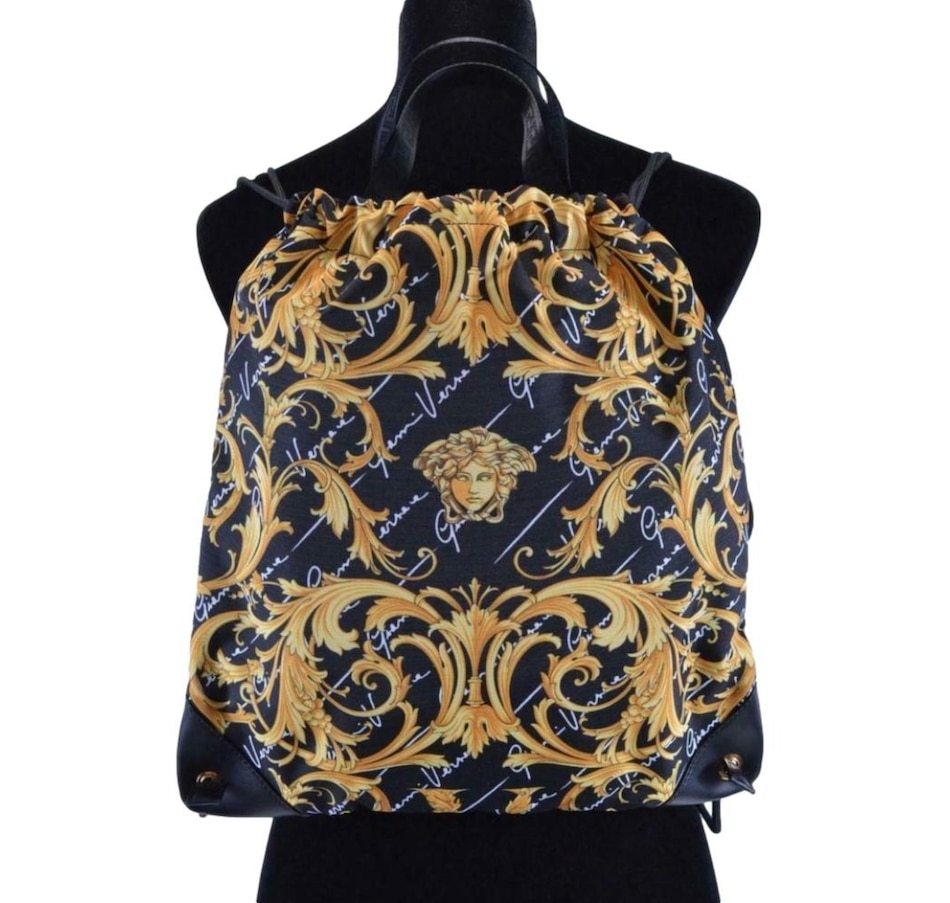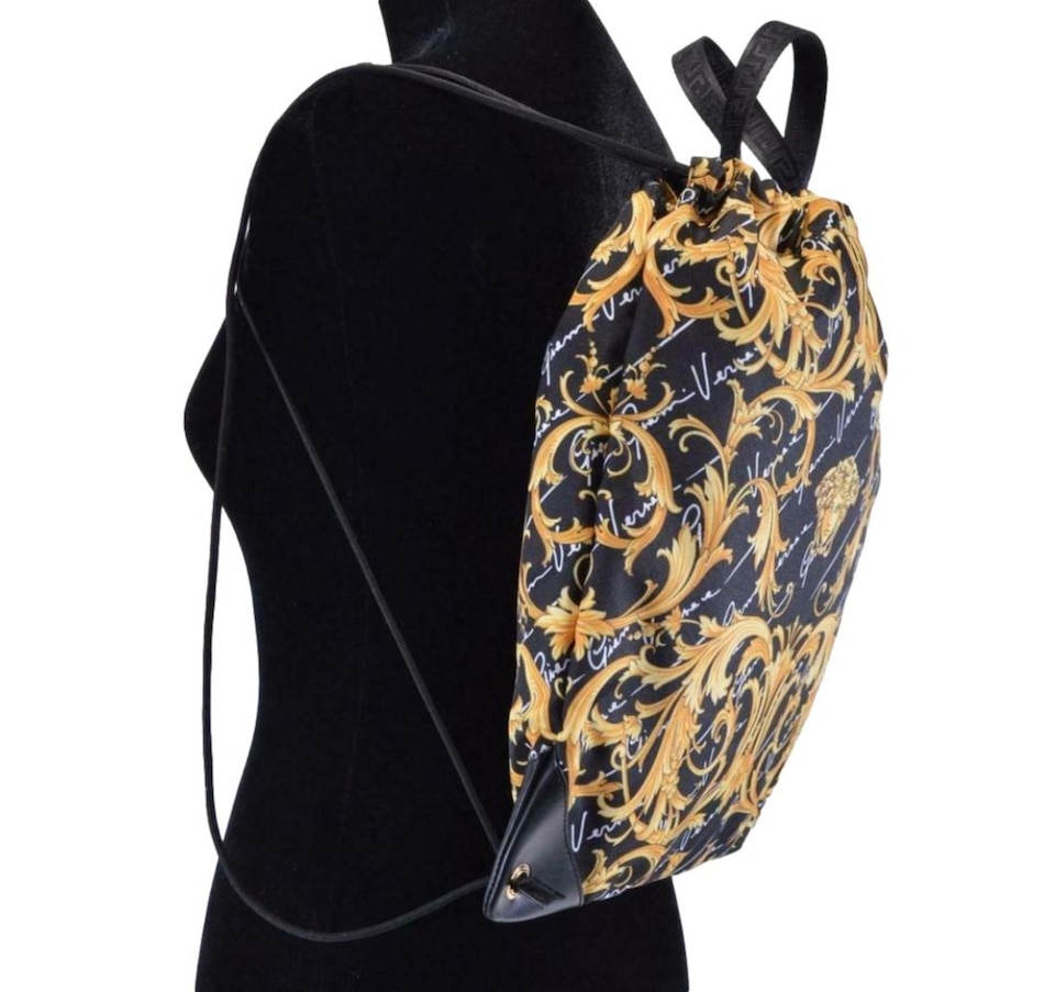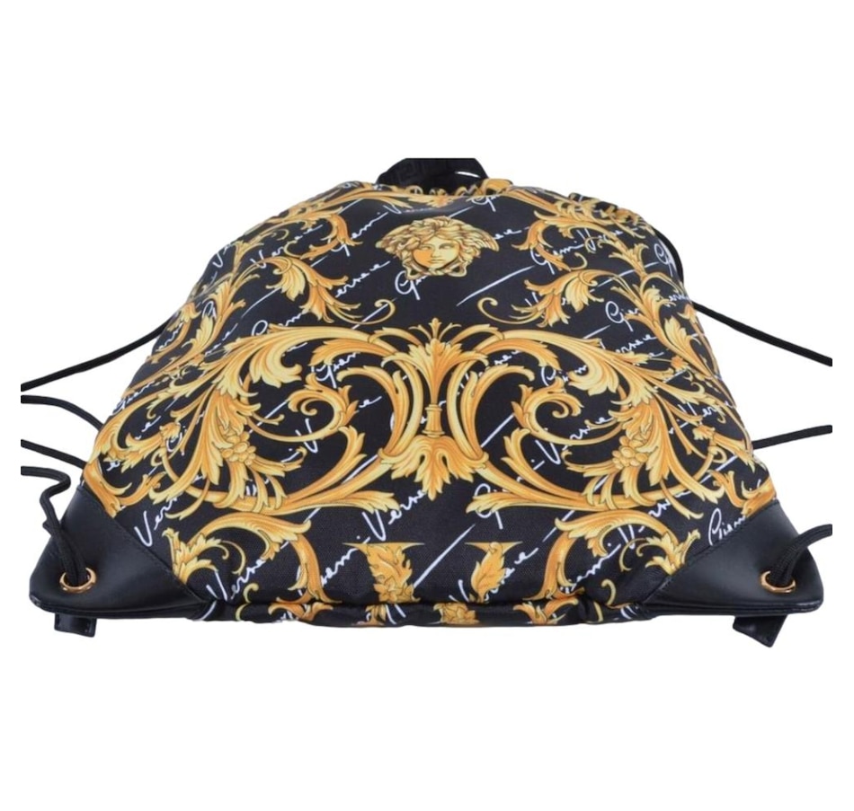 This backpack from Versace is crafted of gold "Baroque" printed black nylon backpack. The drawstring fastening opens to a black nylon interior lining with a zipper pocket. Add stylish flare to any on-the-go look with this highly functional backpack, only from Versace. Model number: 1002893 1A02185 5B00V Black nylon with Baroque pattern print Iconic "La Medusa" head logo Drawstring closure Black nylon interior lining One main compartment One interior zip pocket Double flat top handles, drop: 3.5" Measurements: 14" x 6" x 15" (LWH) Includes Versace dust bag and authenticity cards Made in Italy