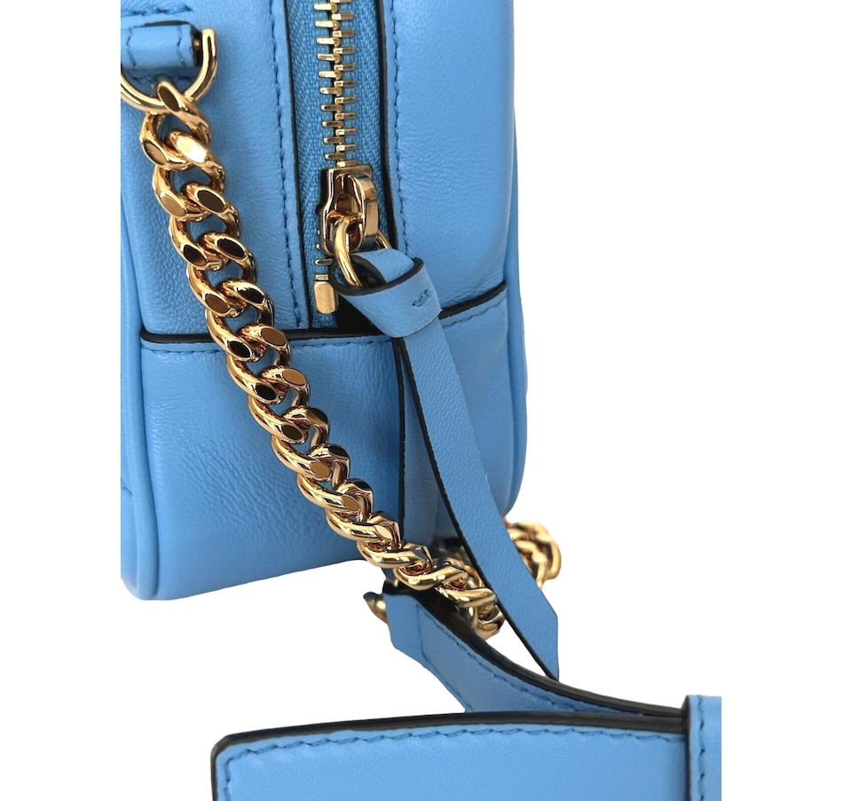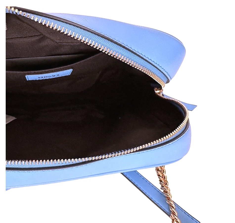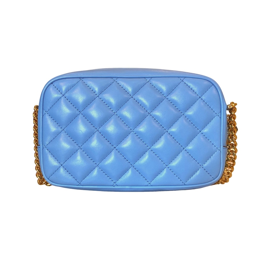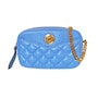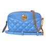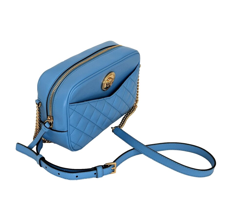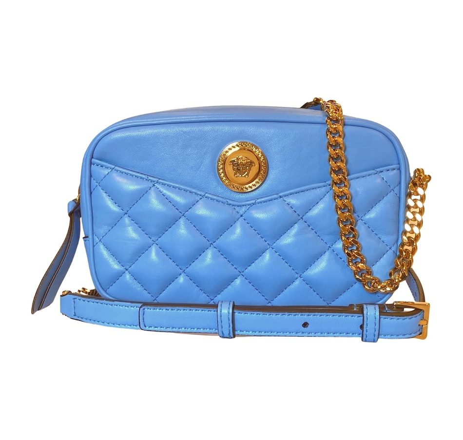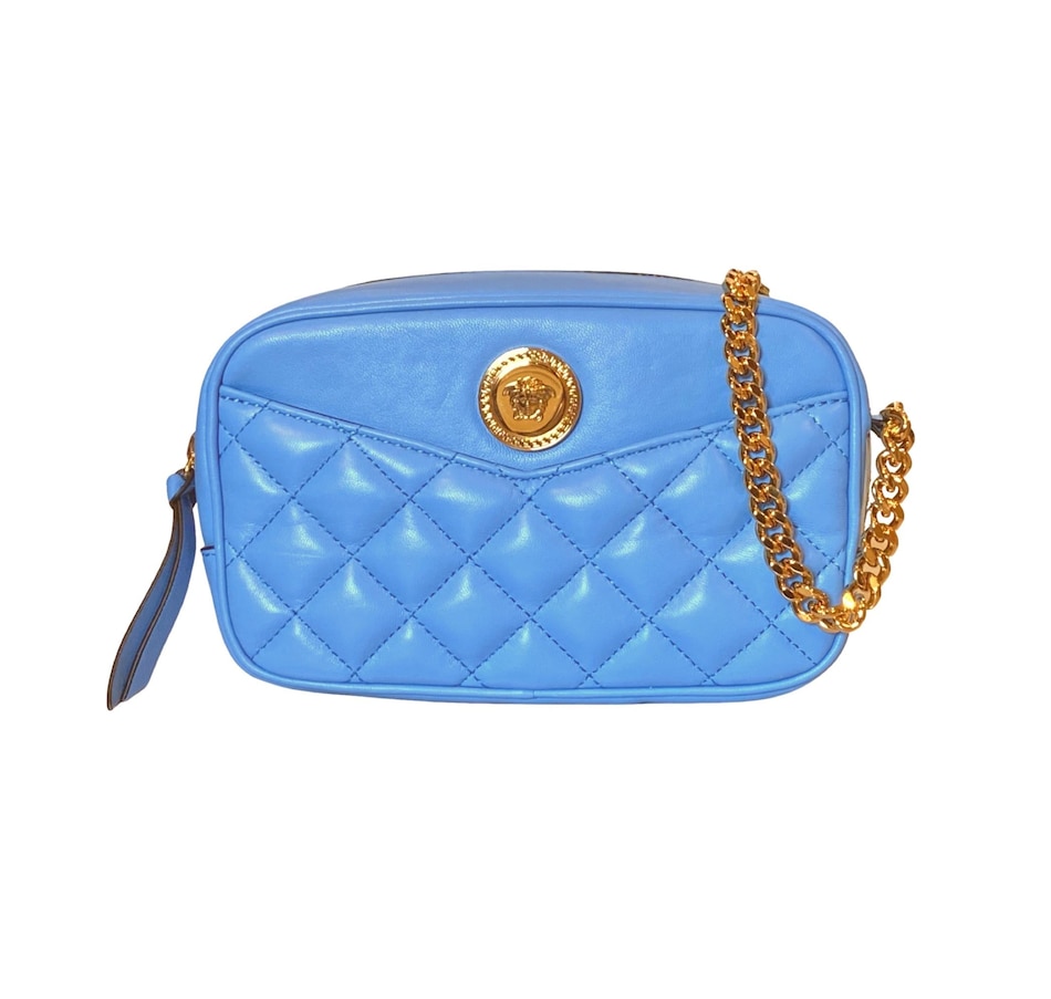 The ultimate luxury crossbody bag from Versace La Medusa collection. The quilted calfskin leather shines in a stunning bright blue color that brings out the gold-tone hardware. The iconic Medusa head plaque is front and center and pops on the blue backdrop. An adjustable chain and leather shoulder strap is the crowning glory to the outside of this La Medusa handbag. Versace continues the attention to detail with a lined interior with single zipper pocket. This is a bright and luxurious addition to any designer handbag collection!