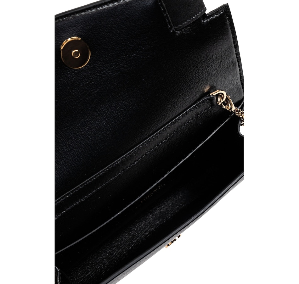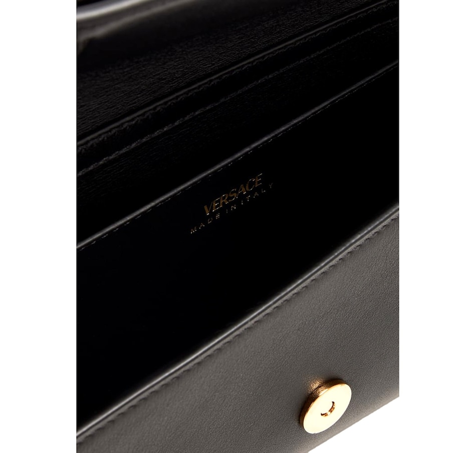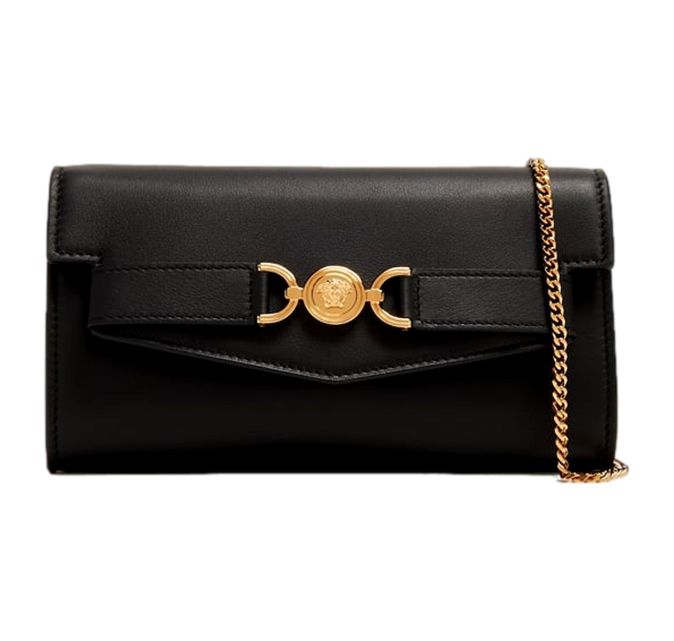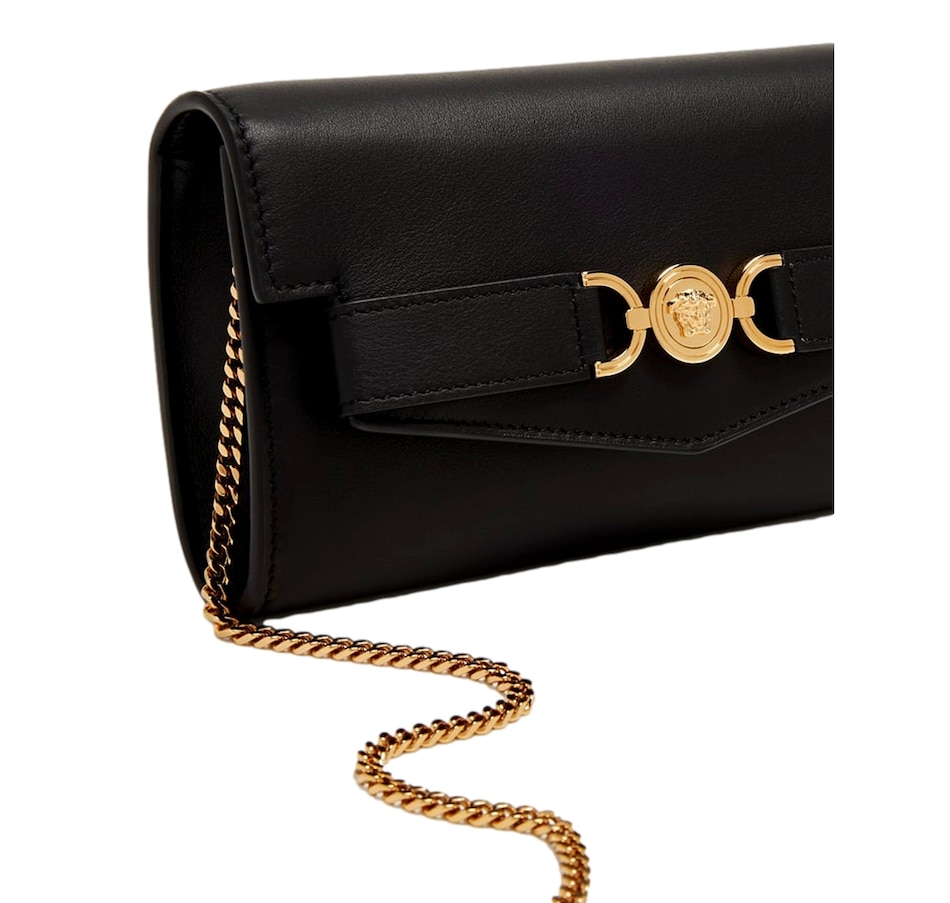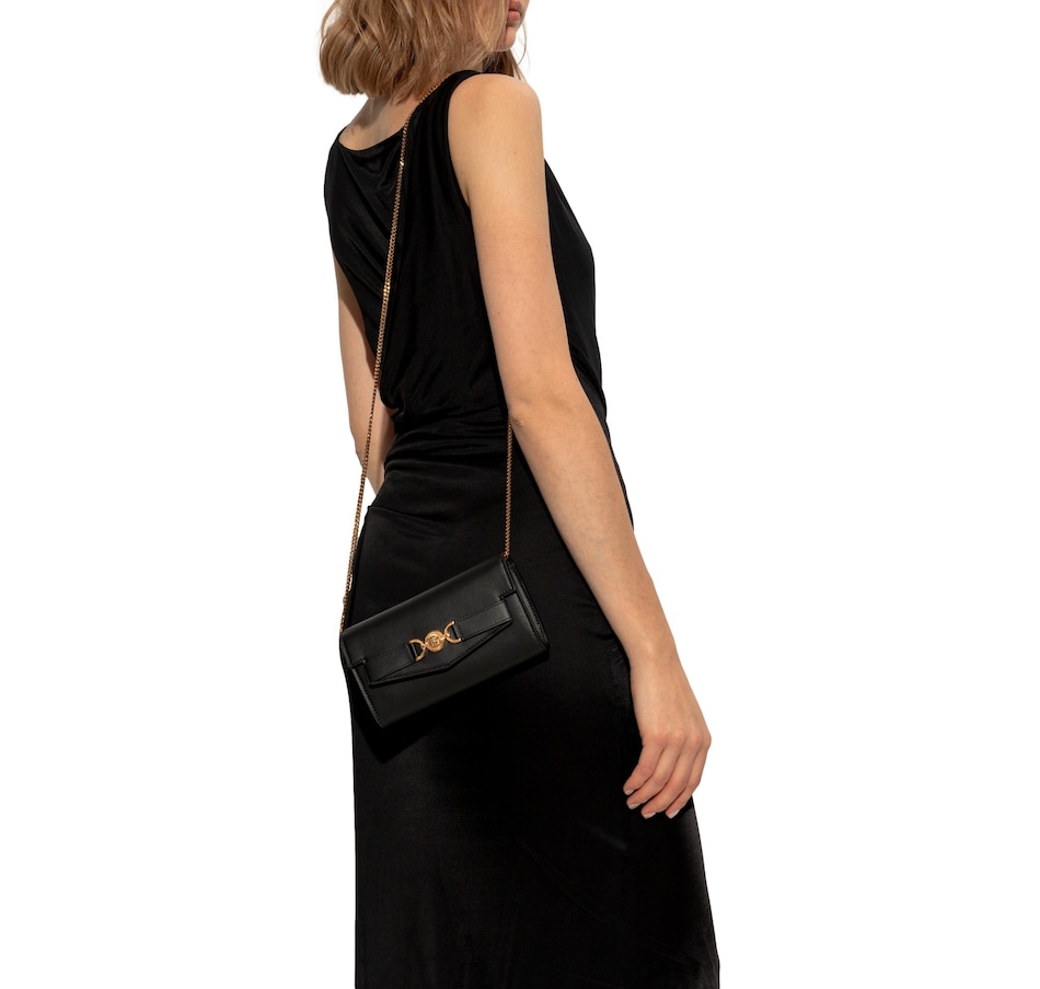 Discover timeless glamour with the Versace Medusa 95 Small Black Wallet on Chain Crossbody Bag. Crafted from smooth premium leather, this compact silhouette is elevated by Versace’s iconic gold-tone Medusa ’95 hardware, bringing a bold touch of heritage luxury. The sleek design opens to a refined, well-organized interior perfect essentials and evening elegance. Finished with a detachable chain strap for effortless day-to-night versatility, this piece is the embodiment of modern opulence and unmistakable Versace allure.