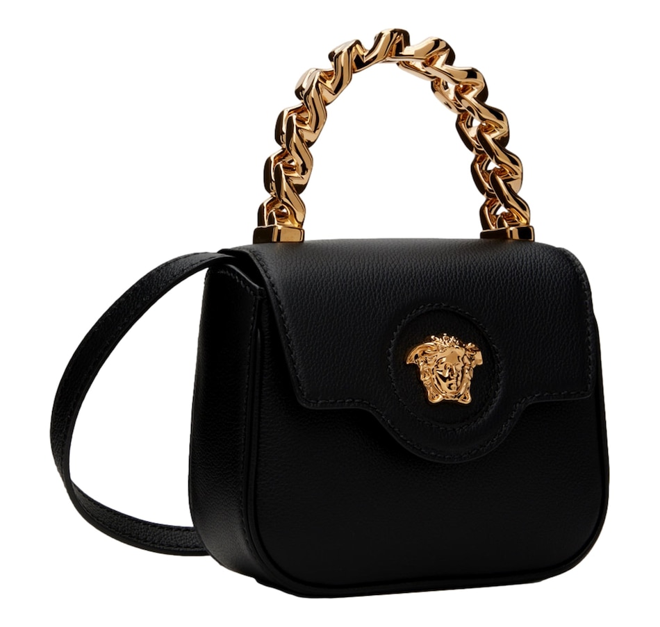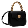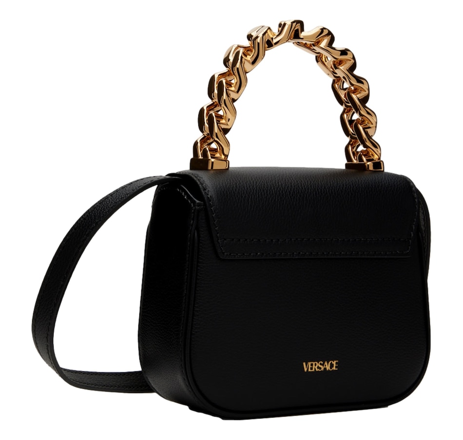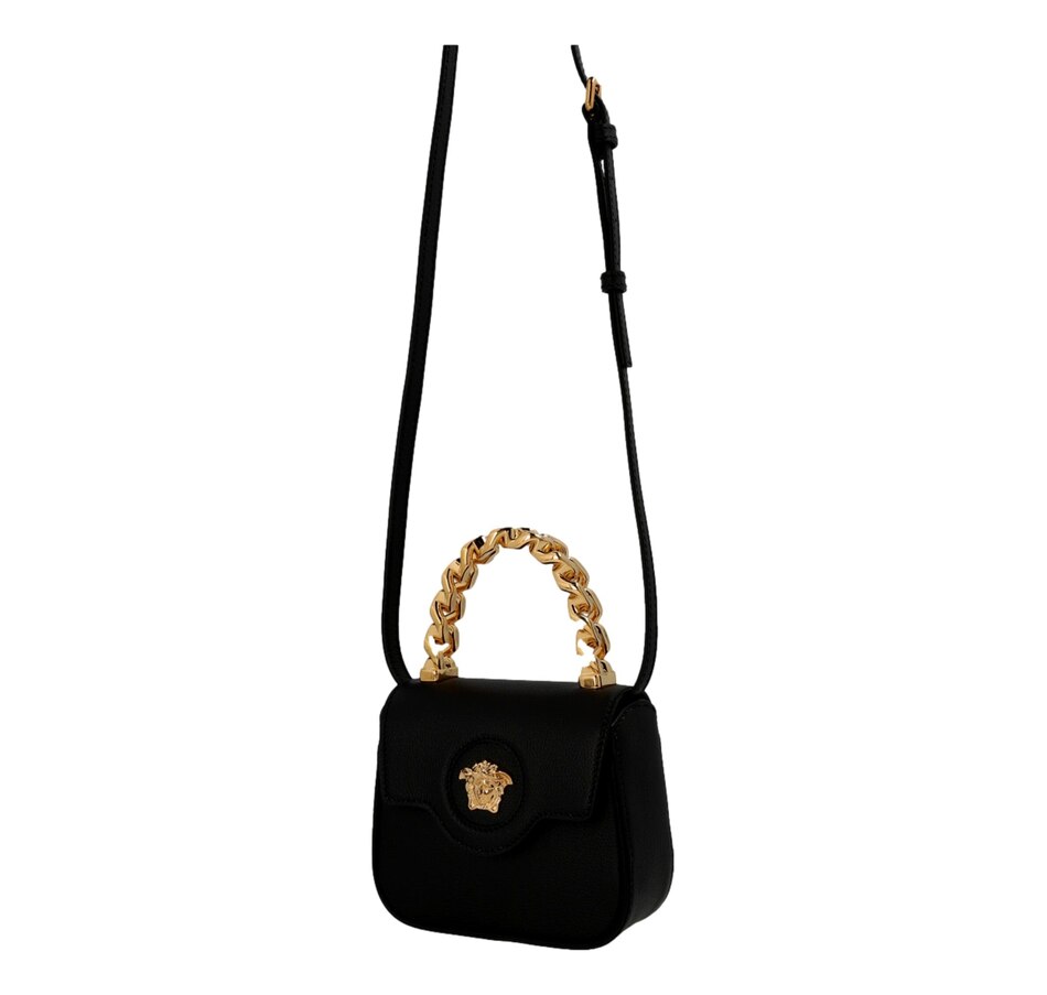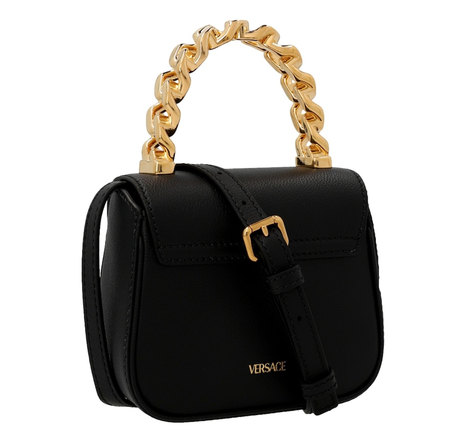 Small in size. Monumental in presence.Black Vitello leather meets the iconic Medusa emblem Versace's most powerful symbol of fearless luxury. The structured top handle and detachable chain strap offer effortless versatility, while the impeccably lined interior keeps essentials perfectly in place.A masterpiece of Italian craftsmanship, worn close and felt everywhere.Fierce. Flawless. Unmistakably Versace. Model: 1003016 Black Leather Exterior Gold Hardware Adjustable Crossbody Strap Gold Top Handle Credit Card Slots Open compartment Dimensions: 6.5 in x 3 in x 6.5 in (LWH) Handle drop: 3 in. Strap drop: 21 in. (adjustable) Made in Italy Includes: Authenticity card and Versace Dustbag