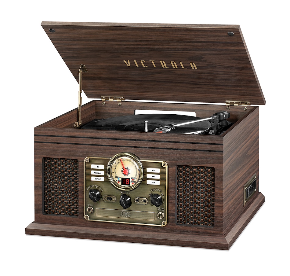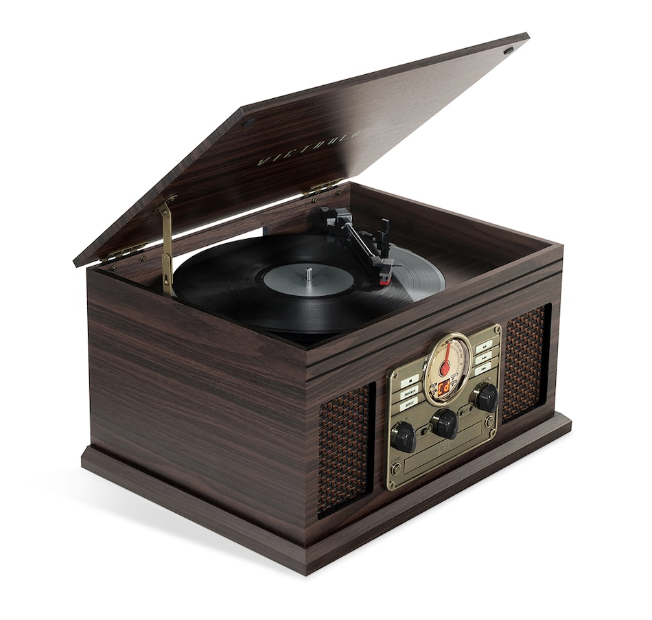The Victrola Classic Bluetooth record player is an all-in-one music powerhouse. The Classic brings vintage style into the modern day, with a nostalgic design and an FM radio with old-school rotary dial. Play all your favourite vinyl records using the three-speed, belt driven turntable, or stream from your smart device using Bluetooth connectivity. The built-in CD and cassette players allow you to rediscover old favourites, while the stereo speakers deliver powerful sound with pristine clarity at any volume. Antique-style faceplate and smart, wood details make the Classic a perfect fit in any listening space, so you can make lifelong music memories with the tunes you love the most.