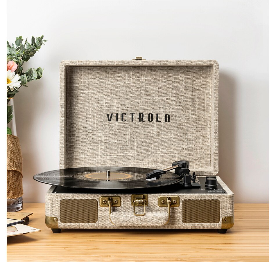 The Victrola Journey  Signature Bluetooth record player combines classic design with loads of new features! Vinyl Stream technology allows you to stream your favourite vinyl records to any external Bluetooth speaker, or music from a smart device through the built-in stereo speakers, making your listening experience truly your own. The three-speed turntable plays all 33 1/3, 45, and 78 RPM records, or plug in your favourite pair of headphones to make it your own. The Journey is equipped with an easy-carry handle, and its portable design means you can take your tunes on the go, for lasting music memories wherever you may be.