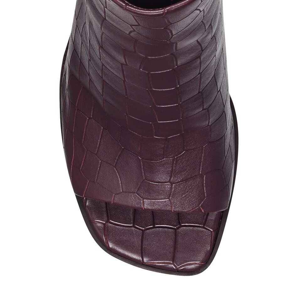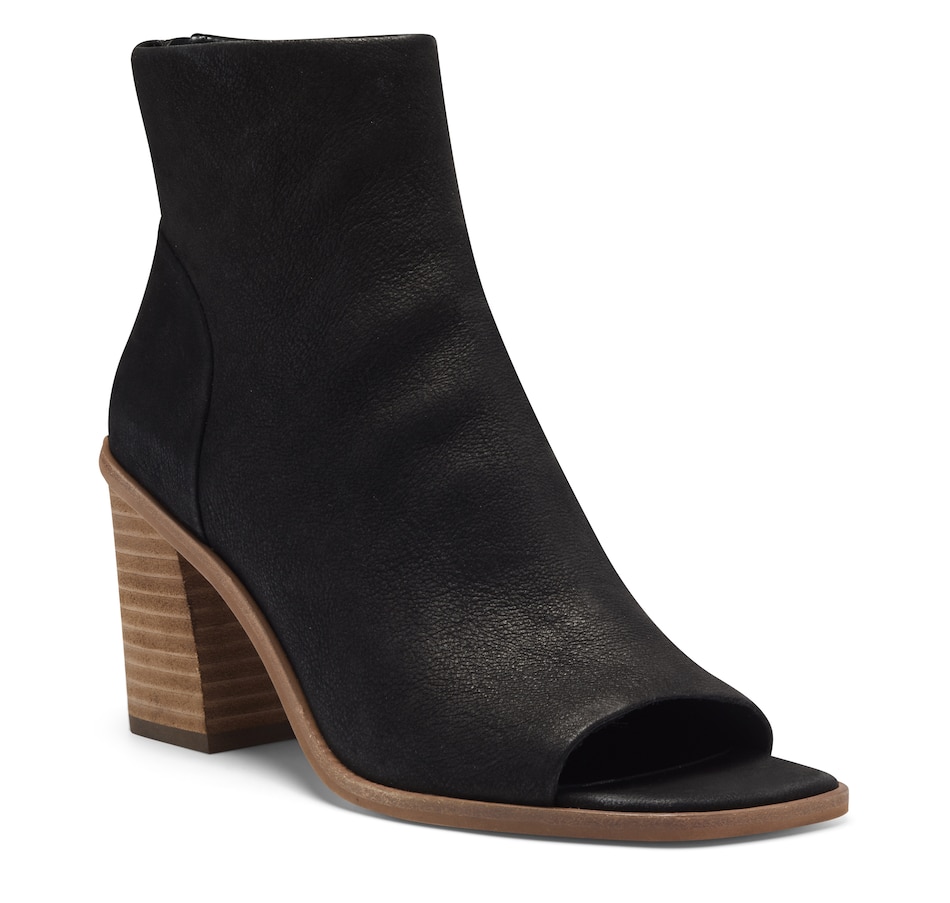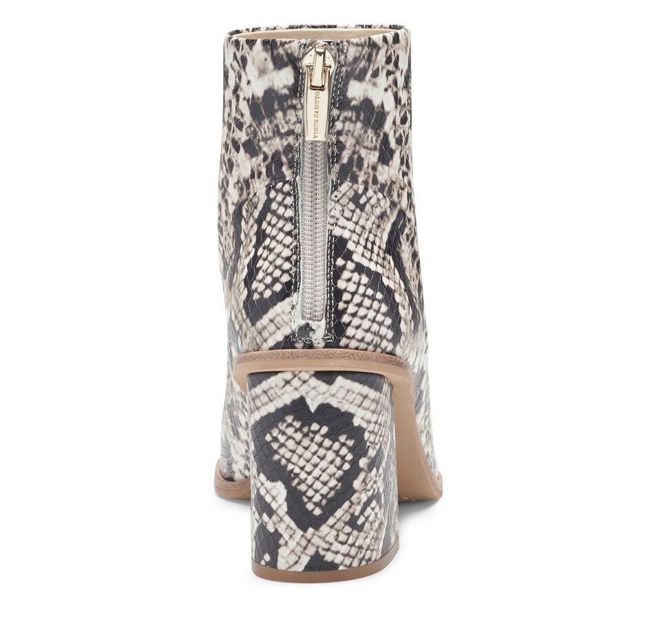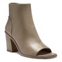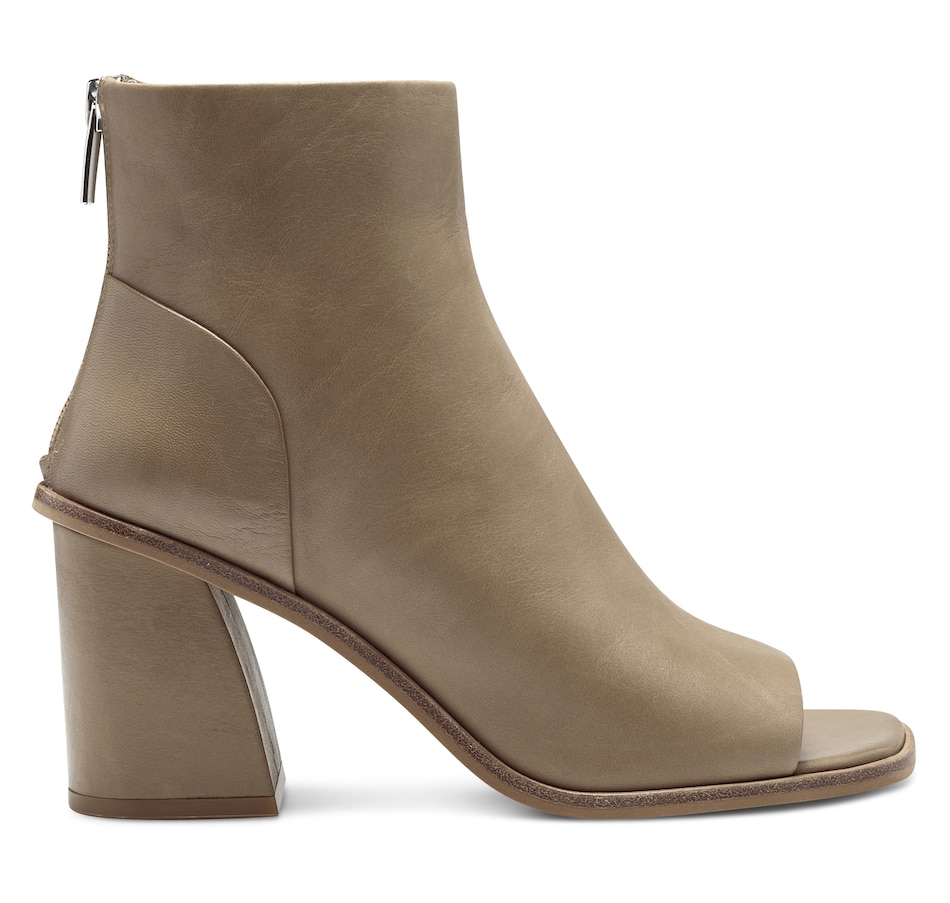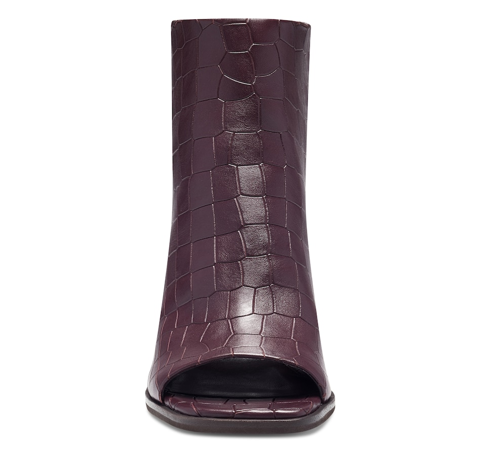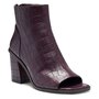 Crafted of smooth leather or embossed animal print, this clean-lined ankle boot is cut with a sexy peep toe and is set on a covered architectural heel. Choose from four pretty colors and prints to wear with distressed denim, simple sheaths and jeans skirts.