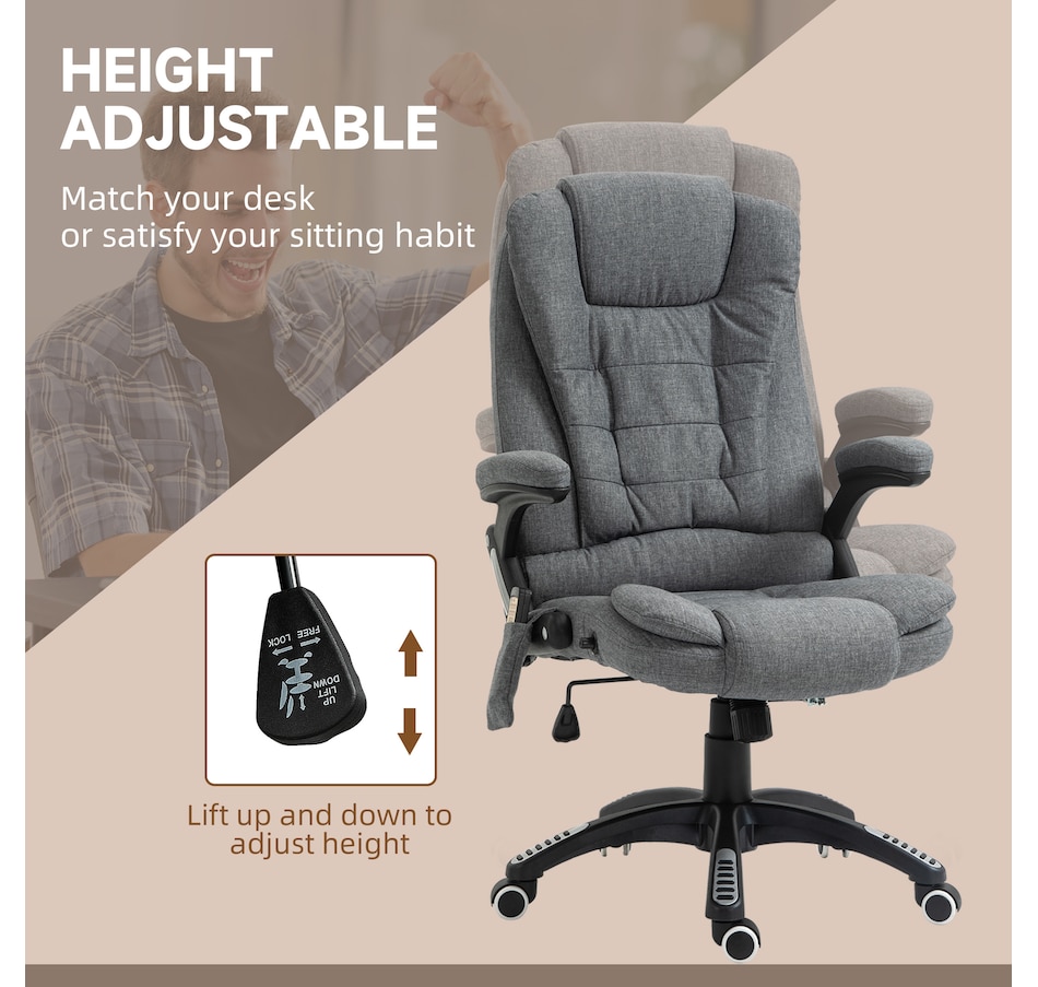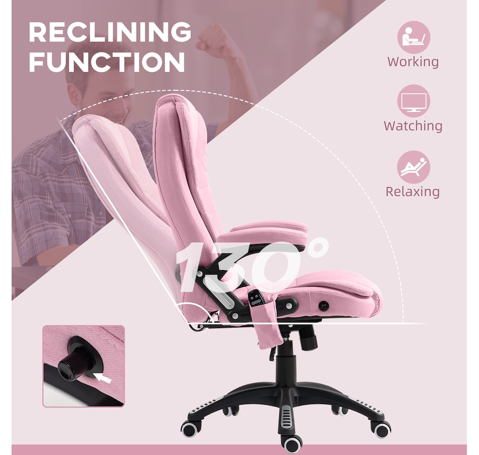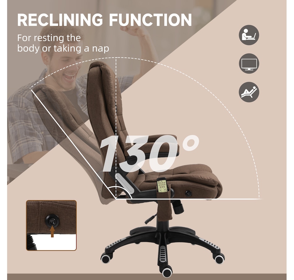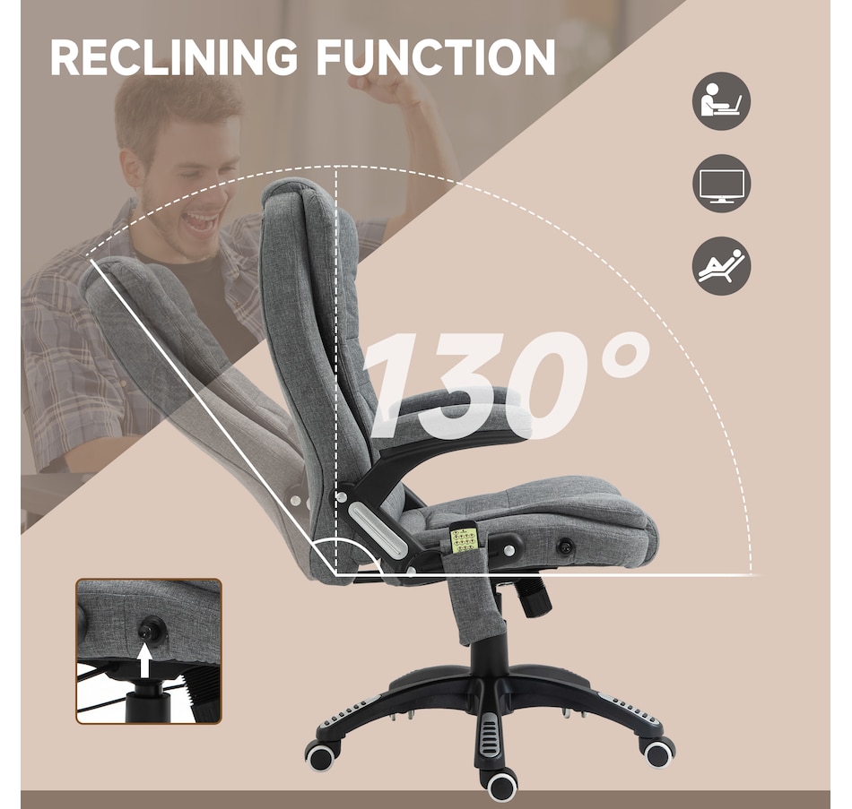 Sit back and relax after a long day. Our massage office chair gives you a relaxing and thorough massage. There are 6 massage points in total, 2 on the shoulders, 2 on lumbar, and 2 on lower back. 130 Degree reclining and adjustable seat height. Customize your favourite angle and height. The curved design will ensure your maximum comfort experience. We use quality linen-look fabrics to provide breathable comfort, and thick sponges.