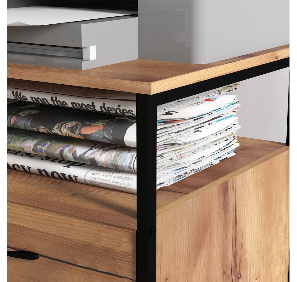 - Tabletop can hold printers, scanners or display person items, open shelf stores your office supplies