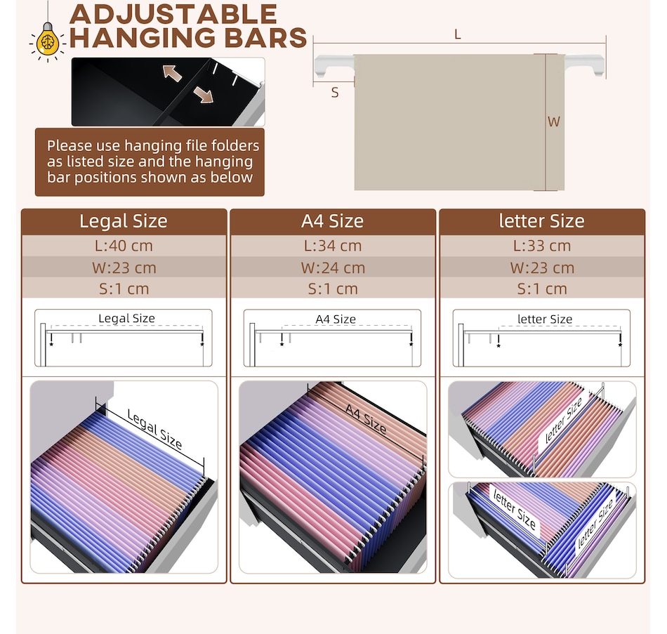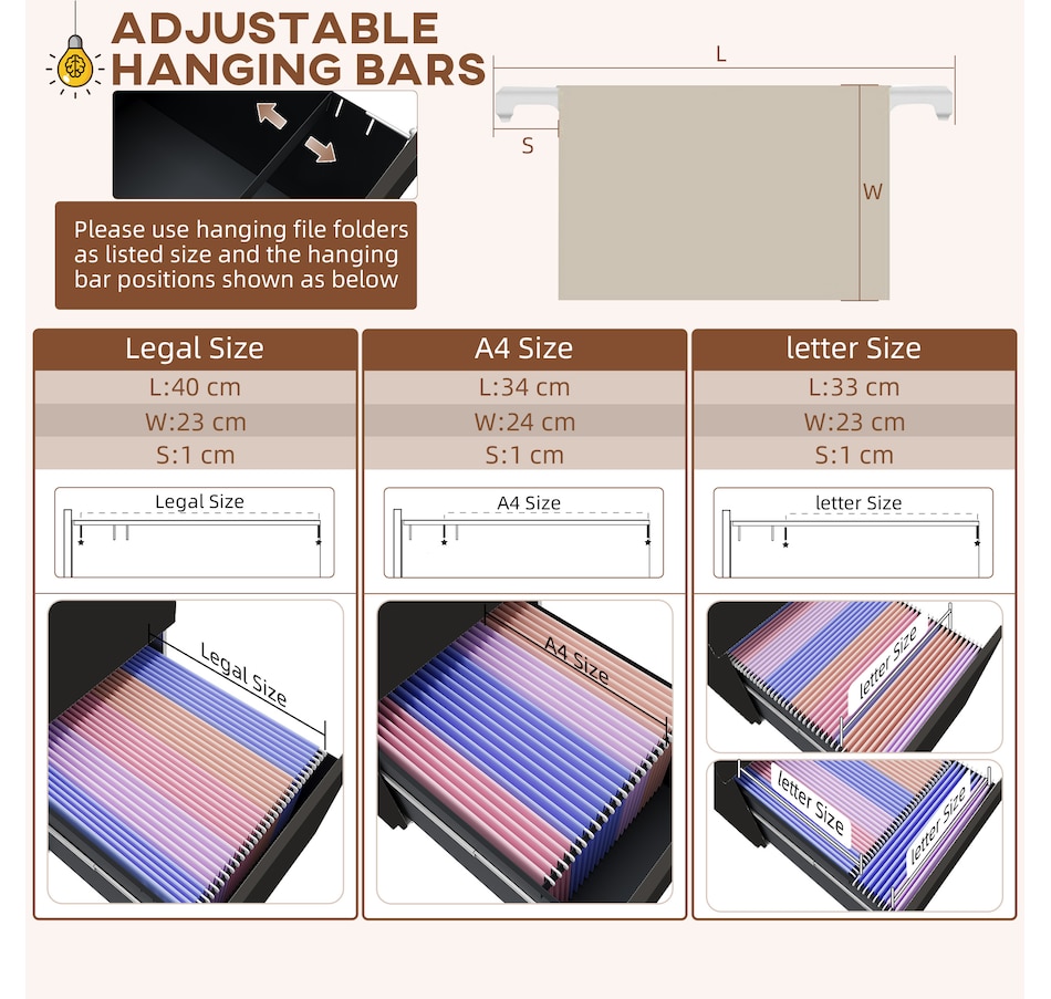 ● Adjustable hanging bar to hold letter, A4 and legal sized files;