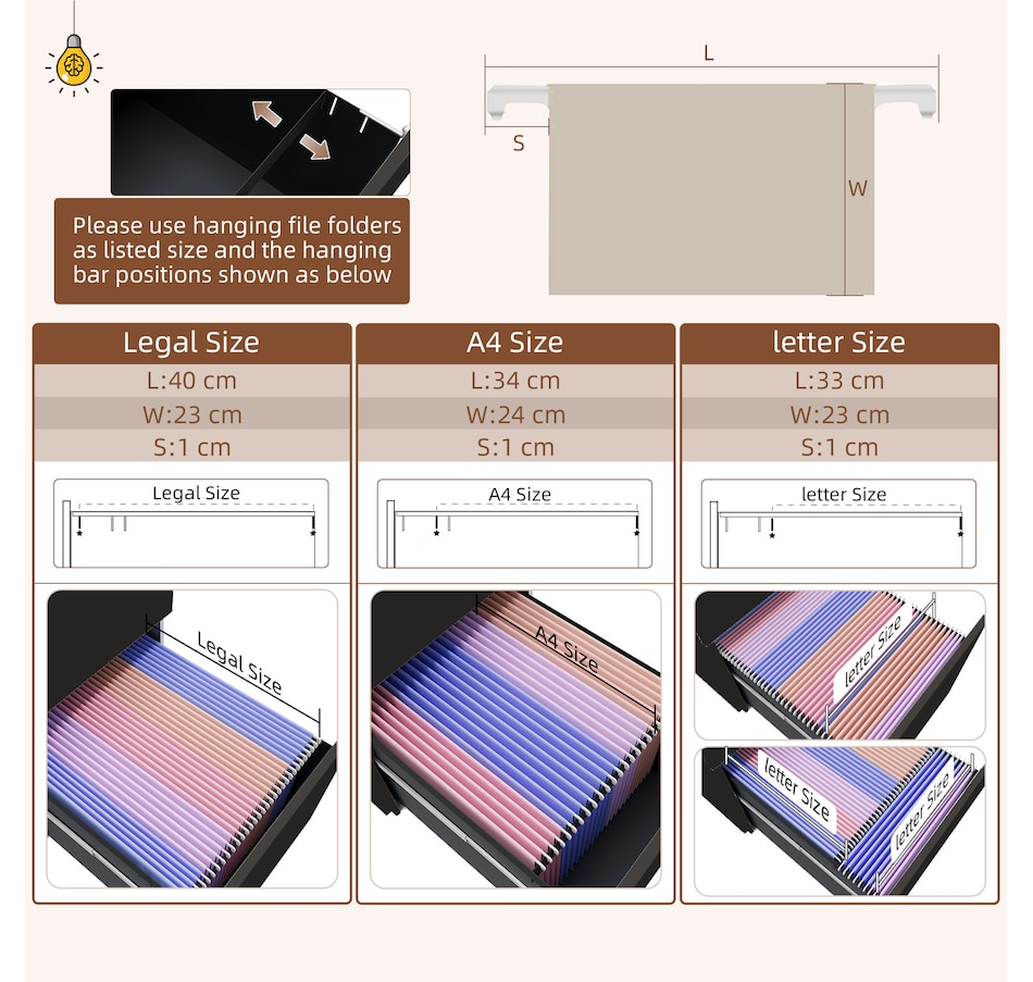 ● Adjustable hanging bar to hold letter, A4 and legal sized files;