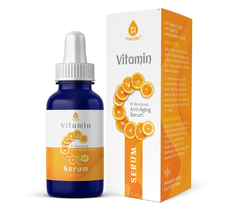 The Pursonic Vitamin C Serum, Vitamin C 20% is a high potency and concentrations serum for use on facial areas. In addition to its powerful anti-aging properties, customers have reported that this proprietary facial serum has helped to shrink pores, clear up acne, prevent breakouts, and minimize the appearance of acne scars – leaving skin proudly radiating a healthier appearance that glows. Features:Achieve healthier, glowing skin with this Pursonic Vitamin C Serum. The antioxidant properties of vitamin C offer anti-aging benefits, promote damage repair and even your skin tone. With a 20% vitamin C concentration, this serum is highly potent for reliable results.To assist in preventing premature aging, Pursonic Vitamin C Serum helps reduce the effects of free radicals, including UV damage from the sun. Vitamin C also assists with collagen growth for improved skin elasticity and brightens dark spots for an enhanced glow.This Pursonic Vitamin C Serum comes in a 3-oz. applicator bottle for portability and ease of use. Simply apply a small amount, and use your fingertips to gently massage your face in a circular motion until the serum is fully distributed and absorbedModel Number: VCS3