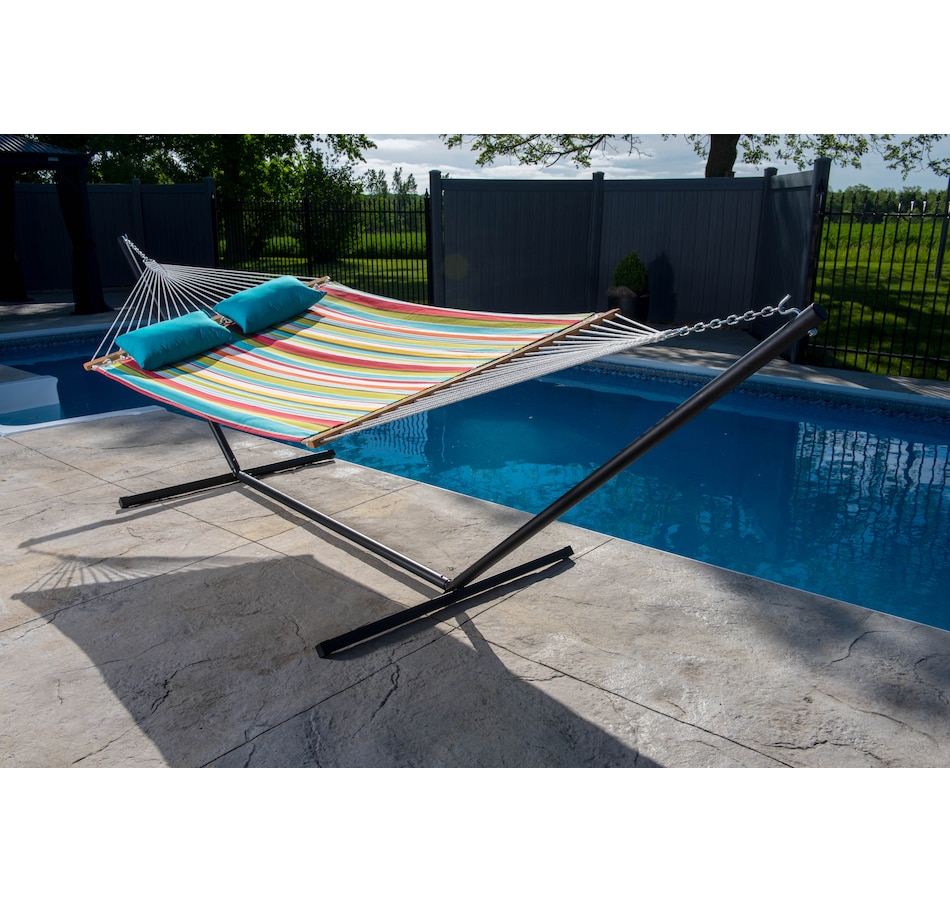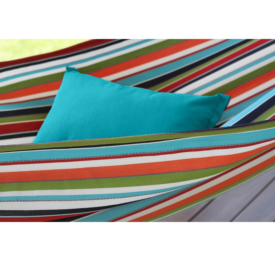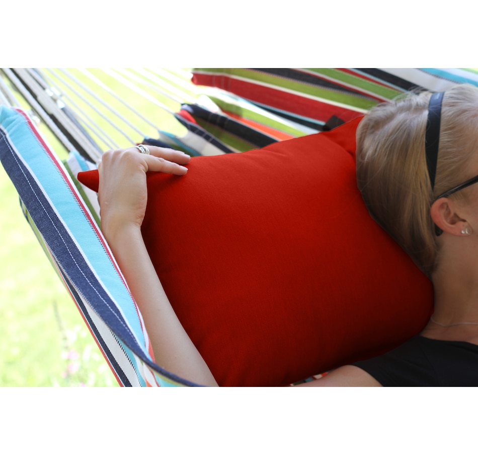 This spun polyester pillow is destined to be an all-time favourite. With its highly fade-resistant fabric and plump 14" x 20" size, you can be sure to slumber peacefully in your hammock. This pillow fits Vivere's Brazilian-style hammocks with ease, and up to two pillows can be placed on any of the Vivere double spreader bar hammocks. Create a colourful, kaleidoscopic effect with a collection of these chromatic cushions!
